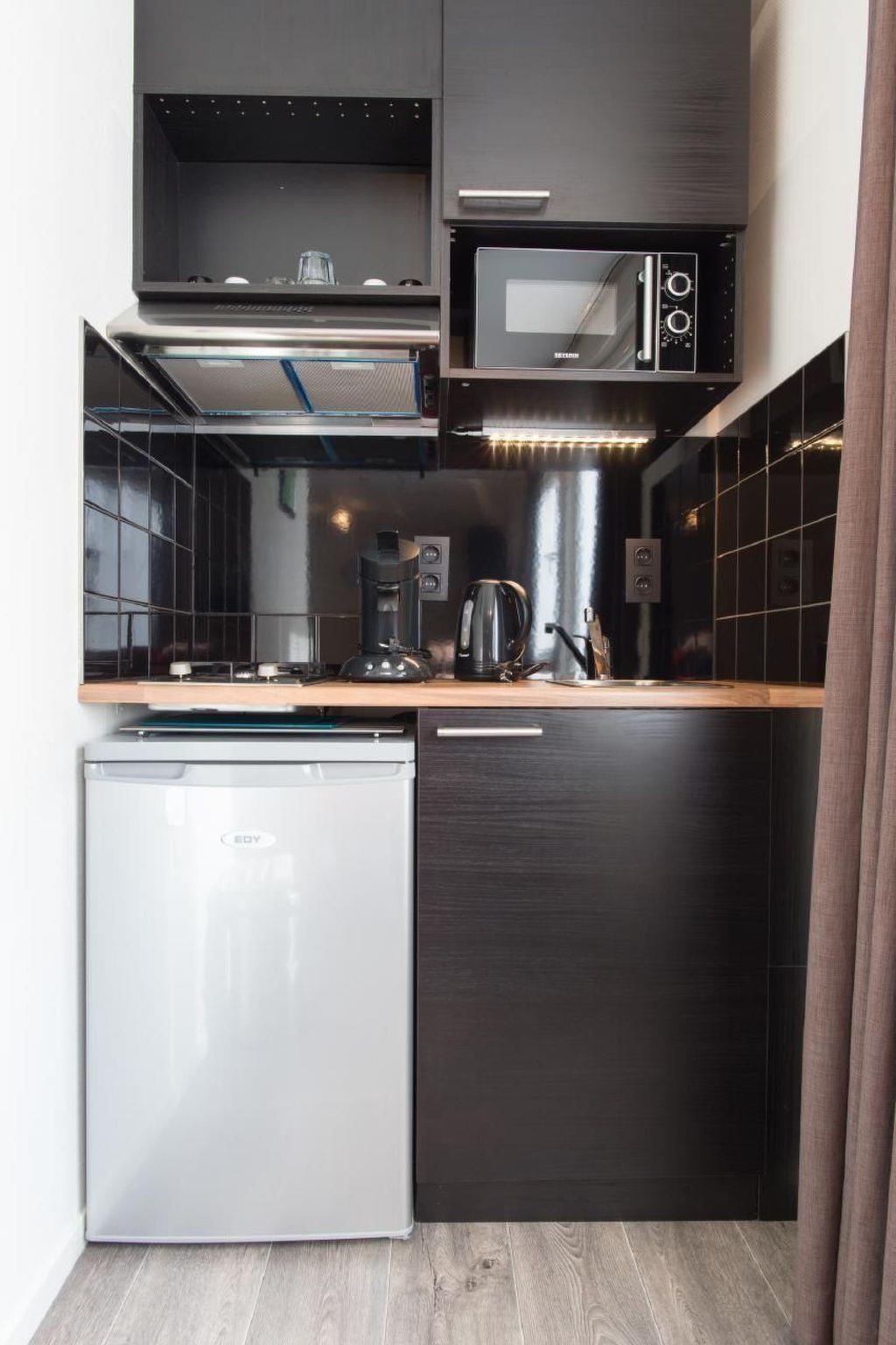 - kitchenette with microwave, kettle, refrigerator and coffee machine or Senseo. Small cooking facilities for 2 pans