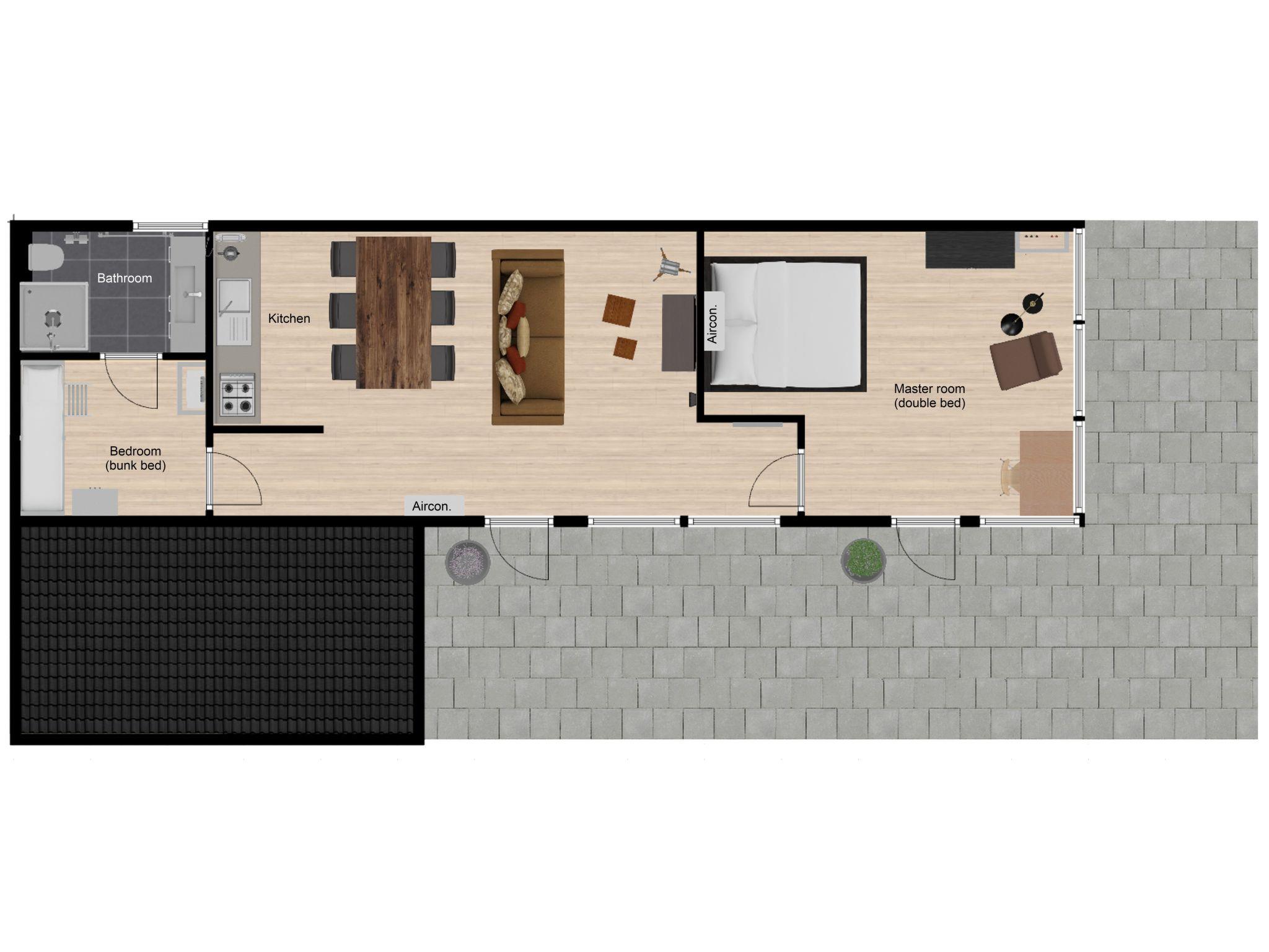 Large master bedroom with a desk and wardrobe and there is a small bedroom with bunk bed. Modern bathroom with shower. Private TV, Music System and WiFi connection.