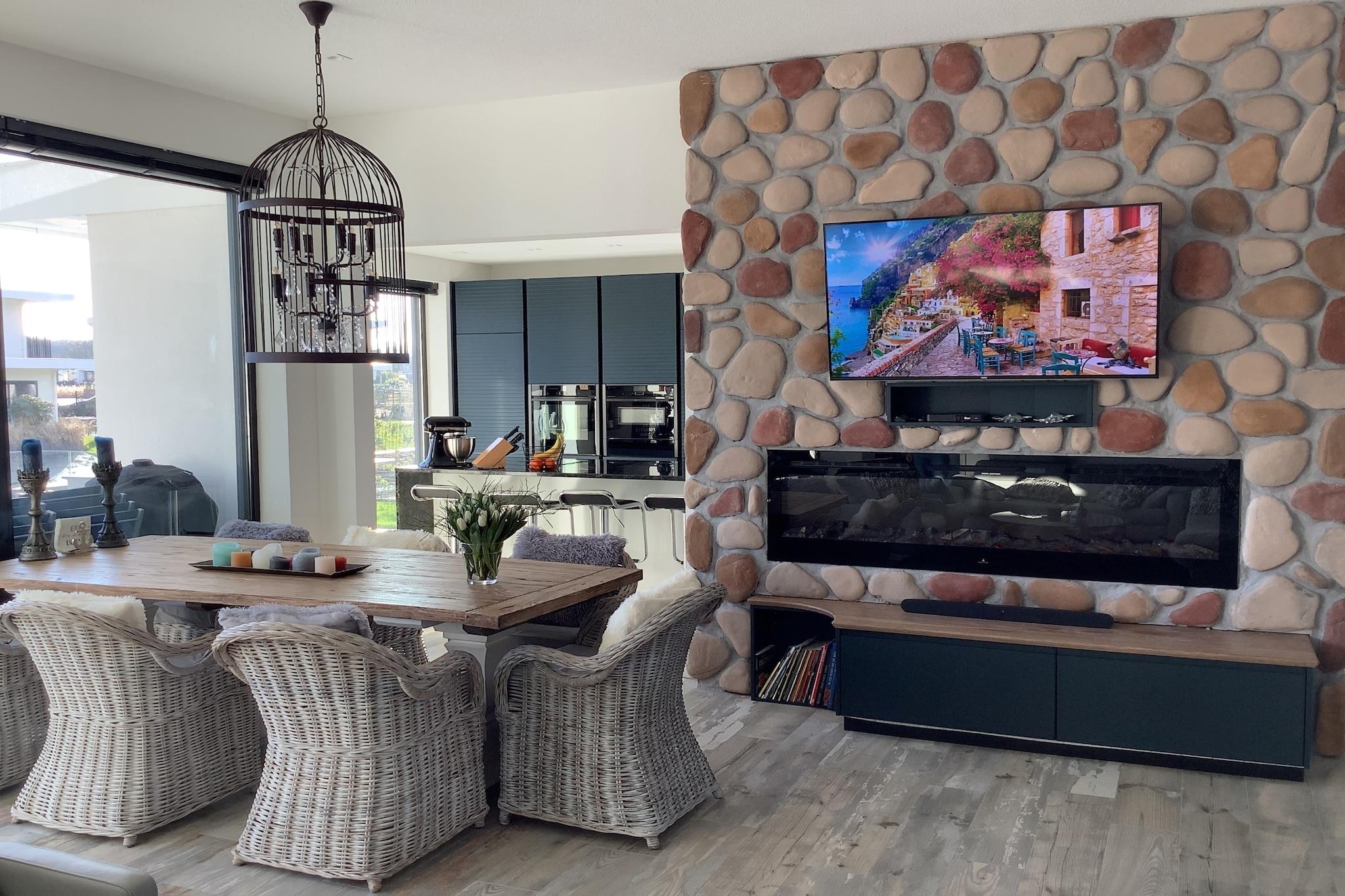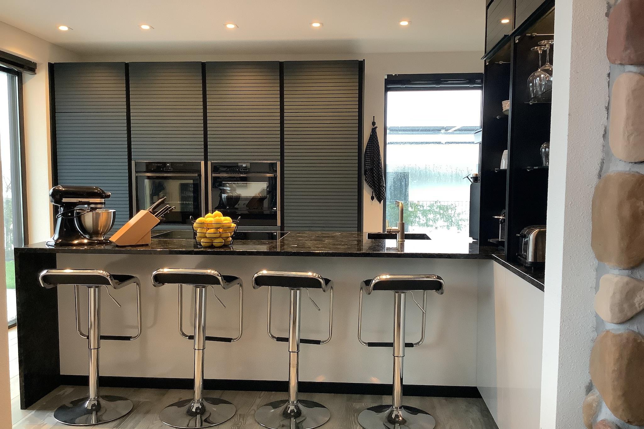 Stueetage: (Indgang , åbent køkken(bar(spise bar), kogeplade(induktion), kaffemaskine(kopper, espresso), kaffemaskine(kaffetragt), ovn(damp), ovn(grill-ovn), opvaskemaskine , køle-fryseskab, Foodprocessor), stue / spisestue(Fjernsyn(Smart-TV), spisebord(7 personer), hyggepejs, sofahjørne(6 personer)), soveværelse(dobbeltseng(boxmadras, 180 x 200 cm), Fjernsyn(Smart-TV), hyggepejs), soveværelse(dobbeltseng(boxmadras, 180 x 200 cm), Fjernsyn(Smart-TV), hyggepejs, klimaanlæg), soveværelse(dobbeltseng(boxmadras, 180 x 200 cm), Fjernsyn(Smart-TV), hyggepejs, klimaanlæg), badeværelse(bruser(Walk-in-bruser), håndvask, håndvask, toilet), badeværelse(bruser(Walk-in-bruser), håndvask, håndvask, toilet), toilet(håndvask, toilet), pulterkammer(tørretumbler, vaskemaskine)) fortøjningsbro(adgang via udendørs trappe), spisebord(8 personer), pejs, kakkelovn, Netflix, mikrobølgeovn, havedøre, patio, varme, klimaanlæg, terrasse(privat, overdækket, 36 m2), have, havemøbler(6 personer), solstole, grill(elektrisk), parkering, liggestole, Parasol, tennisbane(deles med andre gæster, betalt), strygebræt, loungemøbler, hyggespil