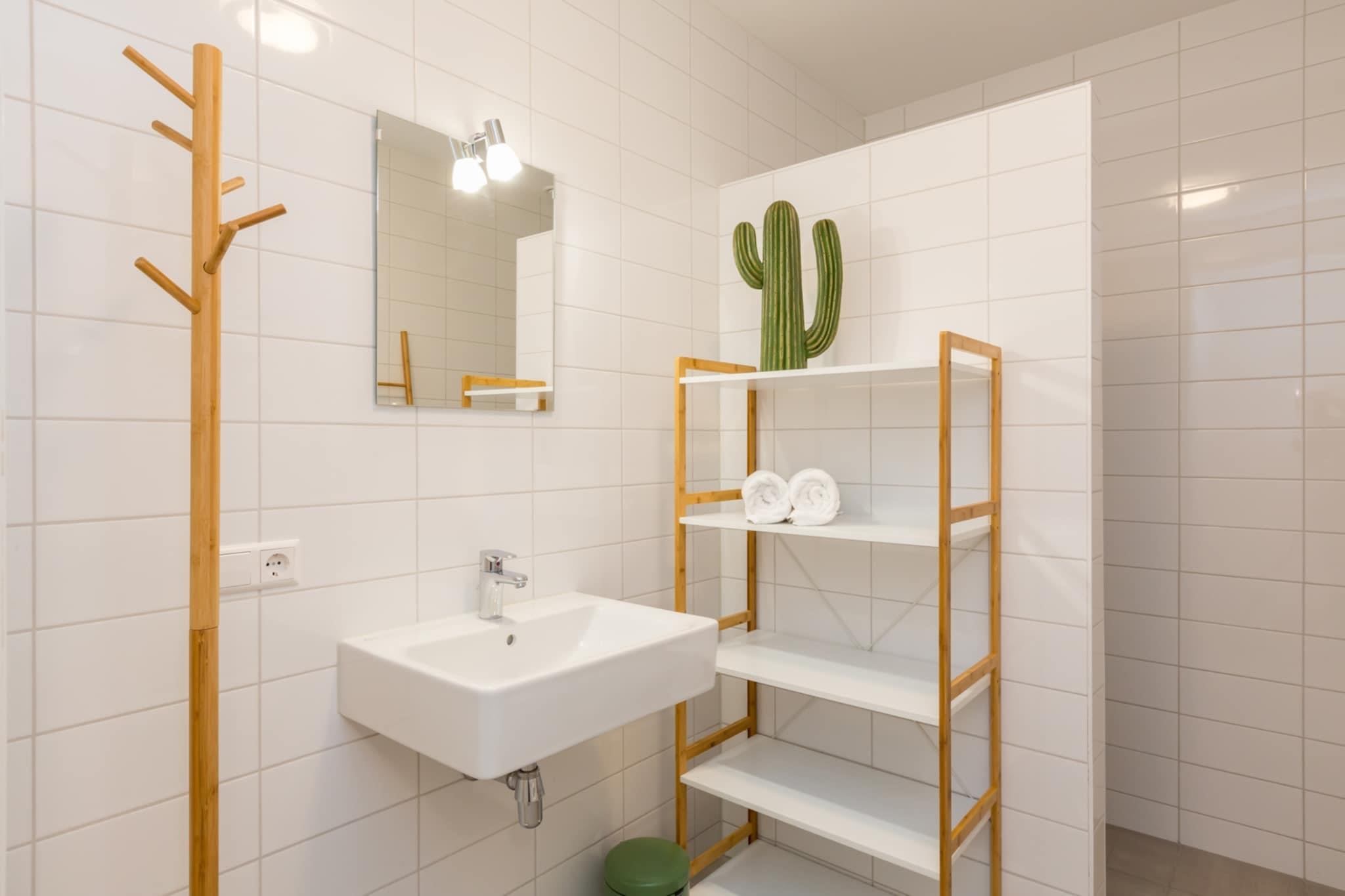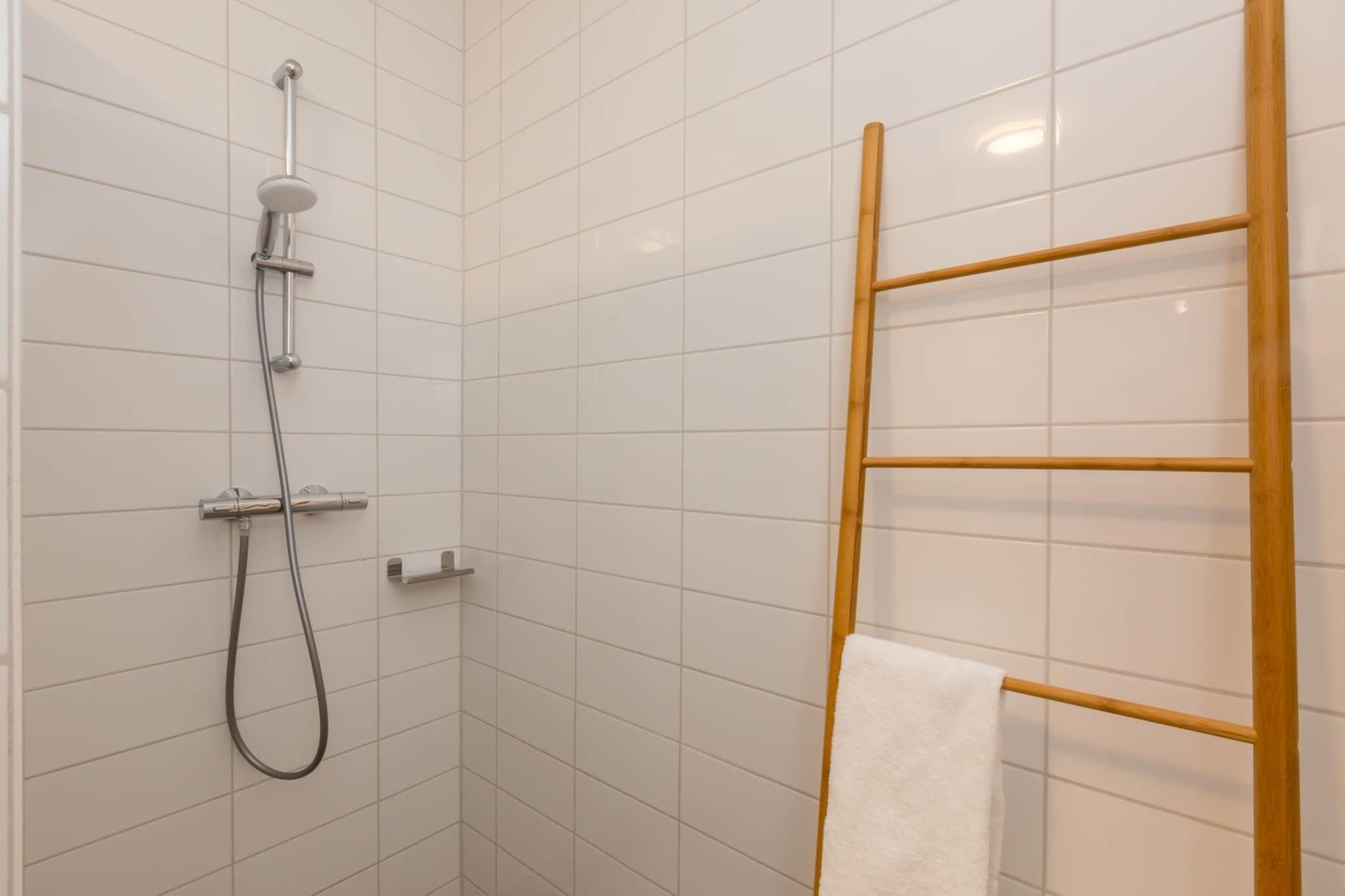 Stue(Fjernsyn(fladskærm), sofahjørne), Køkken(kogeplade, elkedel, emhætte, kaffemaskine(kopper), opvaskemaskine ), soveværelse(dobbeltseng(boxmadras)), soveværelse(enkeltseng(boxmadras)), badeværelse(bruser, håndvask, føntørrer), tørretumbler(deles med andre gæster), toilet, vaskemaskine(deles med andre gæster), balkon eller terrasse, cykelopbevaring(deles med andre gæster), parkering