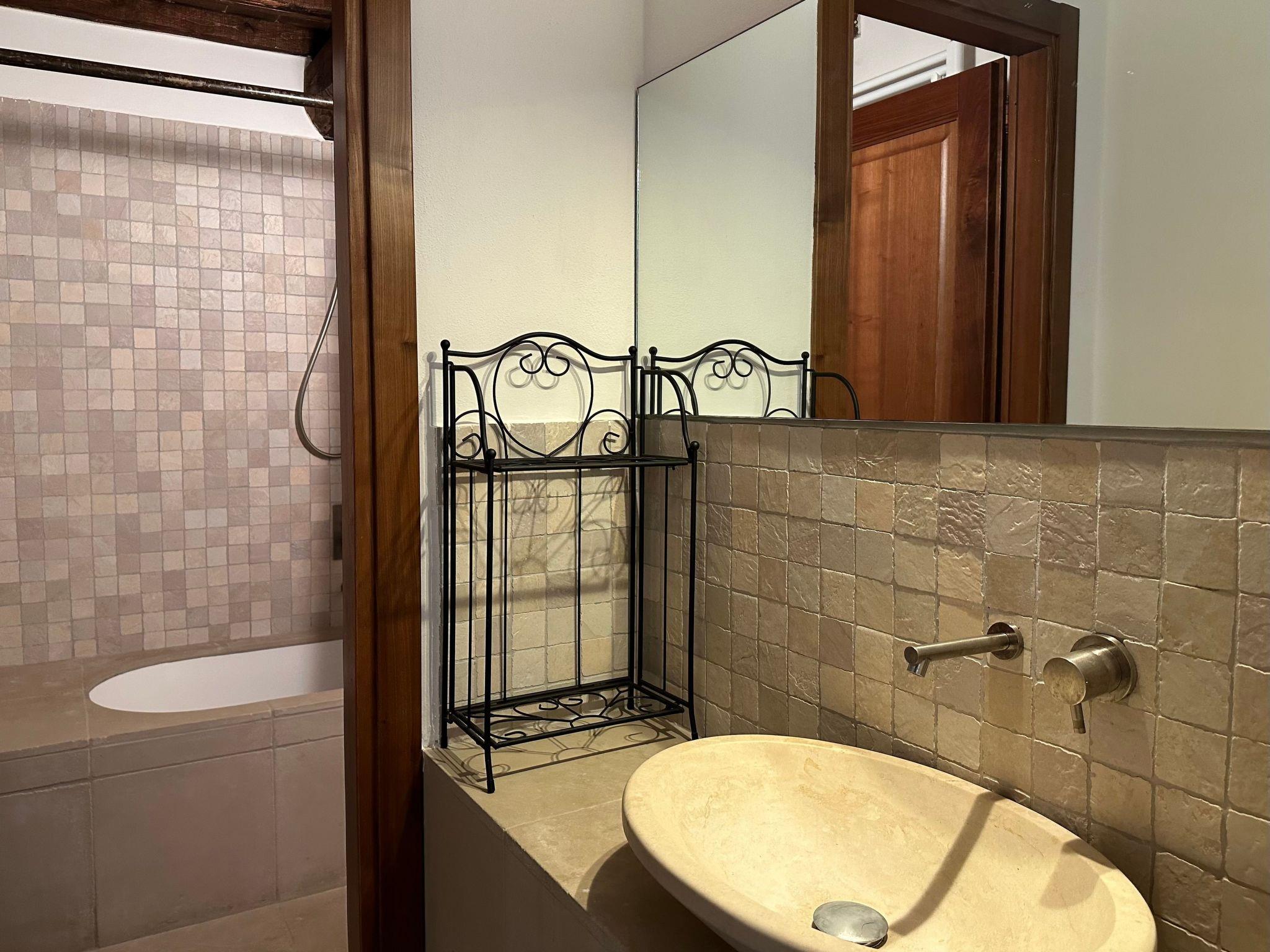 Our "Molino" flat has a kitchen-cum-living room with a fireplace and a bedroom with a gallery on which there is a children's bed. The spacious bathroom has a bathtub and a bidet. The flat is located right next to the garden, with a view as far as Montepulciano, and the pool is just a few steps away.