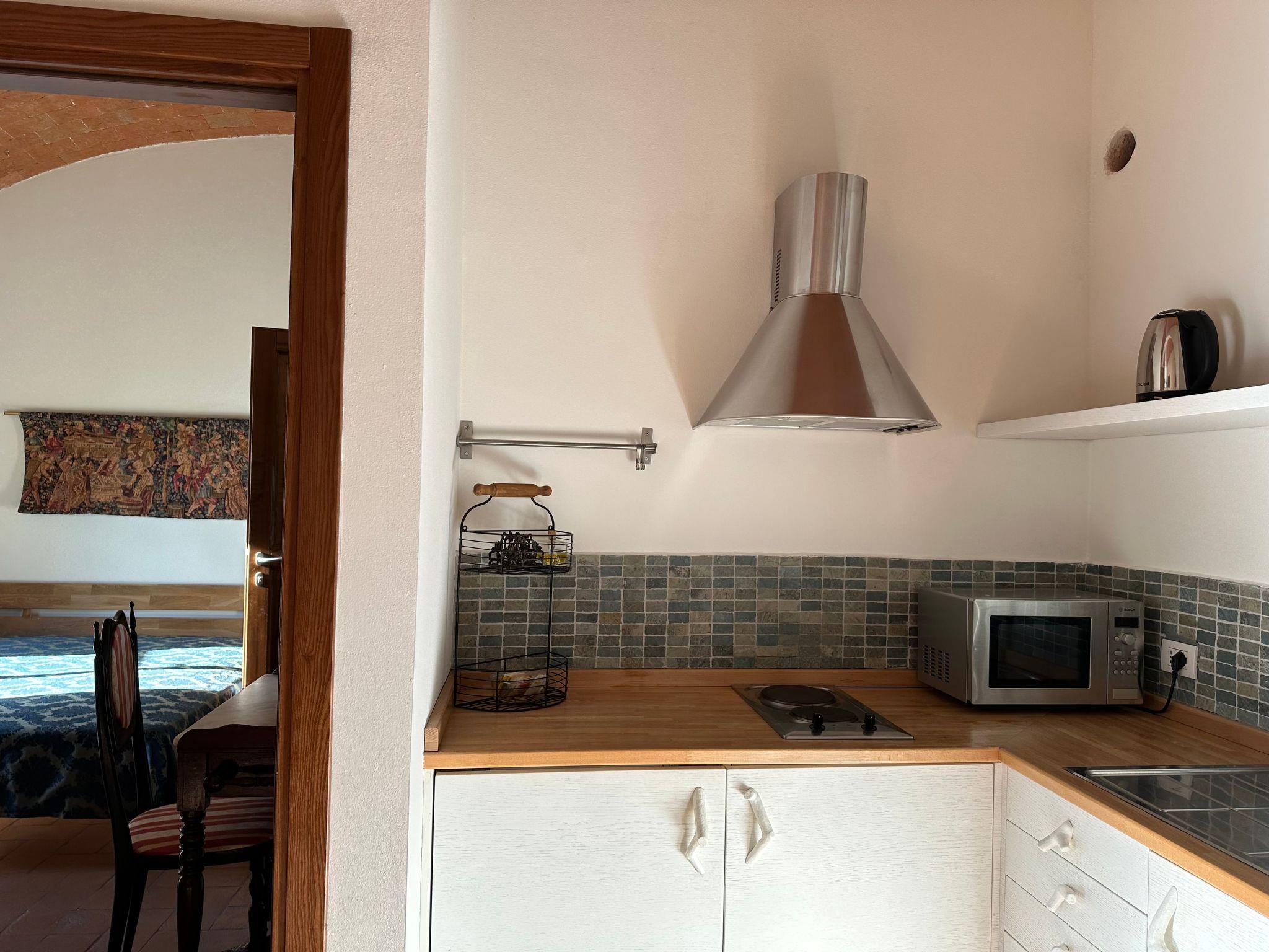 The Vigneto flat is located on one level on the ground floor of the villa and is also suitable for a wheelchair or walker thanks to its wide doors and spacious bathroom with walk-in shower. It has a kitchen-cum-living room and a bedroom with a double bed; an extra bed can be added if required.