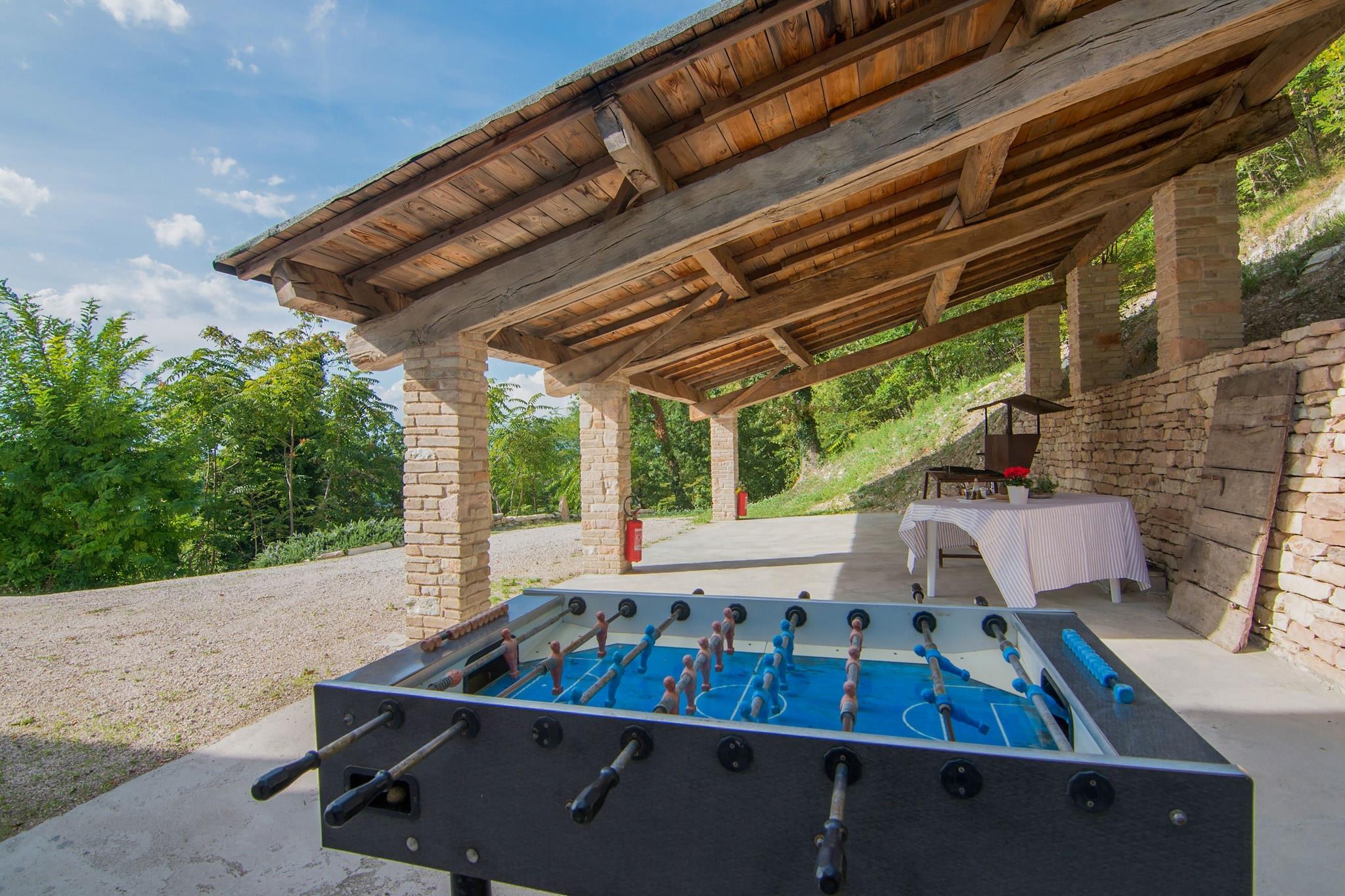 Denne rummelige, kæledyrsvenlige villa, omgivet af frodige grønne områder og kun 50 km fra havet, tilbyder et luksuriøst tilflugtssted for op til 10 gæster. Med et hovedhus og et uafhængigt gæstehus er den ideel til store familier eller grupper. Den lyse stue, det fuldt udstyrede køkken, soveværelser med aircondition og flere badeværelser sikrer komfort, mens den overdækkede veranda med lounge-sæder og et stort spisebord sætter scenen for udendørs måltider. Slap af i det udendørs boblebad, svøm i den private pool med en lavvandet sektion til børn, eller tænd op i det udendørs køkken og grill til afslappede aftener. Gulvvarme og gratis Wi-Fi bidrager til bekvemmeligheden og gør det til et paradis året rundt. I nærheden kan du udforske middelalderlandsbyer, naturskønne stier og lokale vingårde. Uanset om du slapper af ved poolen eller udforsker regionen, er denne villa en perfekt base for en mindeværdig ferie. Bemærk: Swimmingpoolen er åben fra 1. juni til 30. september.