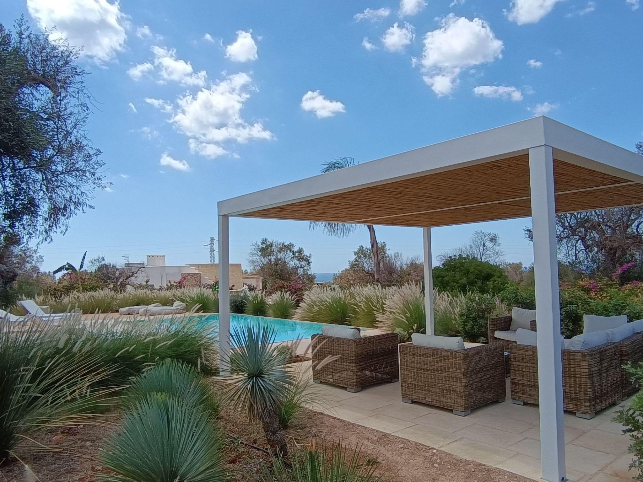Around the villa a paved area allows you to fully enjoy the outdoor spaces: the dining area is located in the shade of a large porch overlooking the pool, a large gazebo houses a comfortable garden lounge, a built-in barbecue is located on the side of the villa.