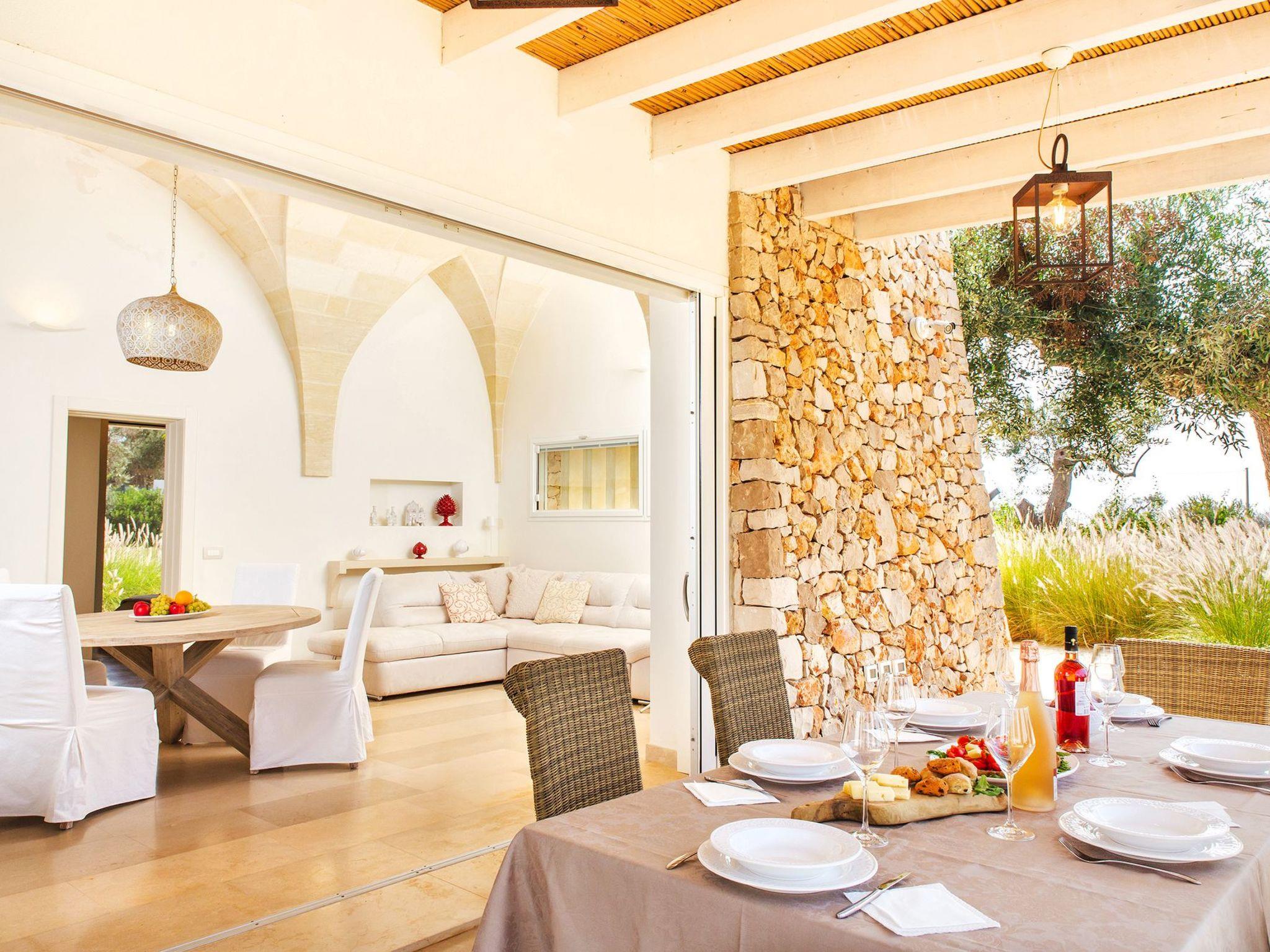 Just 5 minutes by car from the renowned resort of Santa Maria di Leuca, we offer a luxury villa with a modern design, enclosed in stone walls and rooms with typical Salento star vaults.