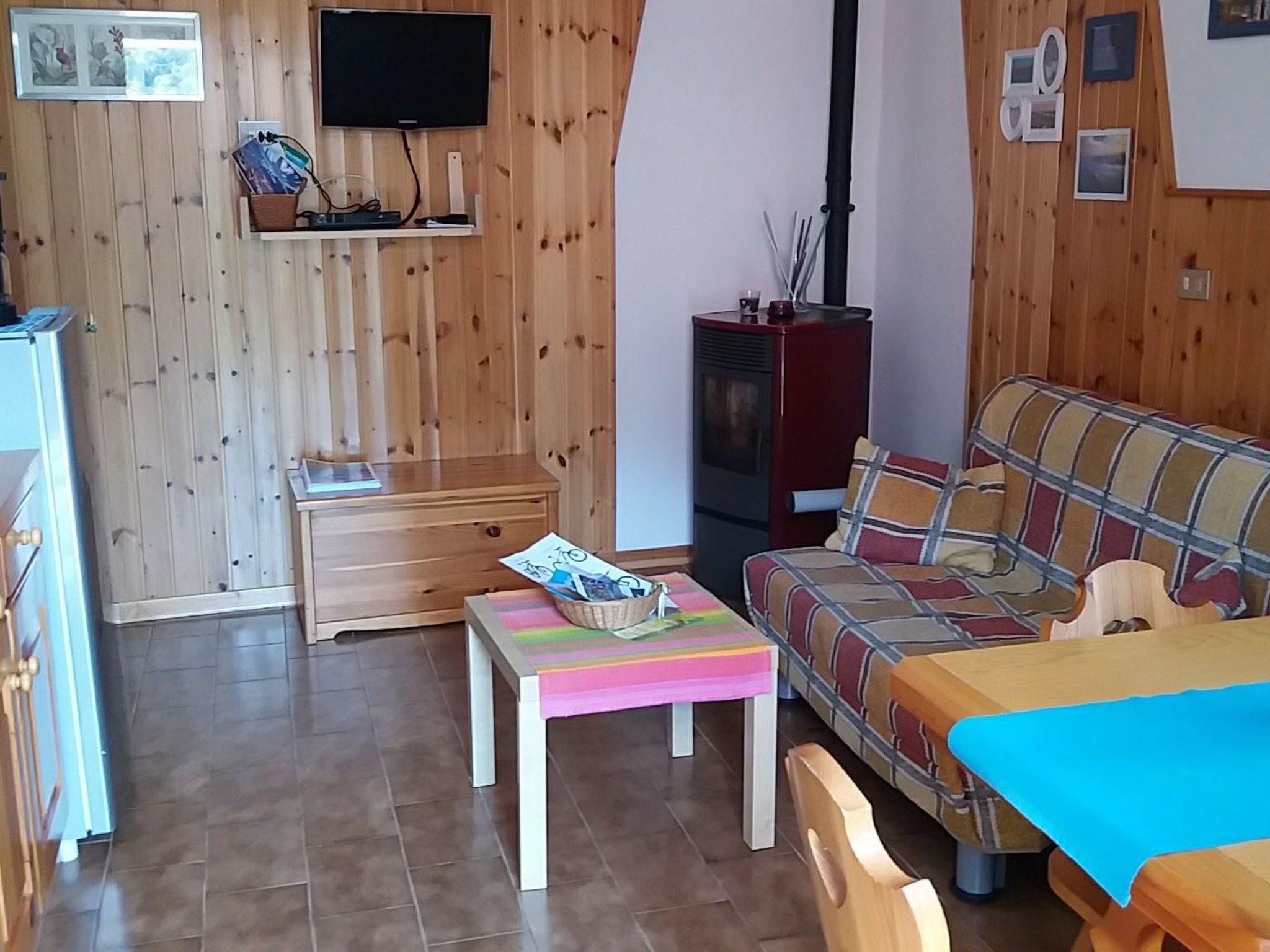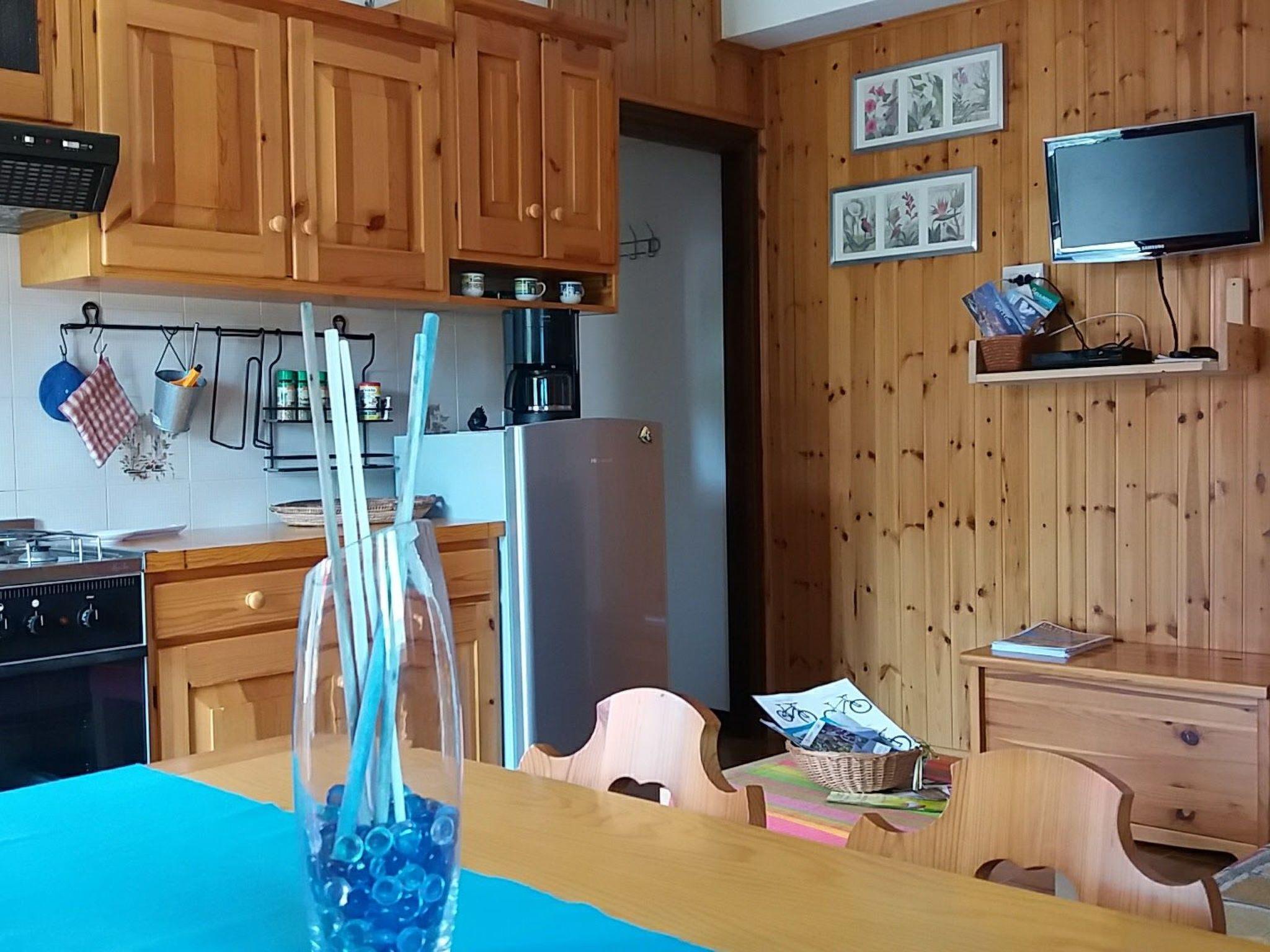 The flat of approximately 40 m² is very bright and cosy. The spacious kitchen-dining room is made particularly cosy by the wood-panelled walls. It is equipped with a sofa bed (French size, 140 cm wide) for one or two persons. In one corner is the dining area with a bench, chairs and a table. On the wall is a flat-screen TV with satellite reception and DVBT. The well-equipped kitchenette, also made of wood, has an oven, gas cooker, toaster and refrigerator with freezer. A pellet stove provides cosy warmth throughout the house during the colder months. In the bathroom there is an electric radiator. The bedroom, furnished in cool shades of white and blue, has a double bed (160x190cm), bedside tables and a wardrobe. The bathroom is equipped with a shower cubicle. Due to its hillside location and thick walls, air conditioning is not required. Internet access (Wi-Fi) is available: the first gigabyte is included per stay; subsequent use is subject to a charge. Bicycles can be parked on the ground floor, which is used as a cellar and storage room.