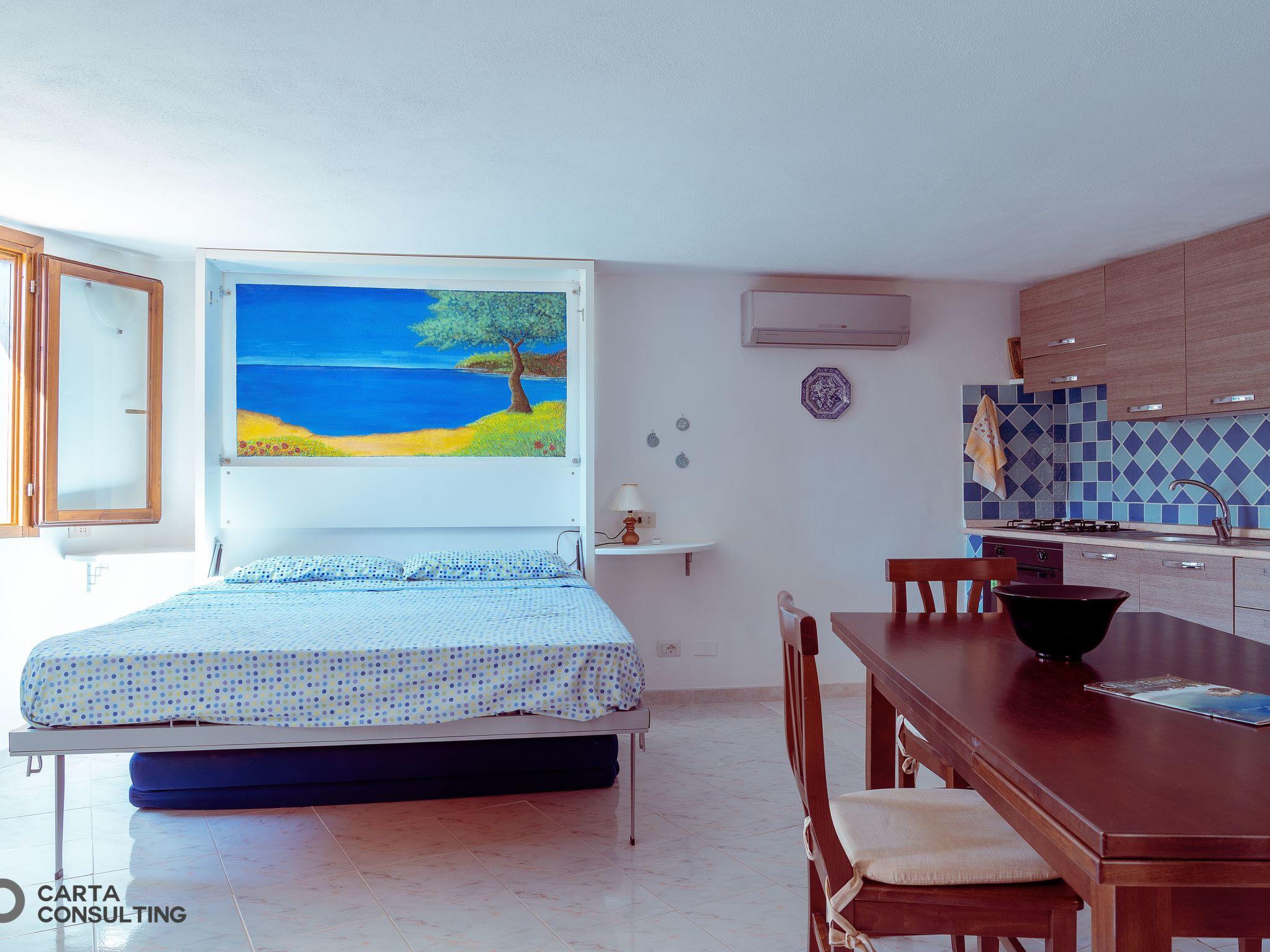 amazing studio with folding bed, plus two sofa beds (o/w one queen size), kitchenette (with fridge/freezer), A/C, dt/Sat TV, water reserve (4,000 lt) and bathroom entirely carved into the rock in pure style “Costa Smeralda” with shower.