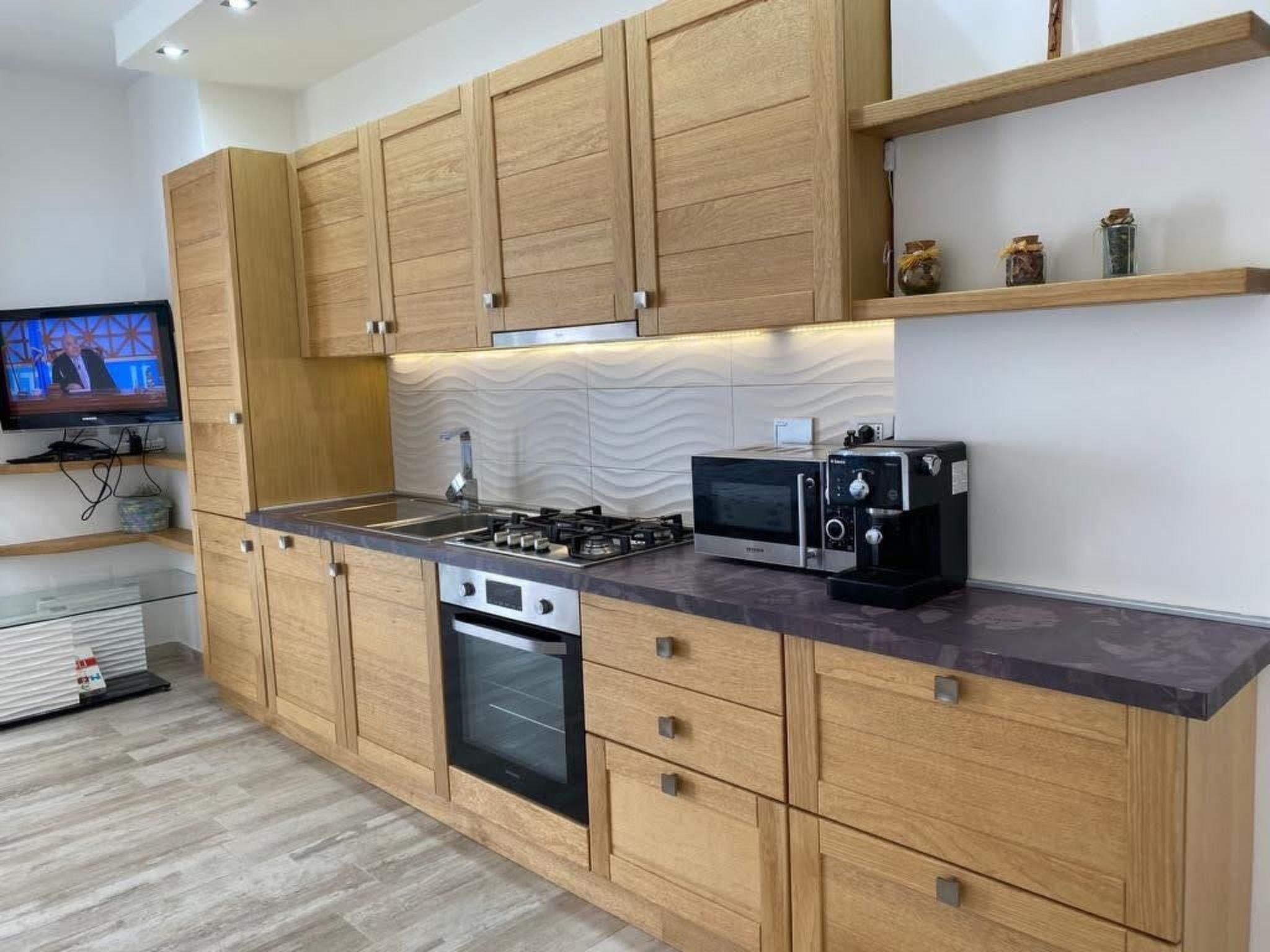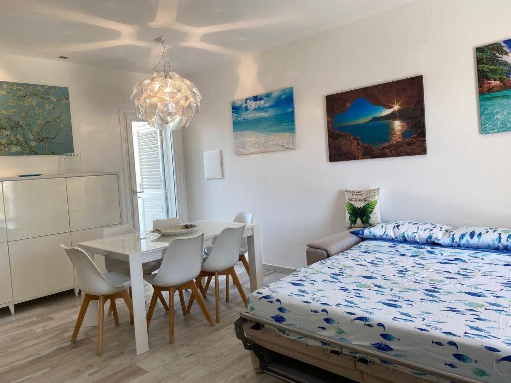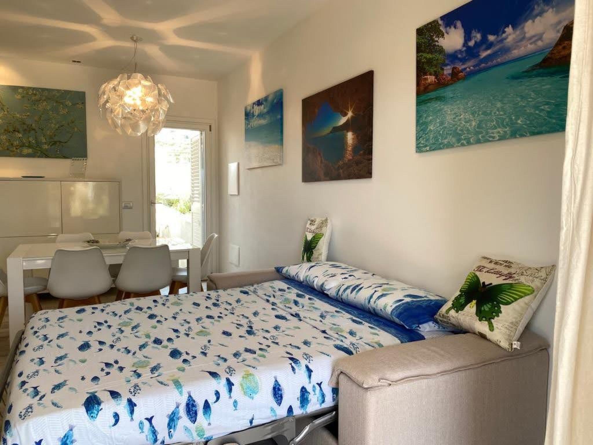 Internally, the villa portion has two double bedrooms, a bathroom with shower, and a custom-made double sofa bed with a traditional high mattress positioned in the living room. Every detail has been thought out to ensure maximum comfort, from the choice of furnishings to the interior amenities, which include Wi-Fi, a flat-screen TV with satellite, a washing machine, kitchen appliances such as a kettle, toaster, microwave, and coffee maker, as well as an iron and ironing board, hairdryer, clothes hanger, shampoo, soap, bubble bath, bed and kitchen linen, towels, detergents, and even a parasol, toys for the children, and beach supplies.