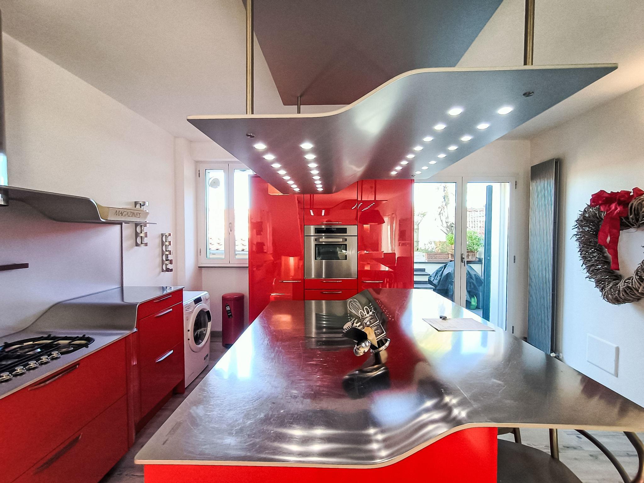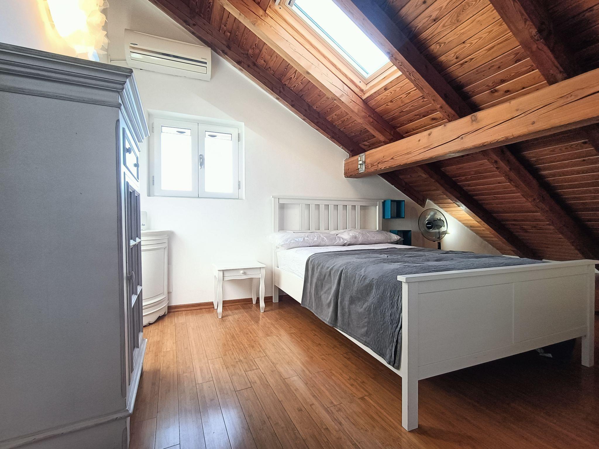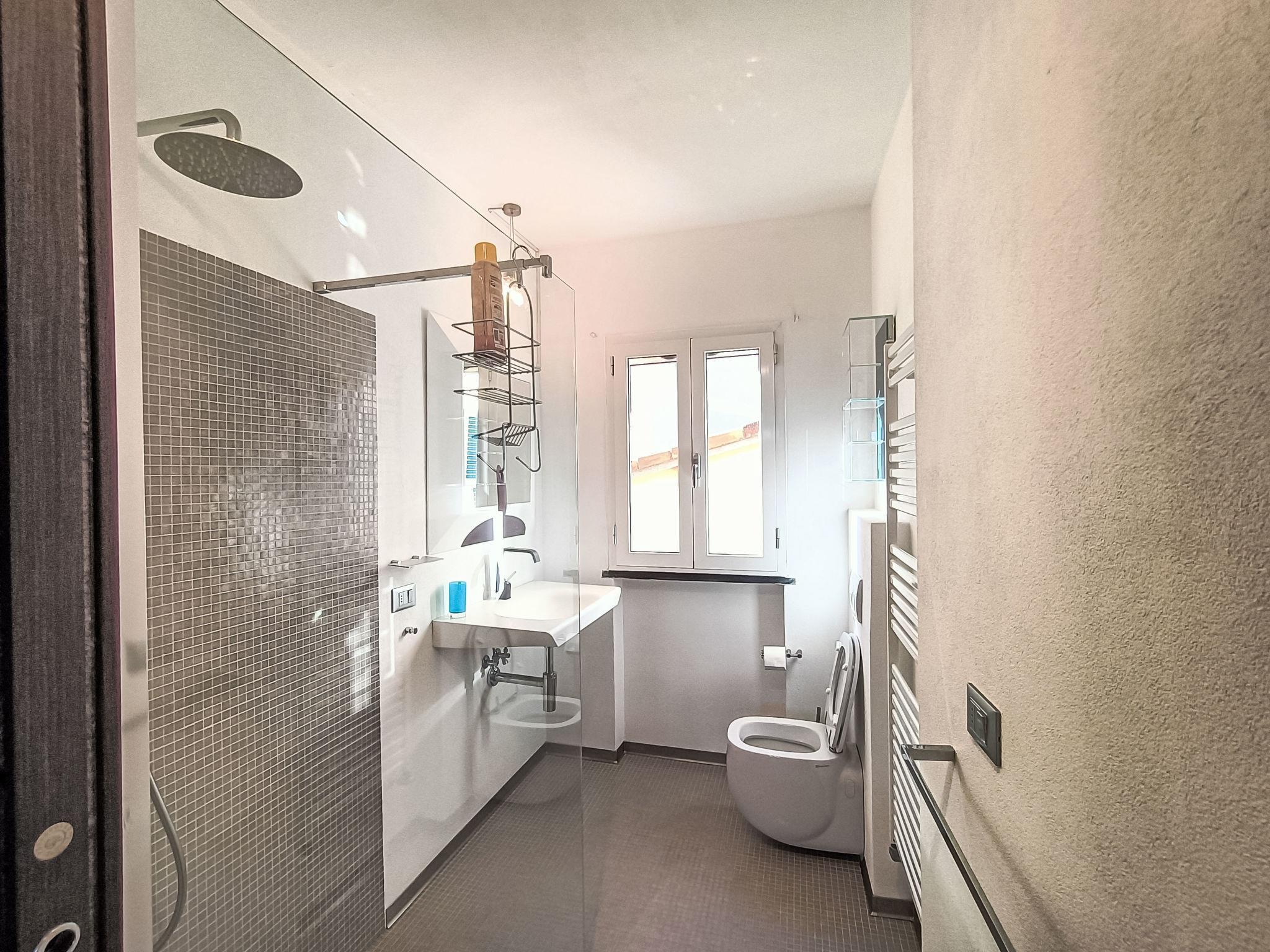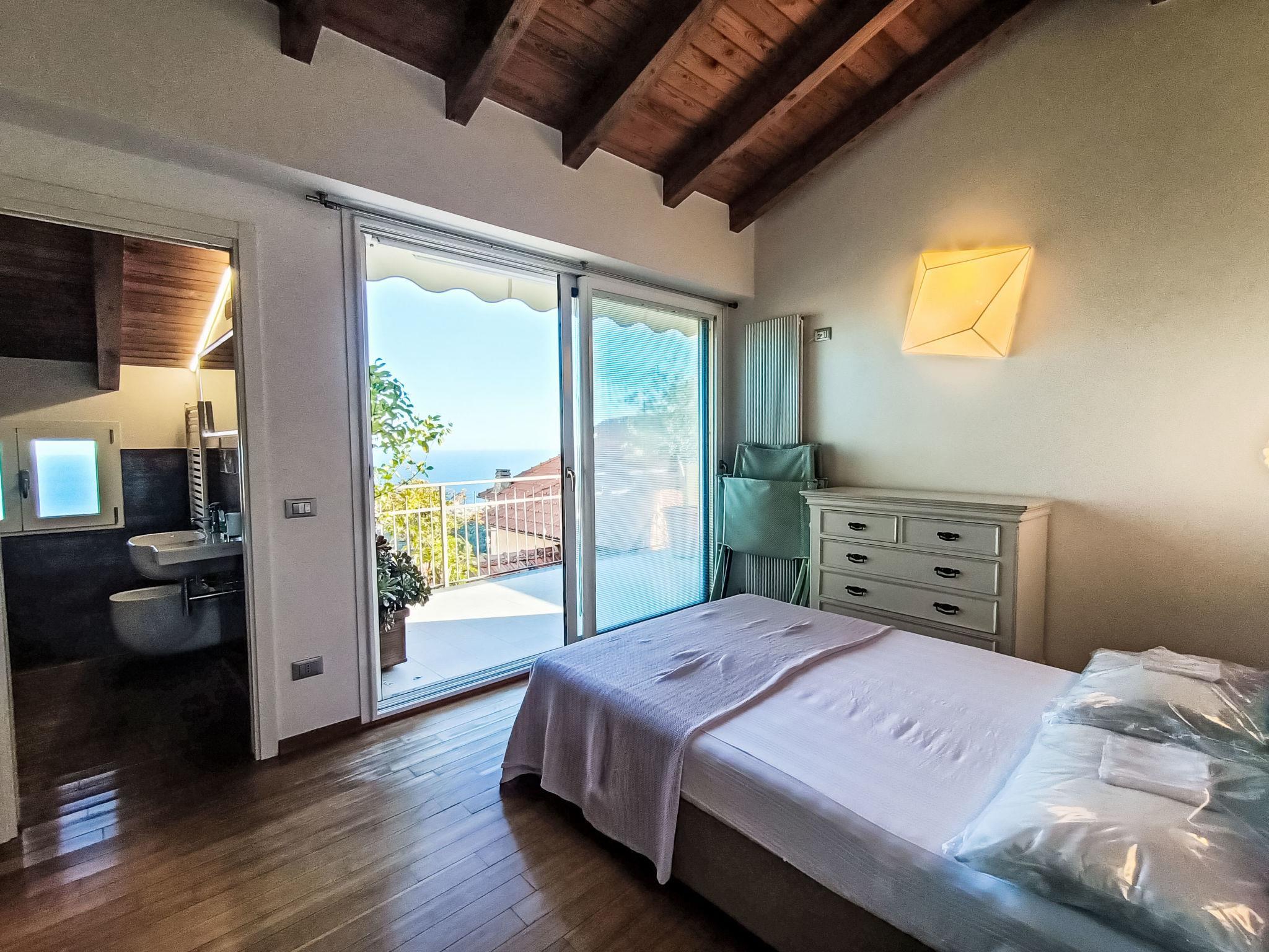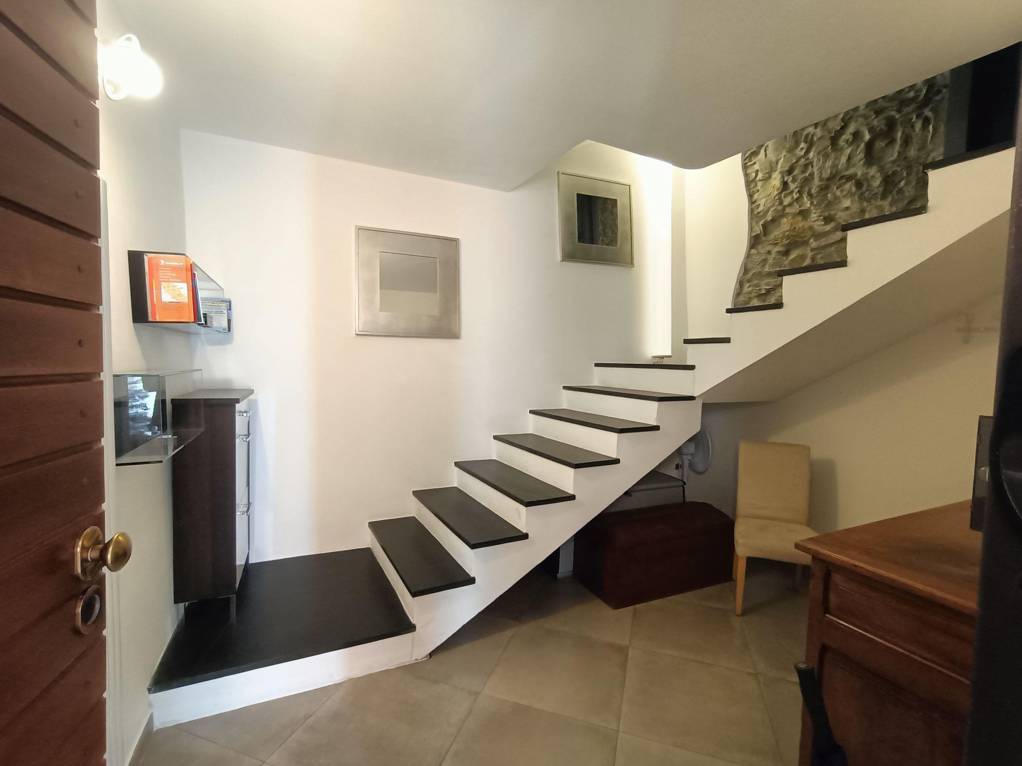 "Terrazza con glicine", 5-room terraced house 143 m2 on 3 levels, on the ground floor. Bright, modern and cosy furnishings: entrance hall. 1 room with 1 double sofabed, dining table, kitchen corner and shower/WC. Upper floor: (open staircase) living/dining room with air conditioning. 1 room with 1 bed (180 cm, length 90 cm), 1 pull-out bed. Open kitchen (Gas stove, 5 gas rings, toaster, kettle, freezer, electric coffee machine). Exit to the terrace. Shower/WC. 2nd upper floor: 1 double bedroom with sloping ceilings with 1 french bed and air conditioning. 1 double bedroom with sloping ceilings with panoramic window with 1 french bed, hand-basin and shower/WC. Exit to the terrace. 2 terraces 10 m2. Terrace furniture. Panoramic view of the sea, the mountains and the city. Facilities: washing machine, dryer, hair dryer. Internet (WiFi, free). Garage at 50 m. Please note: one double bedroom is outside the apartment. Smoke alarm, fire extinguisher, no lift. No internal connecting door between the separated properties. IT009001C2NBR5TUHX