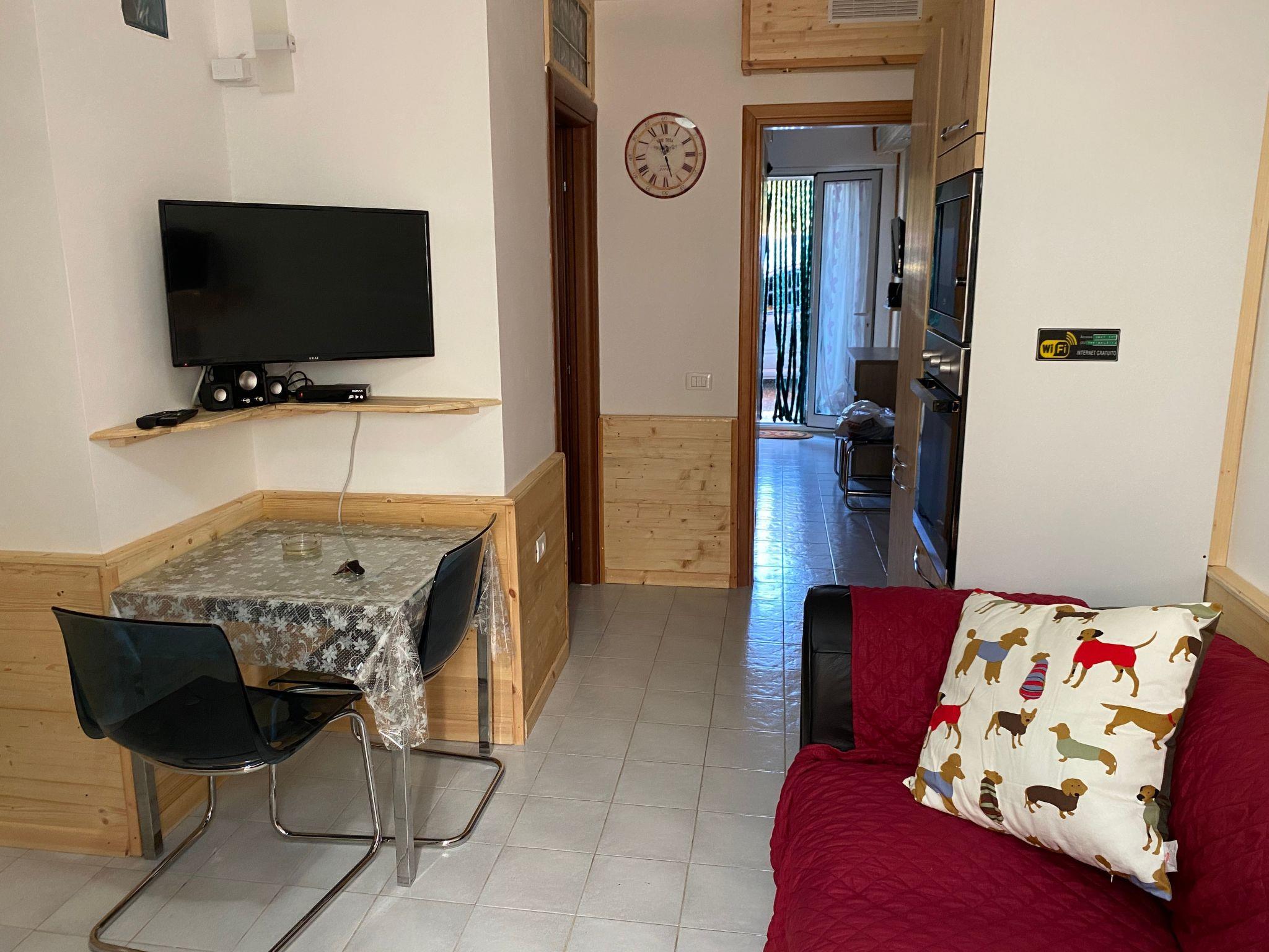 The 53 m² flat has a bedroom with a double bed (160 x 190 cm) and a bunk bed, a bathroom with shower, and a kitchen-living room with a sofa bed (160 x 190 cm). The kitchen is equipped with a dishwasher, crockery, cutlery and an extractor hood. The bedroom and the kitchen-living room have an LCD TV with satellite channels. The flat has windows with Thermophane thermal insulation, sound insulation and blackout, air conditioning, ceiling fans and heating, a safe, a stereo system, a washing machine, free wireless internet access, a telephone (for incoming calls only) and an intercom.