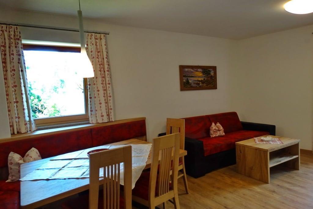 Spend your holiday in our new, high-quality furnished holiday apartment with the latest Neff kitchen appliances, oven, 4-burner ceramic hob, dishwasher, refrigerator, and much more. Two bedrooms, two separate shower/WCs, an entrance hall, and a living room are located in one of the most beautiful landscapes in the Merano region, directly on hiking trails such as the Waalweg, Ochsentodweg, and Burgweg.