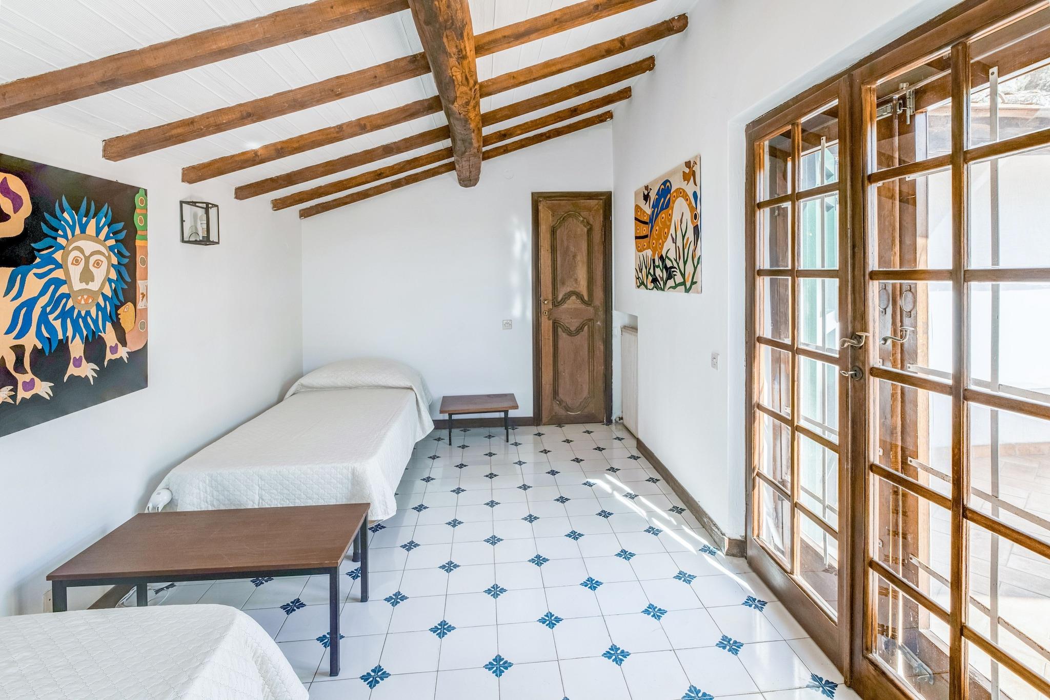 Stueetage: (Stue(Fjernsyn(fladskærm, parabol), sofahjørne, stereoanlæg), spisestue(spisebord), køkken-alrum(kogeplade, elkedel, cooker, brødrister, emhætte, kaffemaskine, ovn, opvaskemaskine , køle-fryseskab, Saftpresser), soveværelse(enkeltseng, enkeltseng), Soveværelse med badeværelse(dobbeltseng, bruser, håndvask, toilet, bidet), badeværelse(bruser, håndvask, toilet), Arbejdsværelse(sofahjørne), vaskerum (håndvask, vaskemaskine, strygebræt, strygejern)) På 1. etage: (soveværelse(dobbeltseng, klimaanlæg, insektnet), soveværelse(enkeltseng, enkeltseng, klimaanlæg, insektnet), badeværelse(badekar, håndvask, toilet, bidet), terrasse(50 m2), havemøbler, grill) rejseseng, varme(central), terrasse(overdækket), have(privat, indhegnet, 1500 m2), havemøbler, barnestol