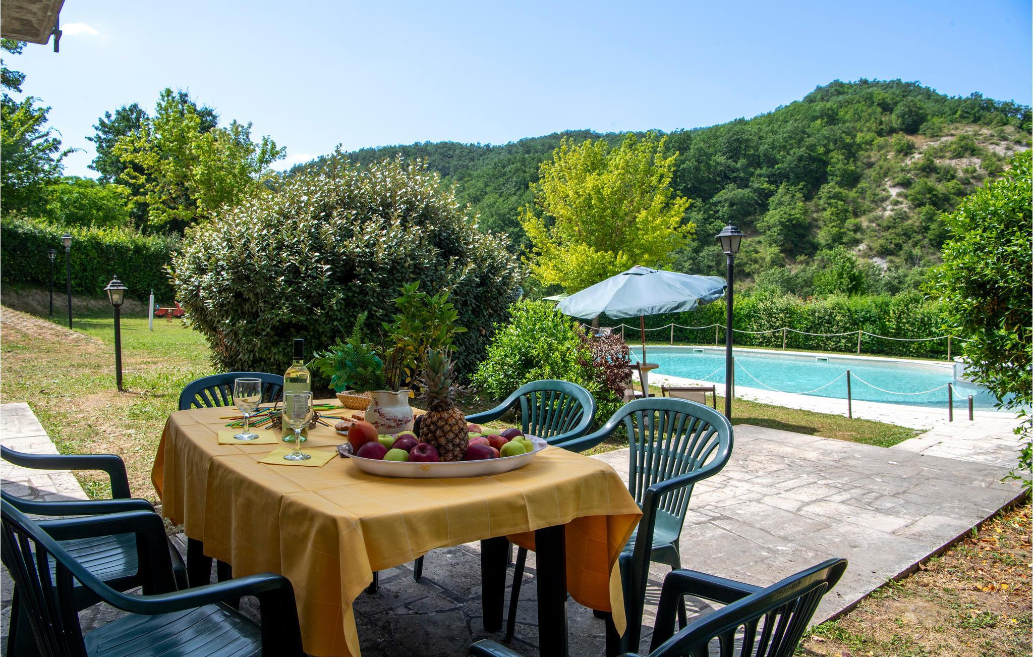 Denne ferielejlighed ligger på ejendommen Valguerriera, ca. 4 km fra Piobbico, i en dal i Apennin, det ideelle rejsemål til jer, hvis I ønsker jer en afslappende ferie i uberørt natur. Ejendommen består af herskabshuset og tre landhuse, de generøse udendørsområder og den dejlige, fælles pool på 17 x 10 m med undervandsmassage. I landhusene er der i alt 11 indbydende indrettede ferielejligheder. Lejligheden byder på en uafhængig indgang i eget udendørsområde med bord, stole og parasol, hvor I kan slappe af og spise jeres måltider i det fri. Grill og vaskemaskine til fælles brug. Parkering på grunden. En barneseng er til rådighed. Her bor I i Marche, ved grænsen til regionerne Toscana og Umbrien, i nærheden af Piobbico (Pesaro og Urbino), i en rolig dal ved navn Candigliano, en af de dejligste og mest oprindelige dale i baglandet af Pesaro, der byder på mildt klima og hvorfra I nyder en vidunderlig udsigt til Apennin. I omgivelserne venter der kunst- og renæssancebyer som Urbino, UNESCO-verdenskulturarv, fortryllende middelalderlandsbyer som Piobbico, Apecchio, Sant’Angelo in Vado og Acqualagna, kendt for trøflerne, samt Urbania, Cagli, San Marino, Gradara og San Leo. Ejendommens beliggenhed er også fordelagtig til lidt længere dagsture som til Gubbio, Assisi, Perugia, Città di Castello, Arezzo, San Sepolcro, Loreto, Florenz og Siena, der alle rummer stort kunsthistorisk relevans, eller til San Marino, til borgen af Gradara, grotterne af Frasassi eller til Furlopasset. Afstande: 4 km Piobbico (dagligvarer og andre indkøb, bank, apotek, læge), 30 km Urbino, 55 km Fano og strandene langs Adriaterhavet, som I når på omkring en times kørsel. 6 km til wellnesscenter og 10 km til ridebane. Mulighed for guidede ture.