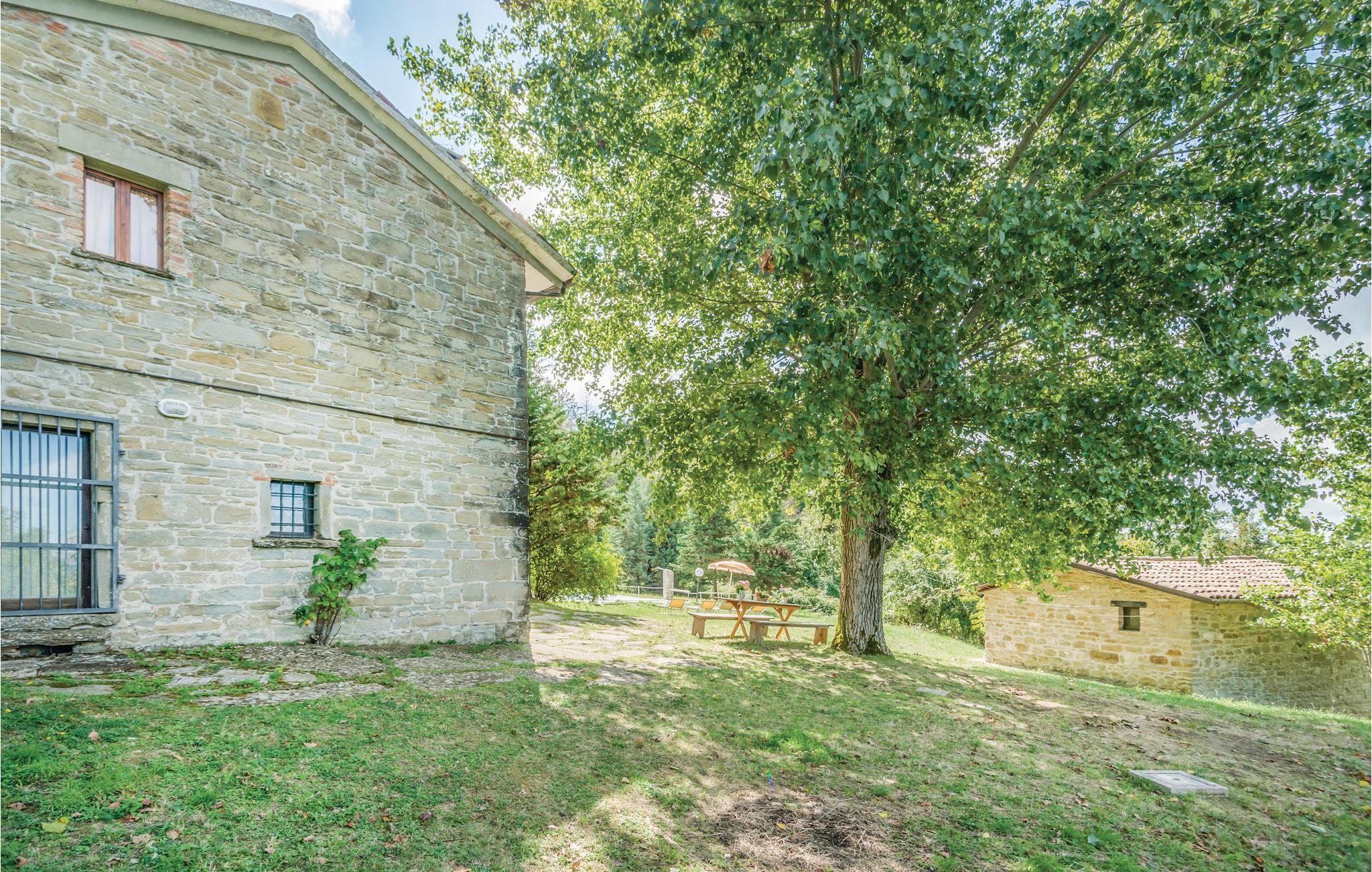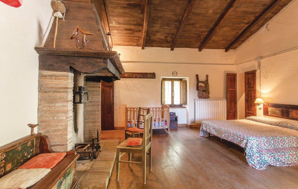 Denne store bondegård er bygget i egnstypisk stil, som blevet bevaret under renoveringen. Den ligger midt i det bjergrige umbriske område Appenninerne (700 m over havets overflade). Der er en fantastisk panoramaudsigt over det omkringliggende landskab, der er prydet af bjerge. På gårdens store grund er der en stort møbleret udendørs-areal, og en lille skov, man kan gå ture i. Ved siden af huset ligger der en swimmingpool. Huset egner sig især for børnefamilier eller mindre grupper, der gerne vil holde ferie sammen, tæt på naturen. Huset er på flere etager, og har flere indgange. I stueplan er der to stuer en suite, det ene med pejs fra det 15. århundrede, og det andet med tv. Adgang til en lille terrasse der er oplagt at spise morgenmad på, spisestue (adgang udefra), ved siden af rummeligt køkken (stort køleskab, ovn, gasgrill, fryser og opvaskemaskine). 2 soveværelser med dobbeltsenge (det ene med udgang til overdækket terrasse), 1 soveværelse med to enkeltsenge, 2 soveværelser med etagesenge, 1 badeværelser med brusebad, samt et wc der ligger ved siden af poolen. Høj stue (parterre) med adgang udefra: 1 soveværelse med dobbeltseng, 1 badeværelse med brusebad, 4 trin op, under et skråtag: gennemgangsrum med sofa og bord, 1 soveværelser med dobbeltseng (loftshøjde 2, 2,5 m). wc, to badeværelser med brusebad. I lille tårn: skønt soveværelse med dobbeltseng samt med enkeltseng (godt til unge mennesker). Enkel men godt gennemtænkt indrettet. Barneseng og stol på forespørgsel. Afstande: ca. 45 km universitetsbyen Urbino, en af mest interessante byer i Marken, samt samme afstand til Gubbio som regnes som den skønneste by i Umbrien. Andre afstande: Città di Castello 27 km, Arezzo 60 km, adriaterhavskystens skønneste sandstrande (Fano) 70 km (gode forbindelser). Forretninger af alle slags, tennisbane og supermarked 2 km, i 5 km omkreds mange pizzeriaer og forretninger. De gæstfrie ejere ejer et rekreationscenter (spa, swimmingpool, fitness), der ligger ca. 20 km væk. Her er termalbad sportsbaner og fagpersonale. På forespørgsel og mod betaling på stedet: særaftaler omkring wellnesscenteret, kok, rideundervisning, vandreture og pilateskurser.