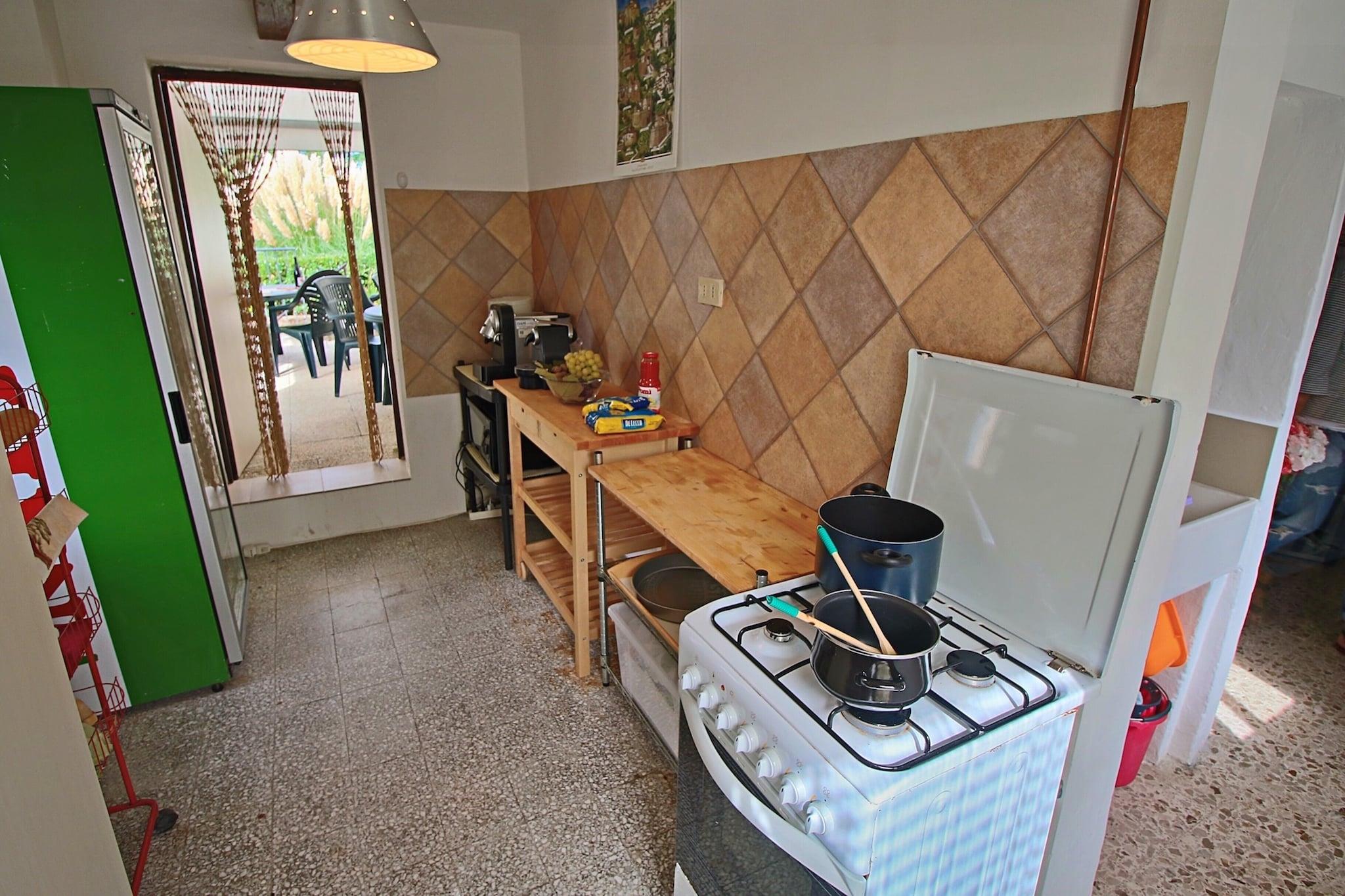 På 1. etage: (Stue(enkeltsovesofa, Fjernsyn), åbent køkken(kogeplade, komfur, emhætte, espressomaskine, køleskab), soveværelse(dobbeltseng eller 2 enkeltsenge Senge), badeværelse(bruser, håndvask, toilet, bidet)) varme(central), have(deles med andre gæster), havemøbler, grill, parkering, swimmingpool(deles med andre gæster, 7 x 4 m., opened from May upto and including Sep), legeredskaber