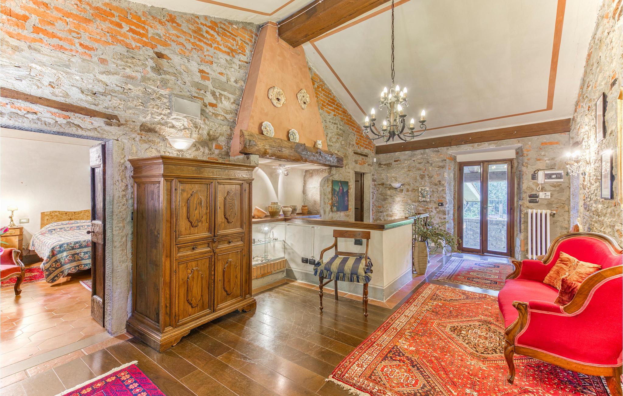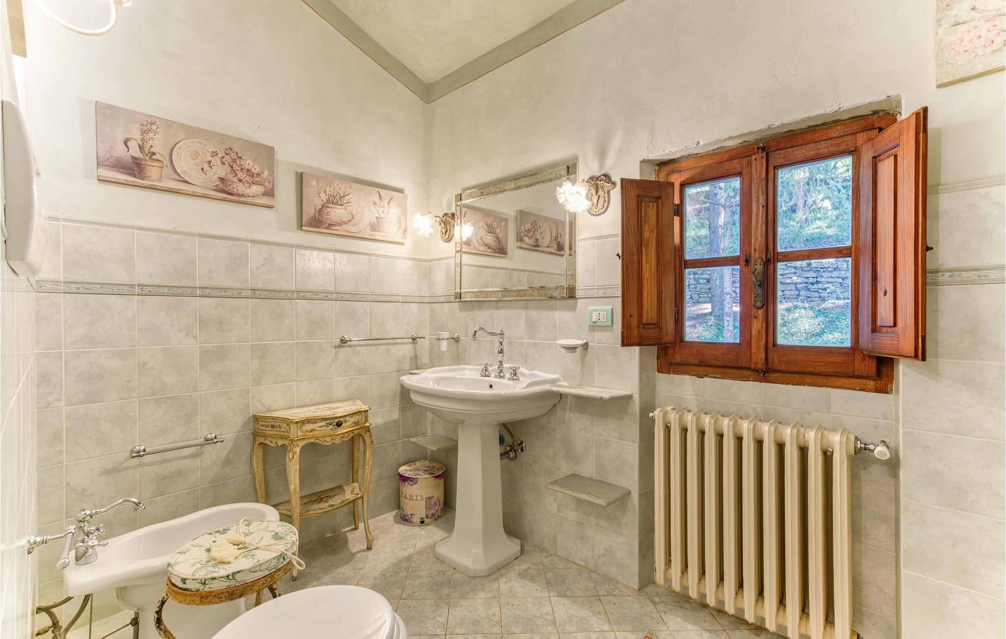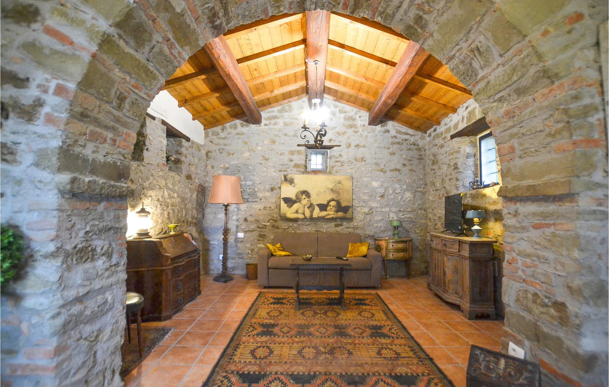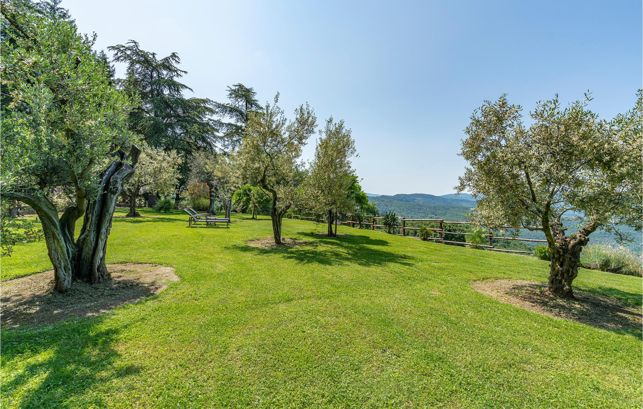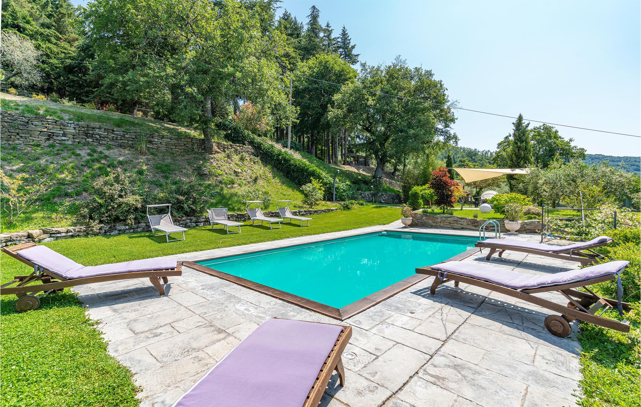 Kun seks km over Arezzo, i et roligt bakket landskab, ligger dette landhus omgivet af en stor have med pool. Smagfuldt indrettet, overdækket siddeplads på terrassen hvor grillen også står. Huset ligger i 600 m højde med en betagende panoramaudsigt over Arezzo: her er fantastiske omgivelser til en afslappet ferie og om ønsket med kreative beskæftigelser som at male, lave lækker mad og skrive. På den store indhegnede grund er der en terrasse til sol, en grill, et område med pool og bekvemme liggestole, samt fodbold- og volleyballbane - det hele benyttes alene af jer. Til Arezzo med sine berømte museer og kirker, interessante butikker, gode restauranter og Trattorien er der kun et stenkast. Om lørdagen er der et stort marked og den første weekend hver måned er der et berømt antikvitetsmarked i den gamle bydel. Besøg også Cortona 30 km, Siena 70 km, og Firenze 80 km. Kort asfalteret tilkørsel. I får dagligt besøg af en gartner der sørger for at haven er velplejet. På forespørgsel kan der gøres plads til en ekstra feriegæst.