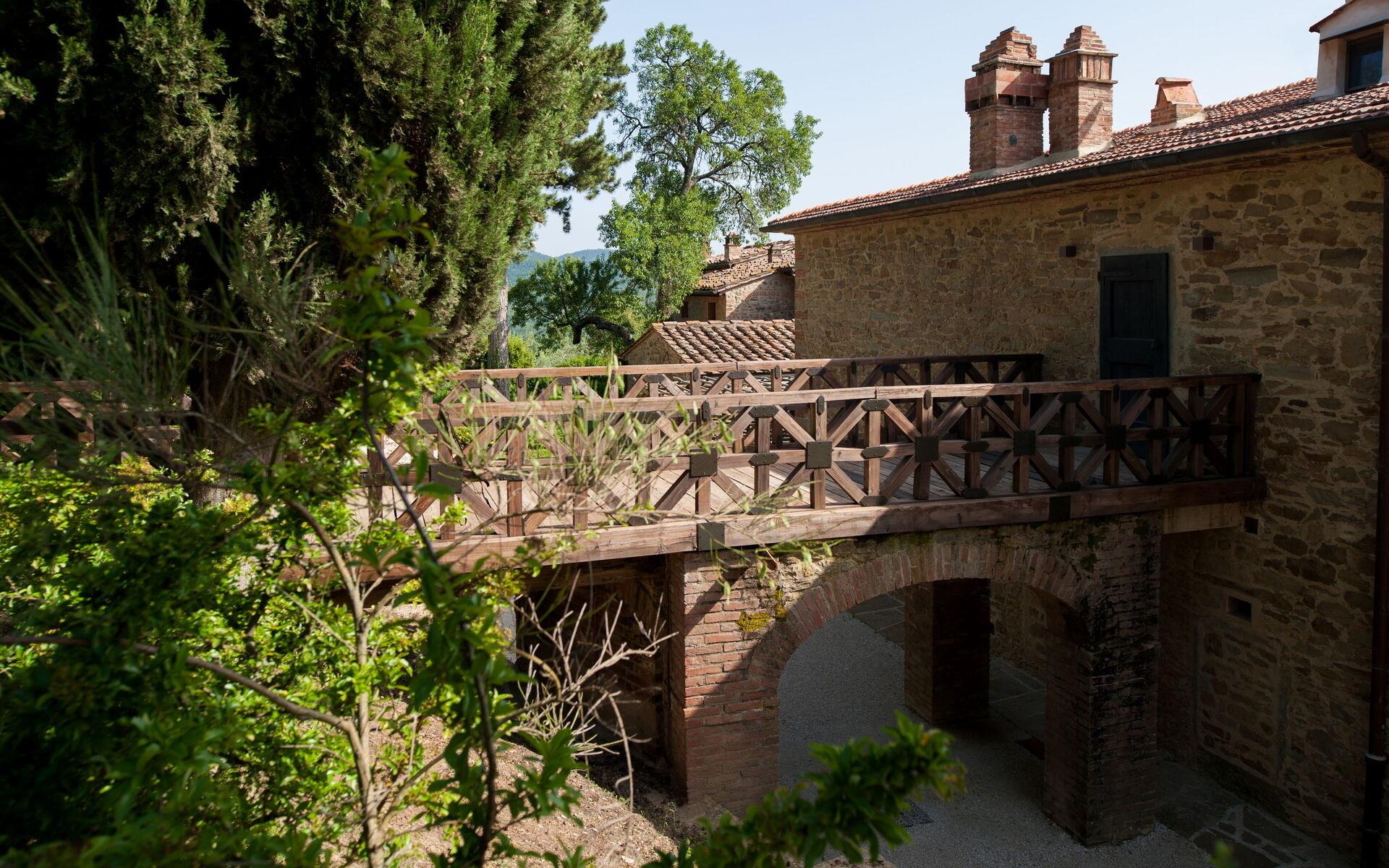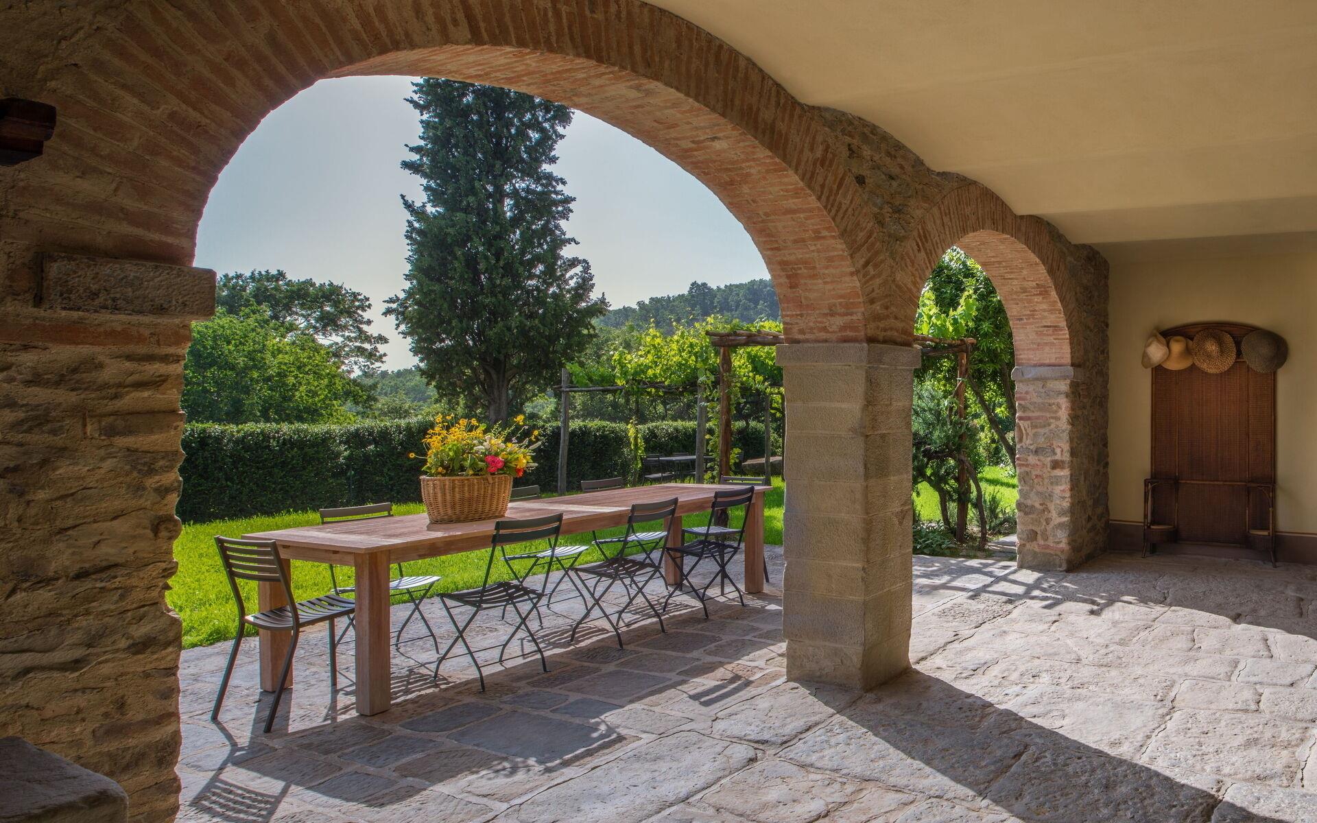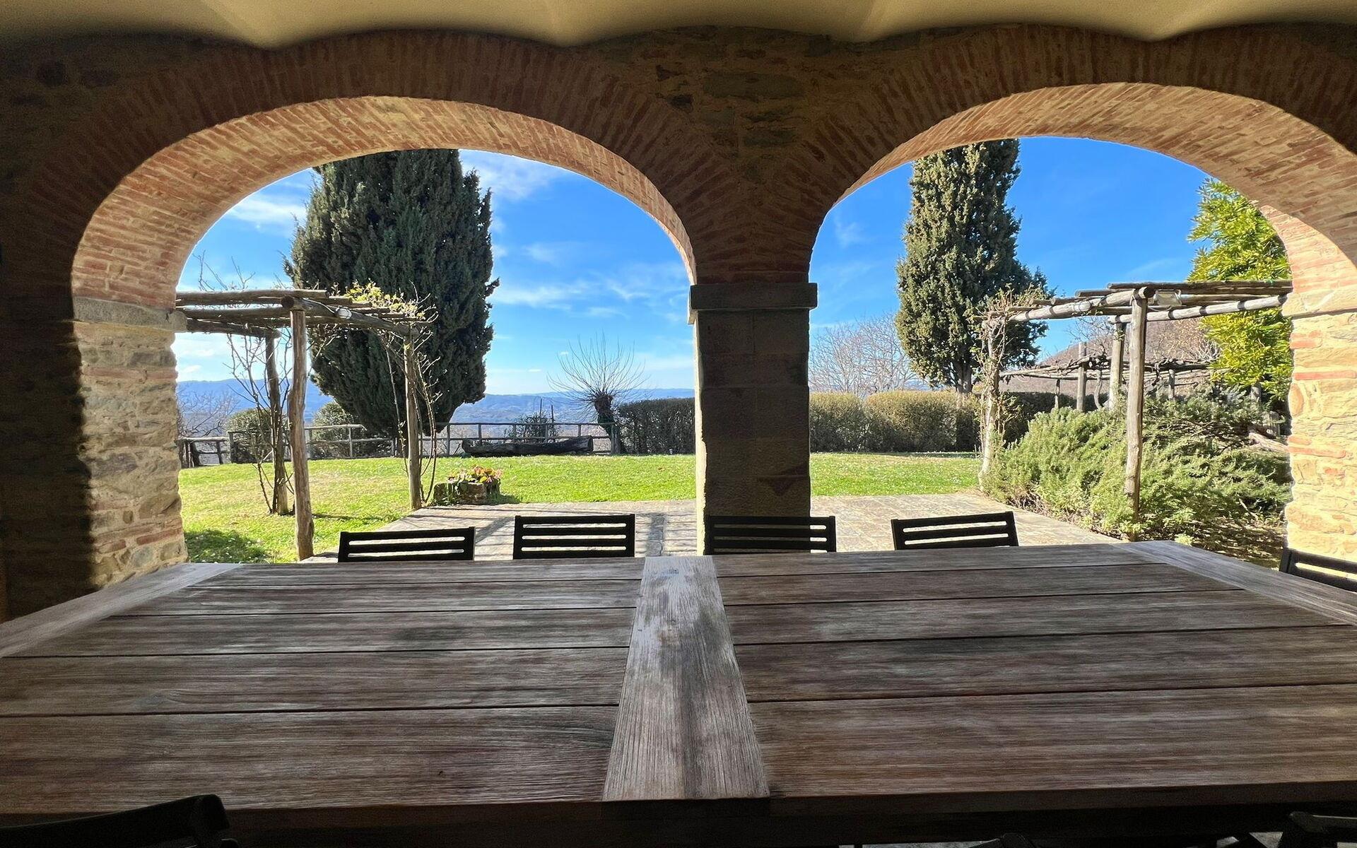 Von der offenen Loggia im Erdgeschoss gelangt man über eine Steintreppe in die geschlossene Loggia im ersten Stock, von der aus man auch im Winter einen herrlichen Blick auf das Tal und die Stadt Arezzo genießen kann.