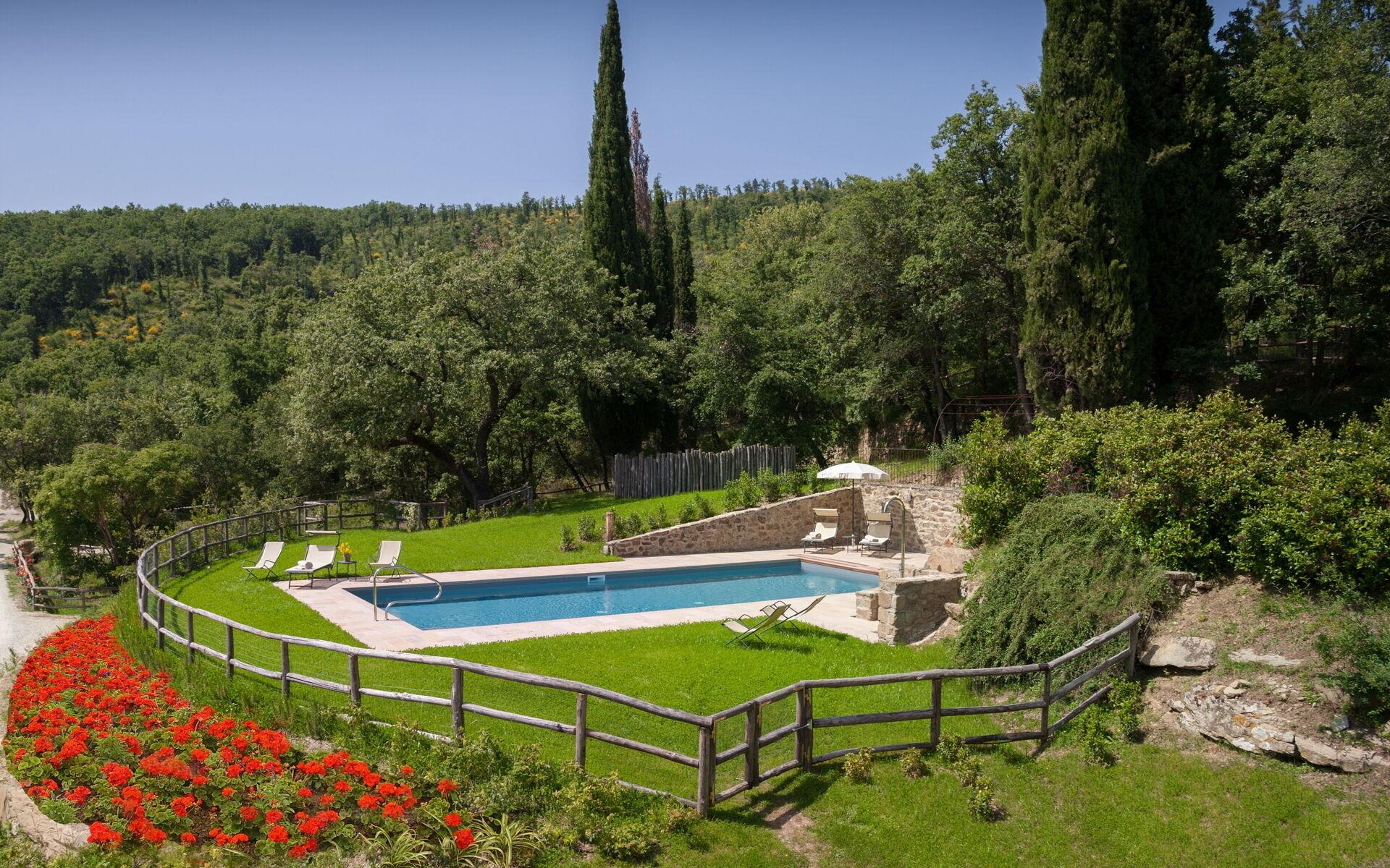Zwei weitere unabhängige Villen mit Schwimmbad und privaten Räumen befinden sich im gleichen Park. Das Äußere der Villa Arruns ist reich an Grün, mit Bäumen, Blumen und Sträuchern, die die Struktur umrahmen und den Hintergrund für diese schöne Steinvilla bilden. Das Schwimmbad (12 m x 5 m mit einer maximalen Tiefe von 1,30 m) mit Sonnenterrasse, ausgestattet mit Liegestühlen und Sonnenschirmen und komplett eingezäunt, steht Ihnen exklusiv zur Verfügung. Gegenüber der Villa befindet sich eine Loggia, die direkt in den Garten führt und mit einem Essbereich im Freien ausgestattet ist, um Ihre Mahlzeiten im Freien zu genießen. Die Lage der Villa Arruns ermöglicht es Ihnen, Wege für angenehme Spaziergänge zwischen den Weinbergen und Orte für Outdoor-Fitness innerhalb des Anwesens ausgestattet zu genießen.