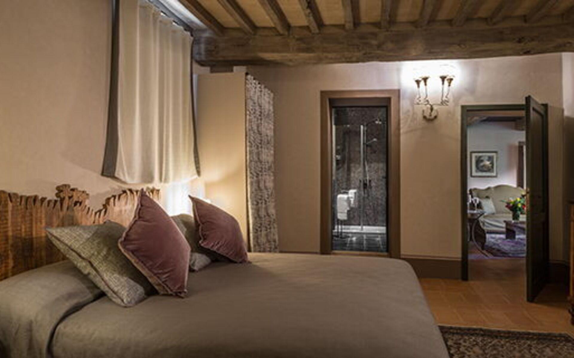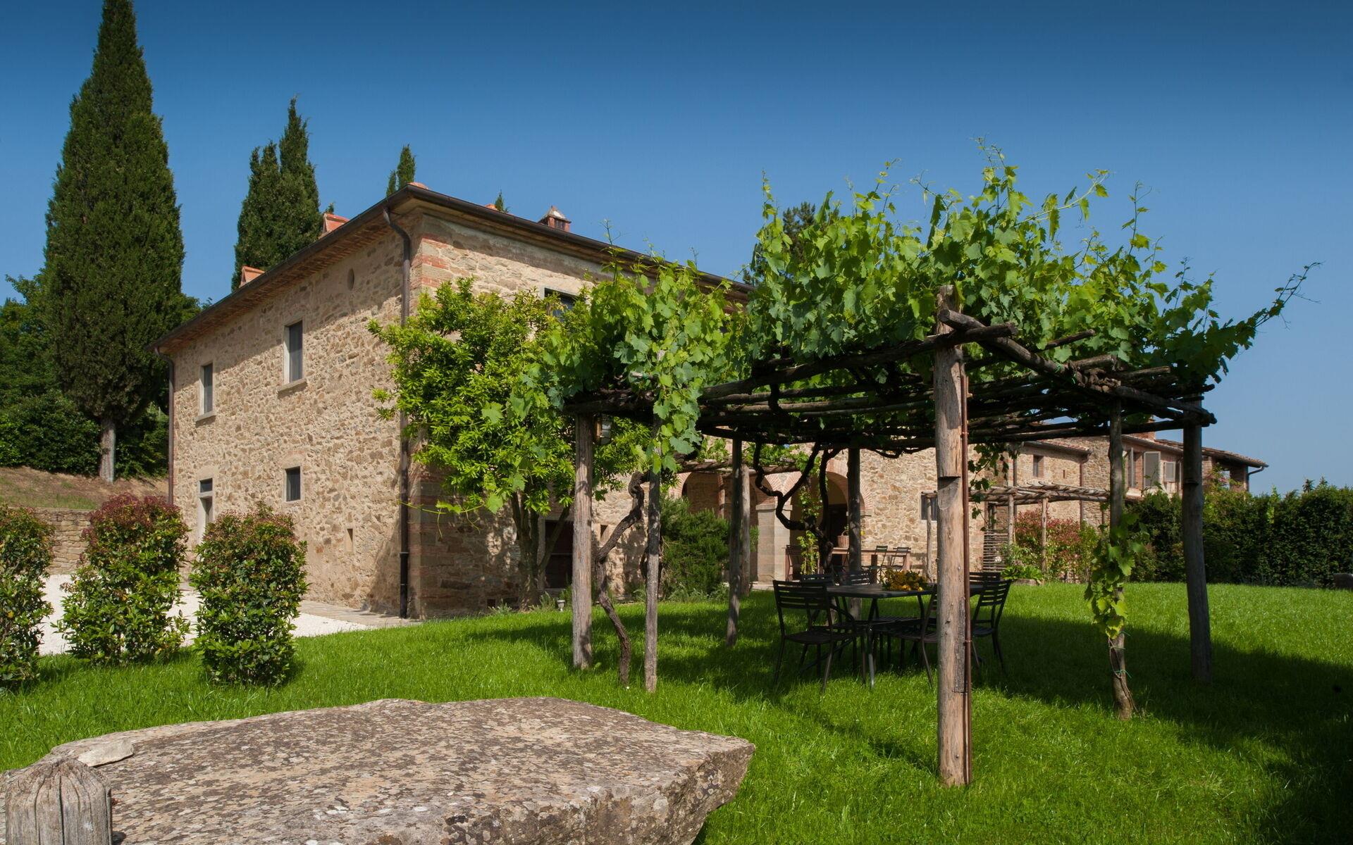 Nicht weit von Arezzo entfernt, in einer dominanten Position auf dem Tal, inmitten des Grüns der toskanischen Hügel, ist Villa Arruns der ideale Ort, um einen erholsamen Urlaub zu verbringen. Die Villa befindet sich neben dem Weingut des gleichen Anwesens und genießt ein eingezäuntes Gebiet von 17 Hektar, wo wir den Weinberg, den Keller und den Verkostungsraum finden.