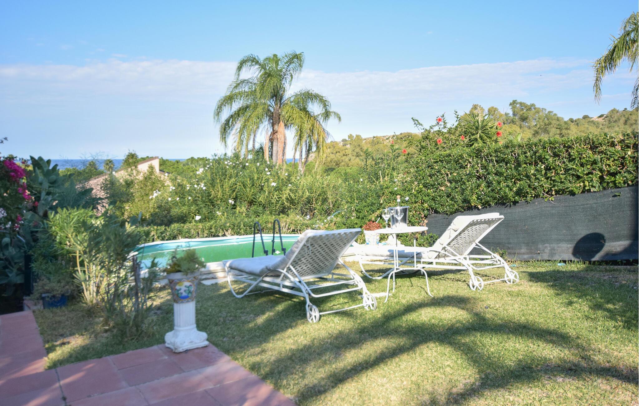 Dette feriehus kombinerer middelhavscharme med afslappende ro. Den store have byder på hyggelige siddeområder, liggestole ved poolen og overdækkede terrasser, der lægger op til at slappe af og nyde måltider under åben himmel.