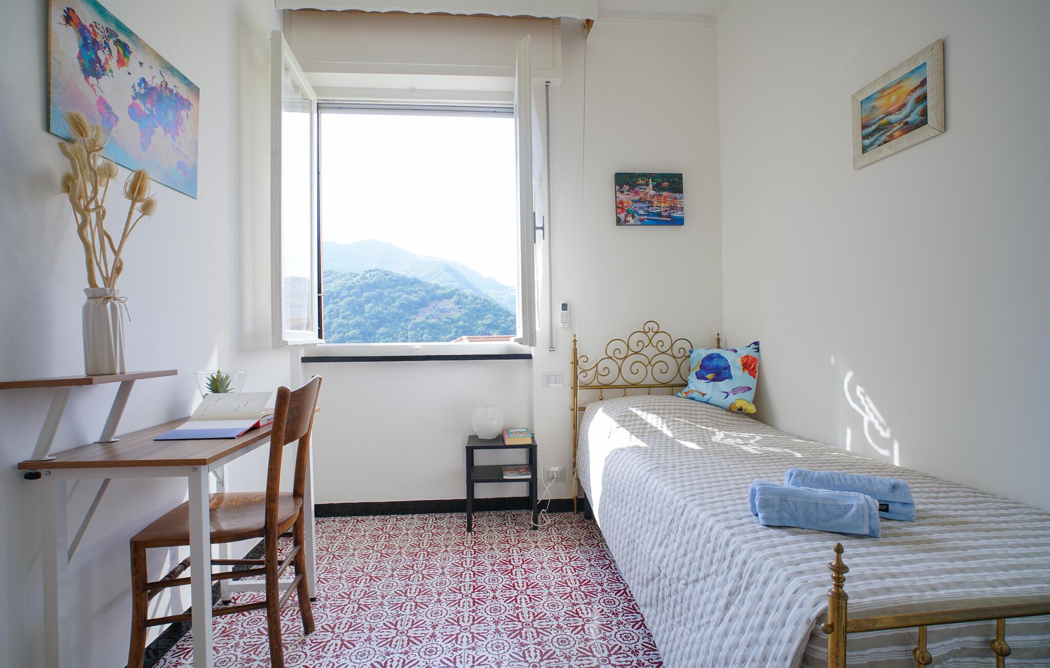 Denne store ferielejlighed i Avegno tilbyder jer en lys og indbydende atmosfære med talrige vinIer, der afslører en betagende panoramaudsigt over de grønne kystbakker. Den moderne indretning og gennemtænkte detaljer skaber en atmosfære, hvor I straks vil føle jer hjemme. Nyd den viInderlige udsigt fra alle værelser eller slap af i den rummelige panoramahave, som indbyder til at blive hængende med legeredskaber, spabad og en hyggelig terrasse. Her finder I alt hvad I behøver for en afslappet og behagelig ferie.