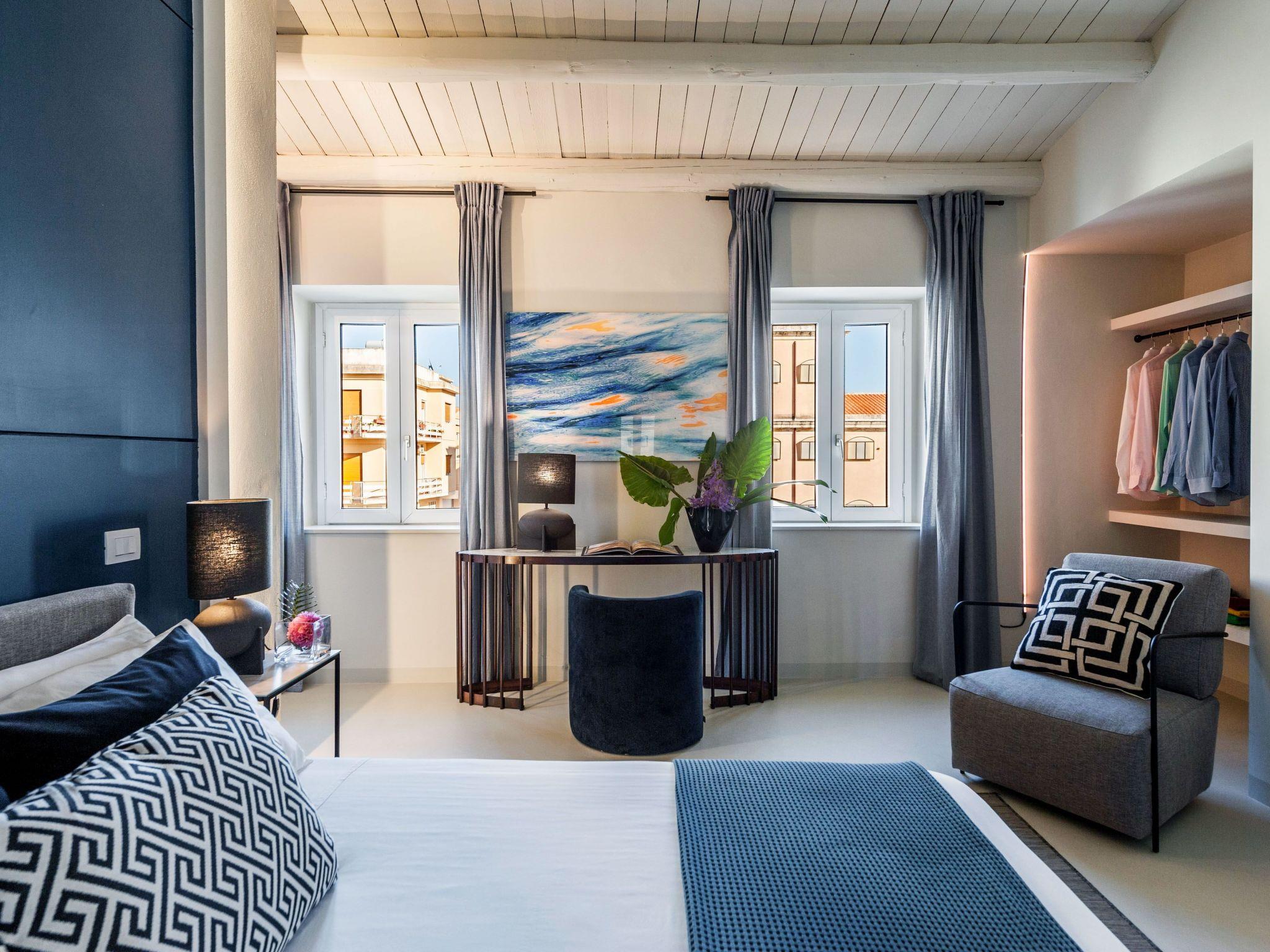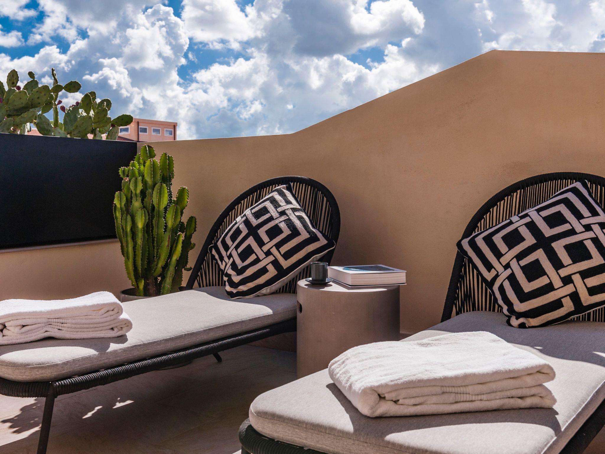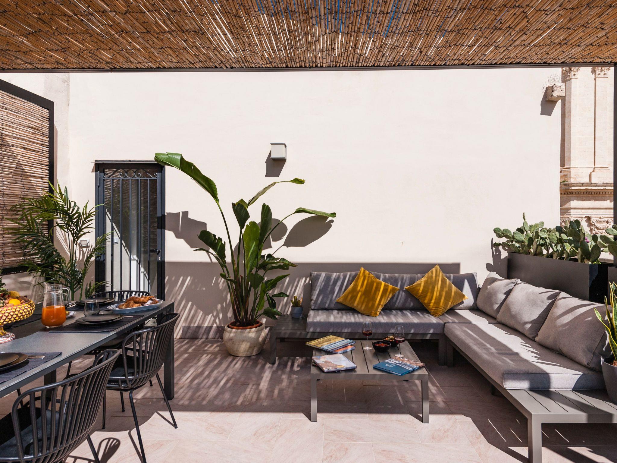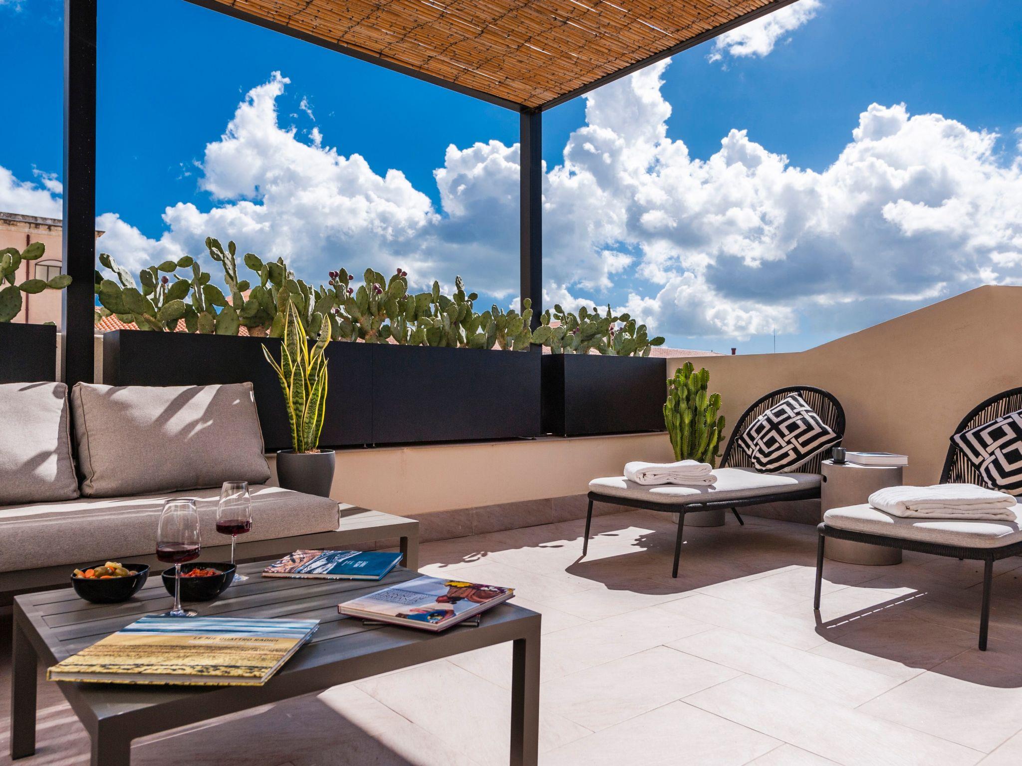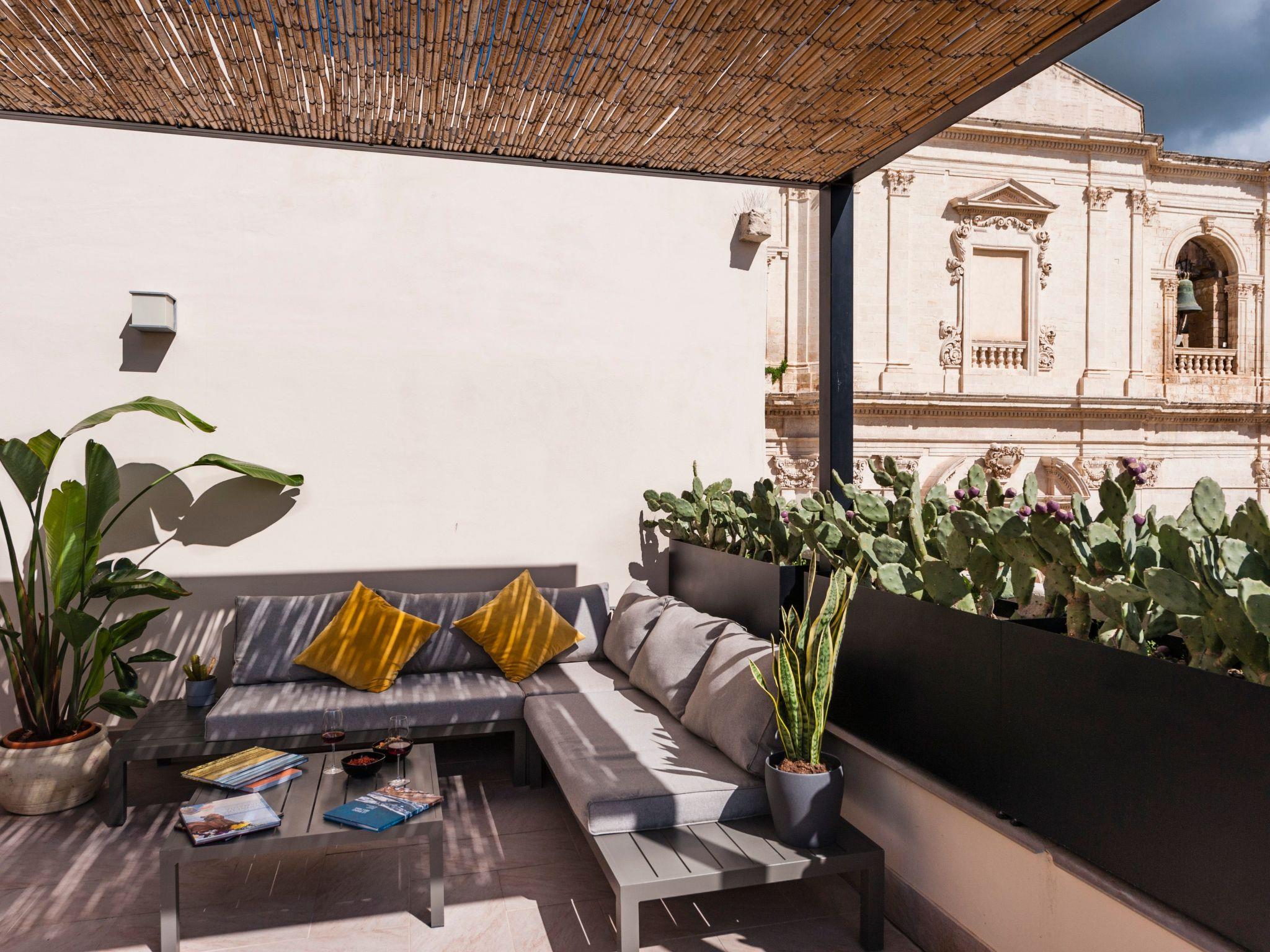 - A spectacular terrace > An intimate yet convivial space in the sky of Noto, offering a beautiful panorama of rooftops and the Baroque horizon. Here the light and warmth of the Sicilian sun become furnishing elements along with vases of prickly pears and traditional ceramics.