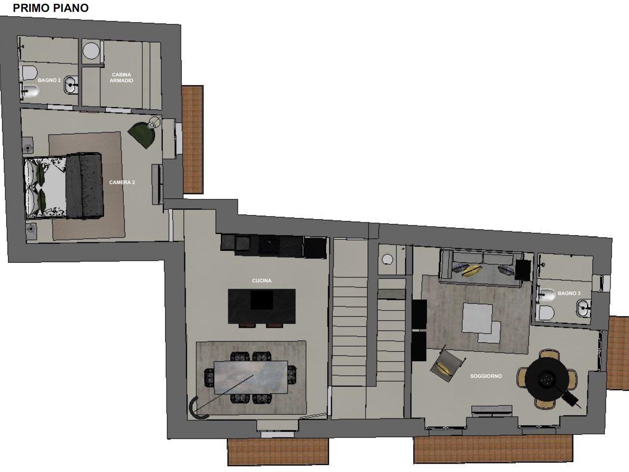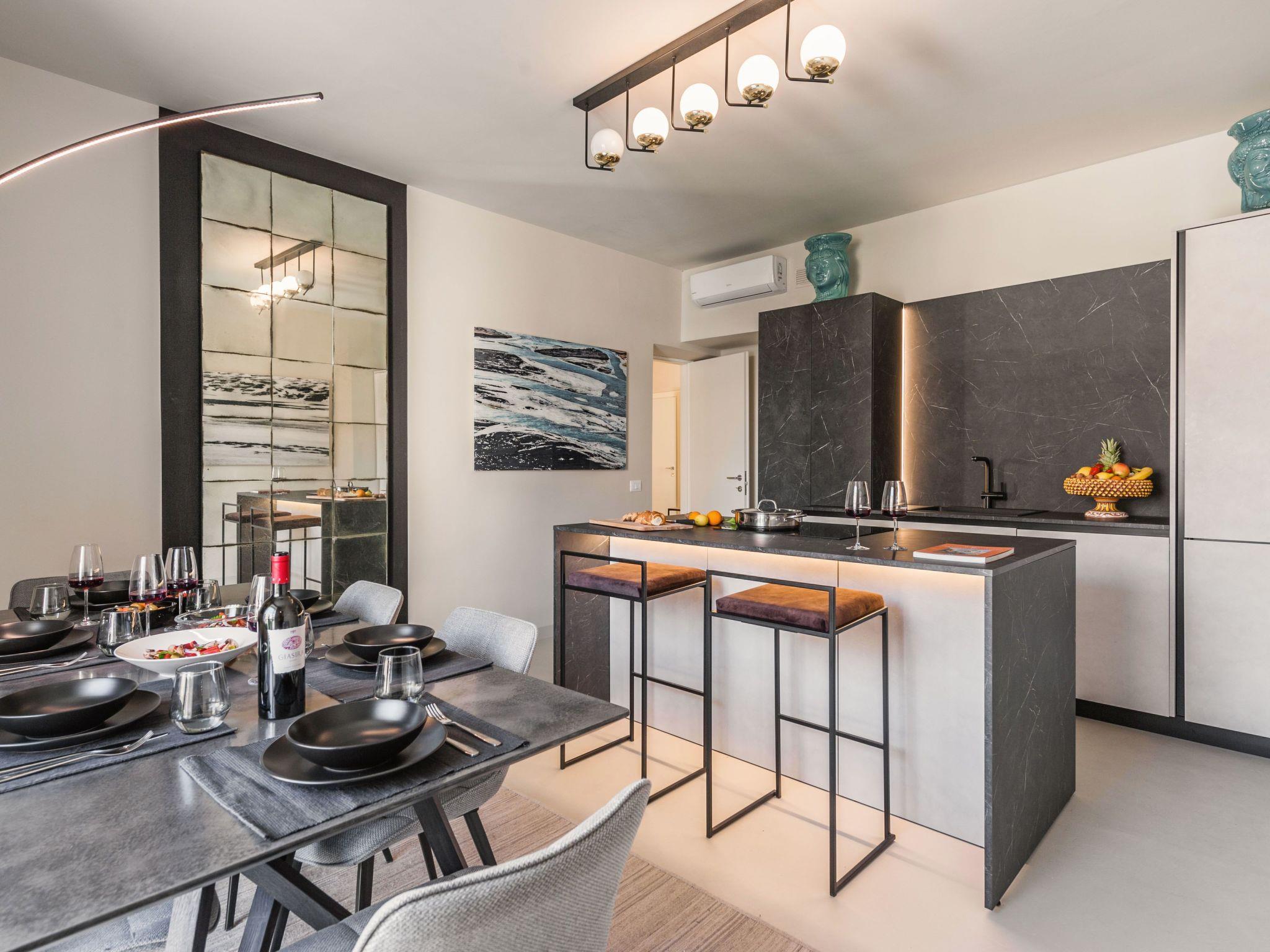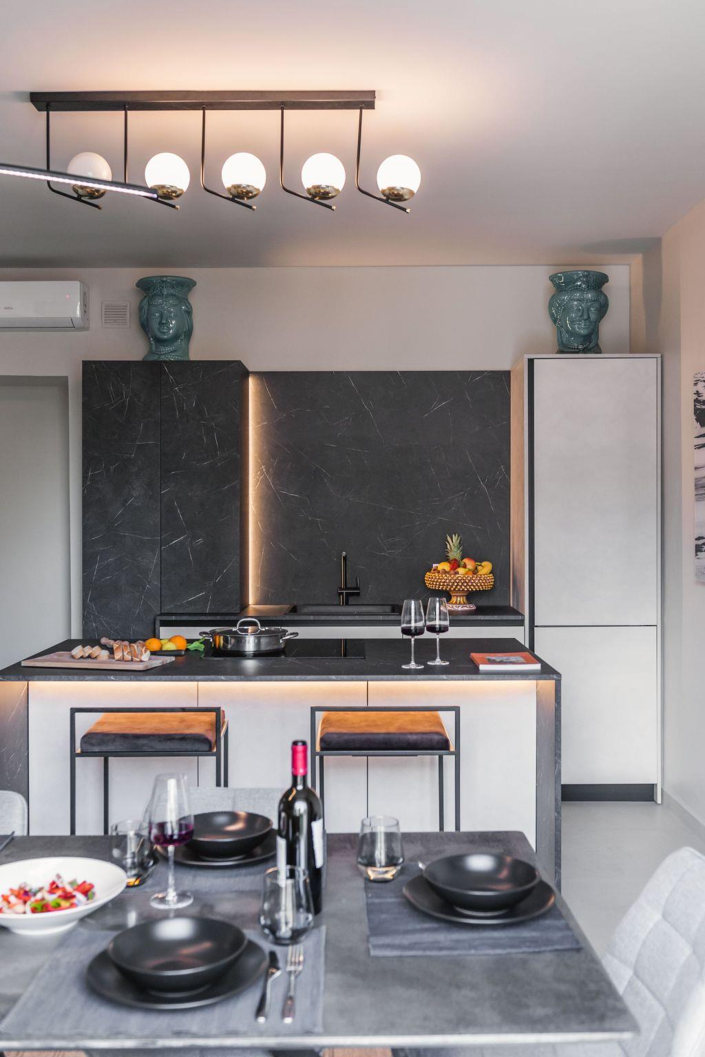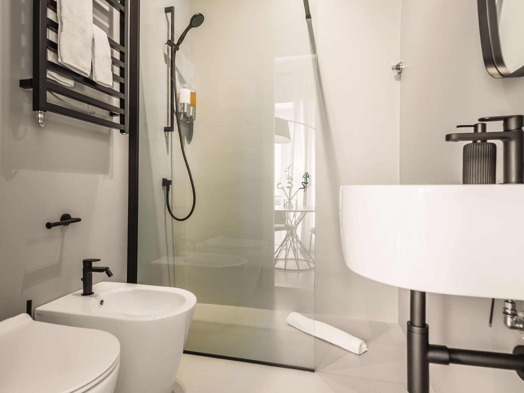 - on the first floor the kitchen equipped with everything you need to cook and eat in comfort; then the large and bright living area with a double sofa bed and bathroom; finally the "Green Room", a bedroom characterised by a soft minimal style, enriched by a bathroom and a walk-in wardrobe that also serves as a convenient laundry room complete with tumble dryer and iron;-