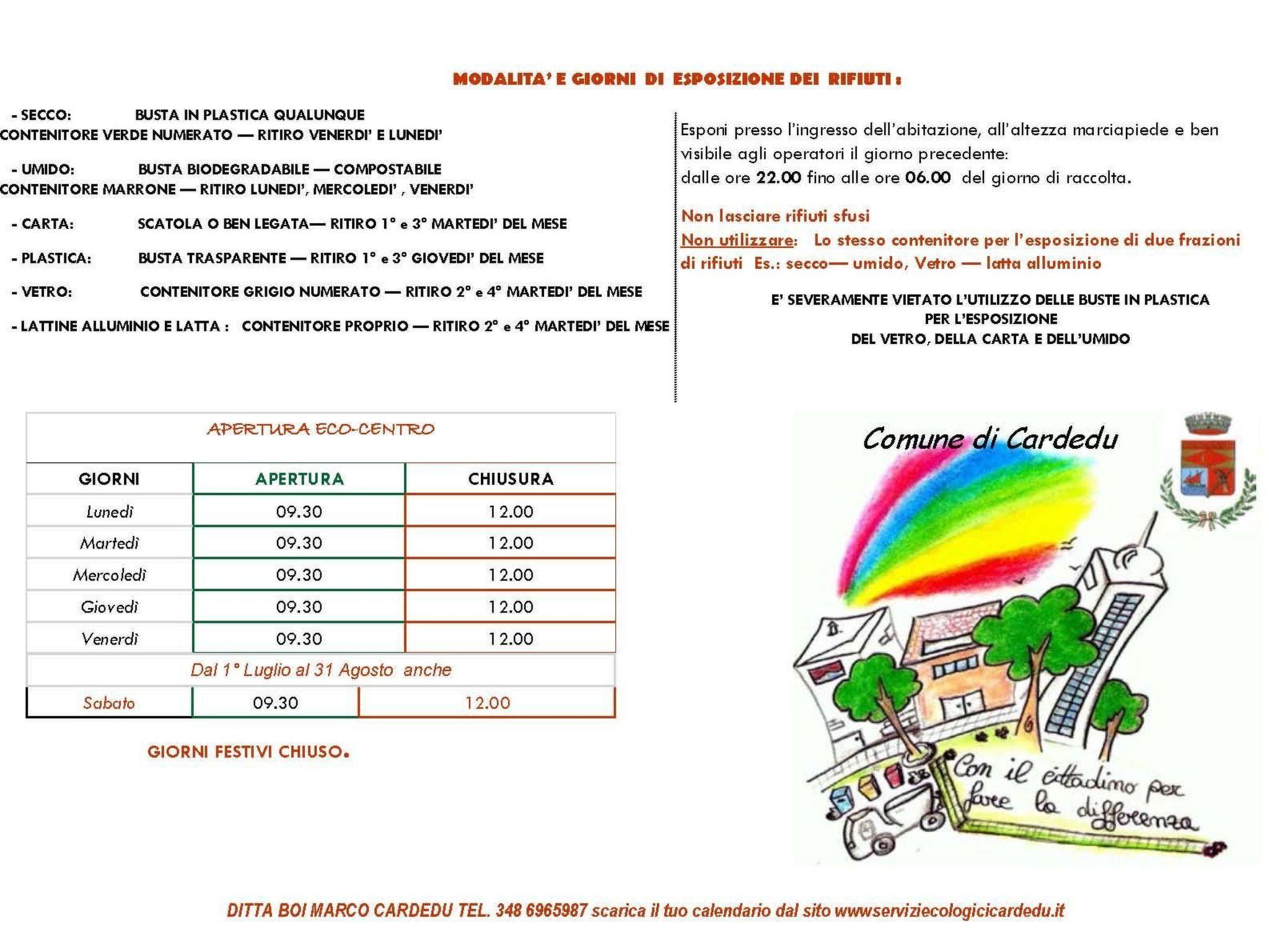 The owners live in the same house. Rubbish is separated in Cardedu: the flat has several bins for plastic, paper, glass, organic and general waste. The bags have to be disposed of in respective bins at the end of the street. Cardedu has several shops, a cheese factory and restaurants. It is at the foot of the Tacchi nature reserve in Ogliastra. Jerzu, the town of Cannonau wine, and the port of Arbatax are only a 15-minute drive away. There are boats from there to the beautiful bays of the Gulf of Orosei. You can enjoy various water sports on the beach at Cardedu, such as kite surfing or water skiing. It is also possible to go hiking, cave exploring or go-karting.In the municipality of Cardedu there is separate waste collection, the customer has to sort the waste (paper, plastic, glass, wet, aluminium, and undifferentiated). Wet and undifferentiated waste must be displayed outside the flat, on the days specified in the waste calendar, with the entire container in a closed envelope.