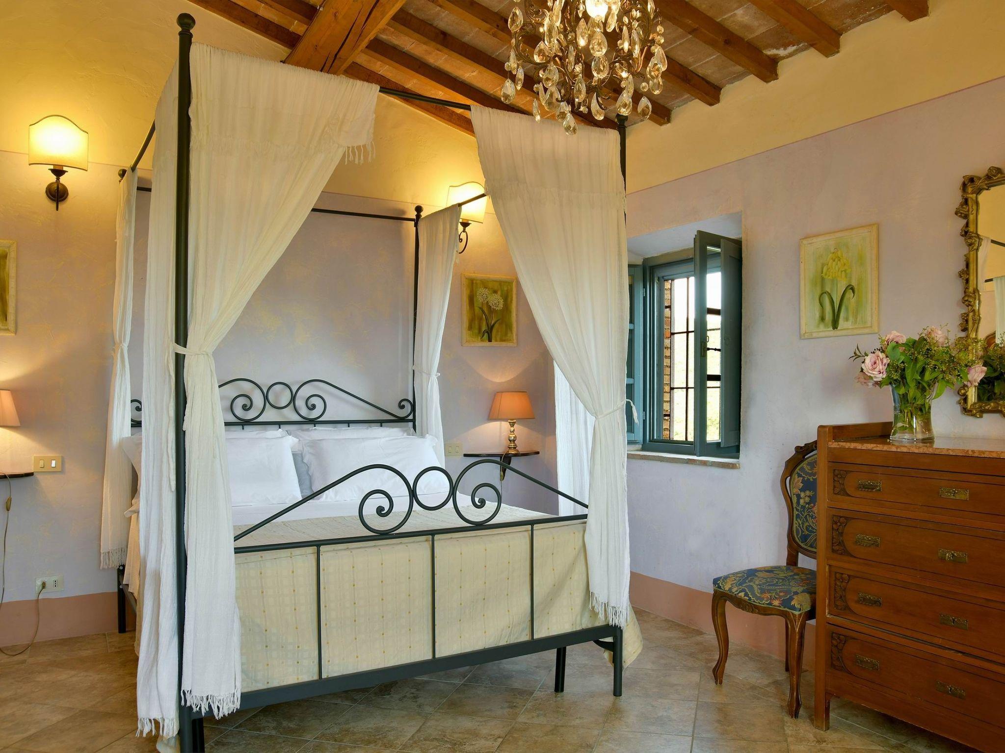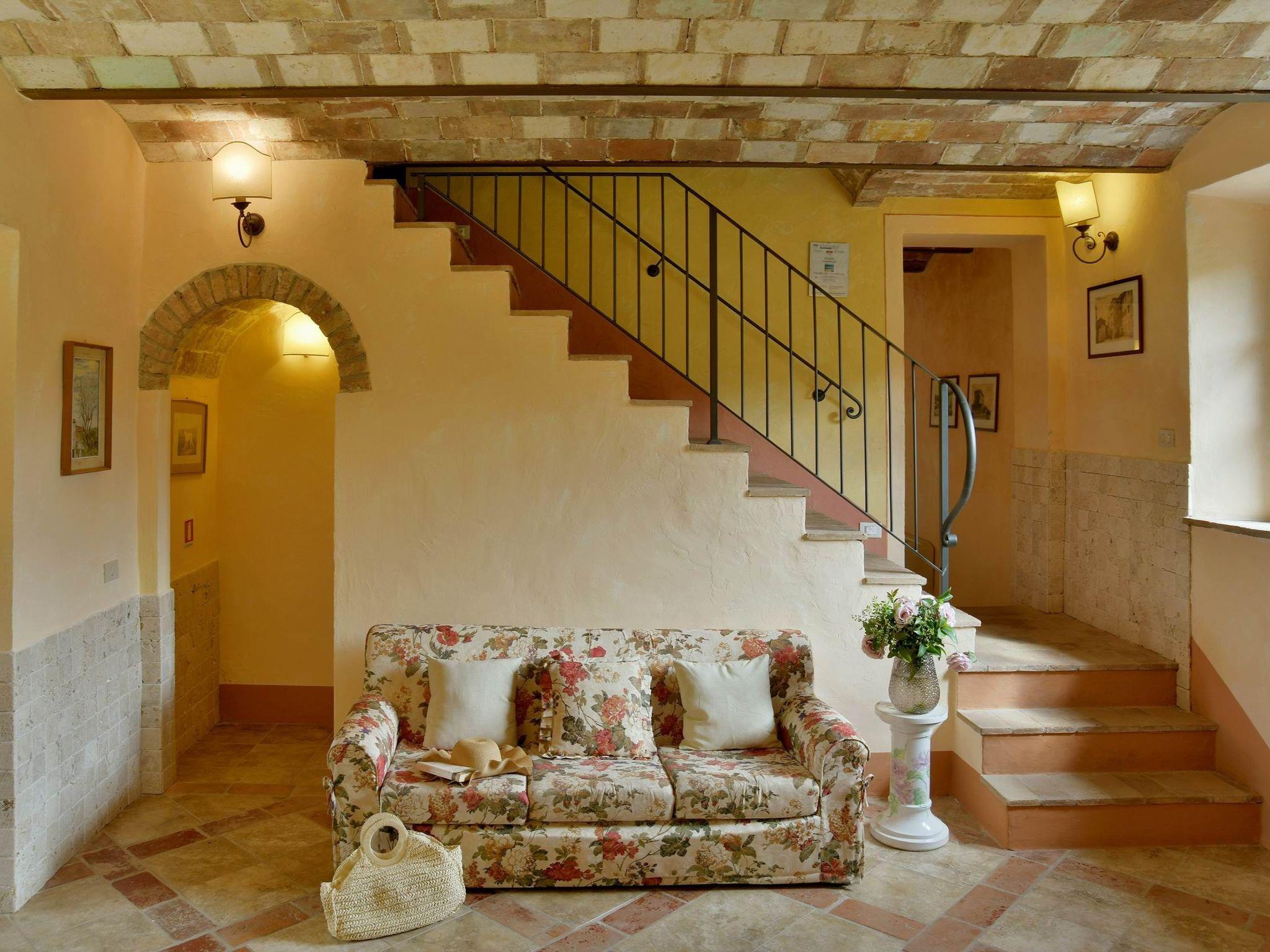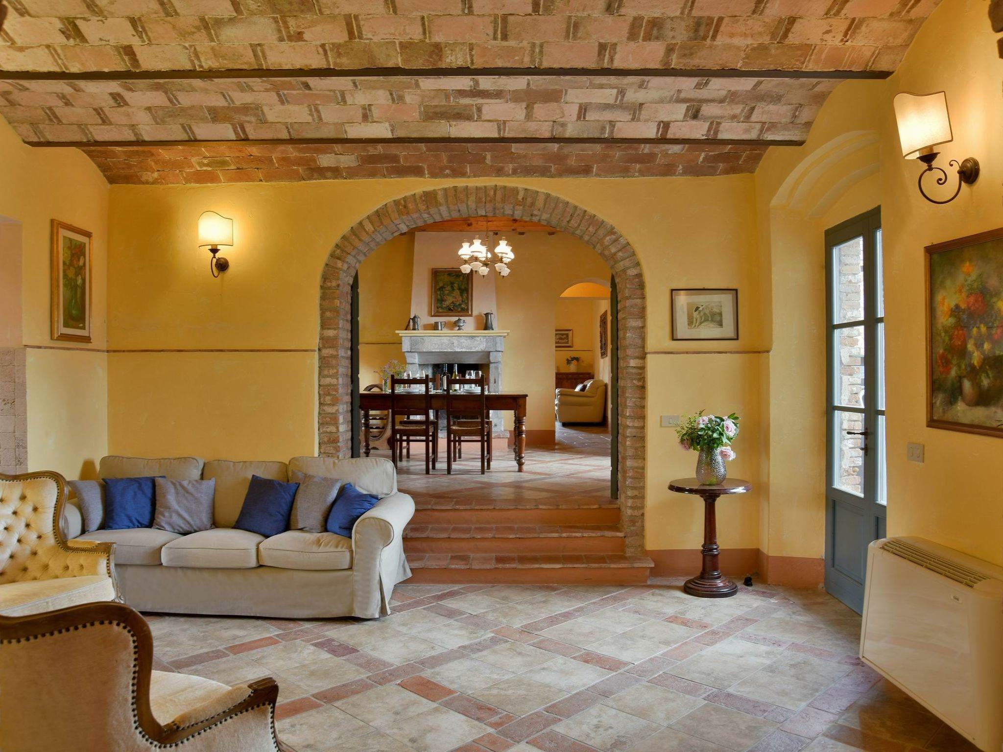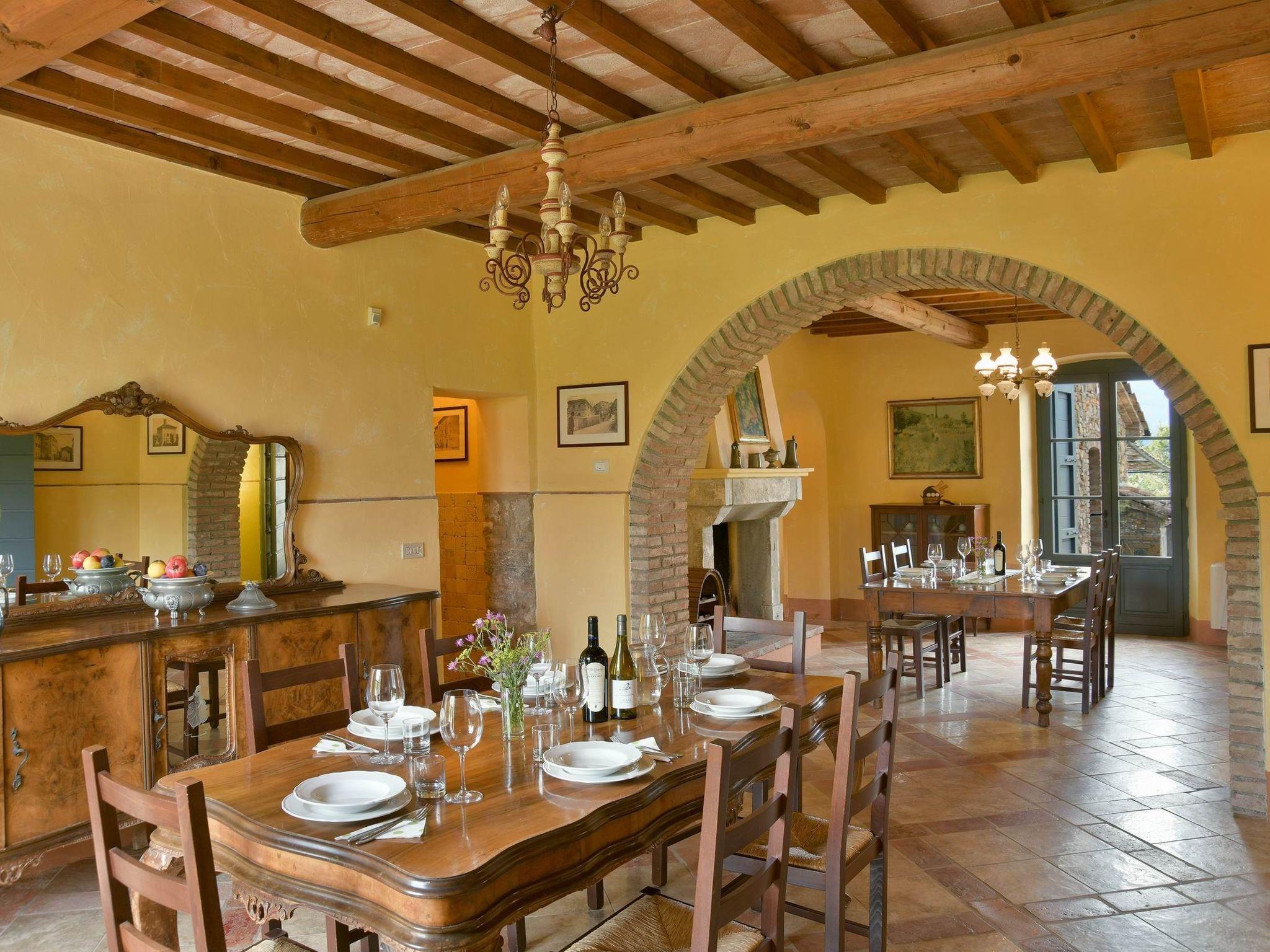 The villa, measuring approximately 500 square metres, is located in a very quiet area, spread over two floors and can accommodate up to 20 people in 9 air-conditioned bedrooms, all with private bathrooms. The interiors of the villa preserve the original architecture of Tuscan farmhouses, with vaulted ceilings and warm, cosy colours.
