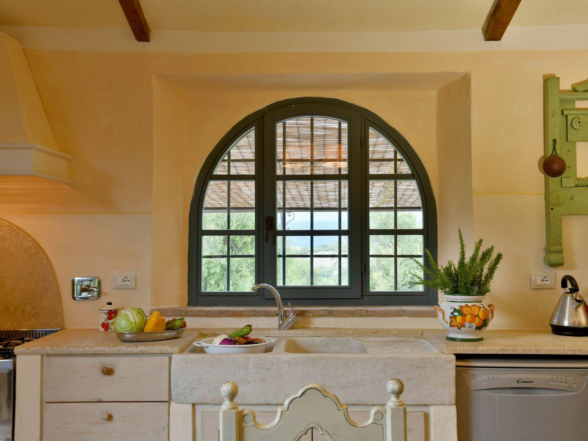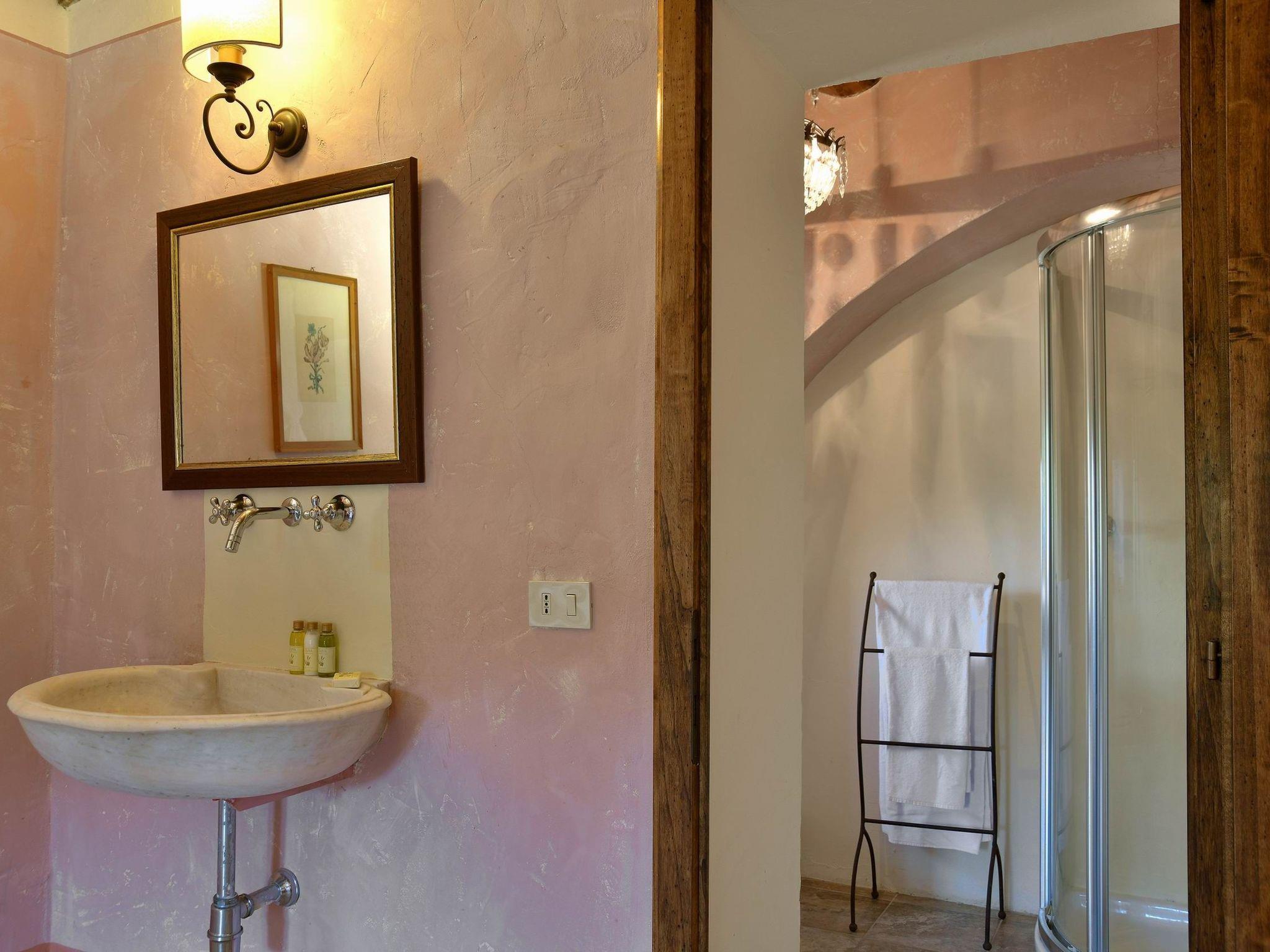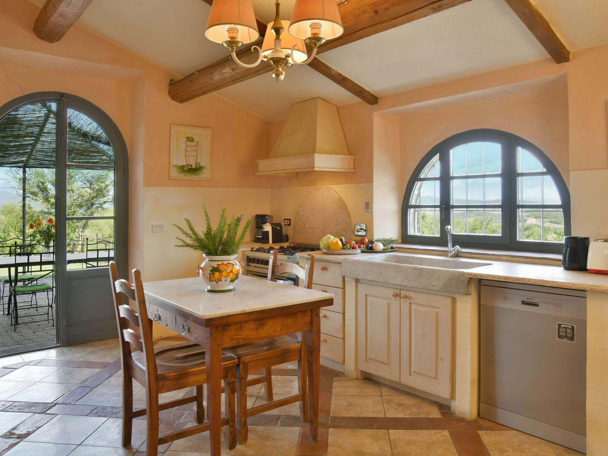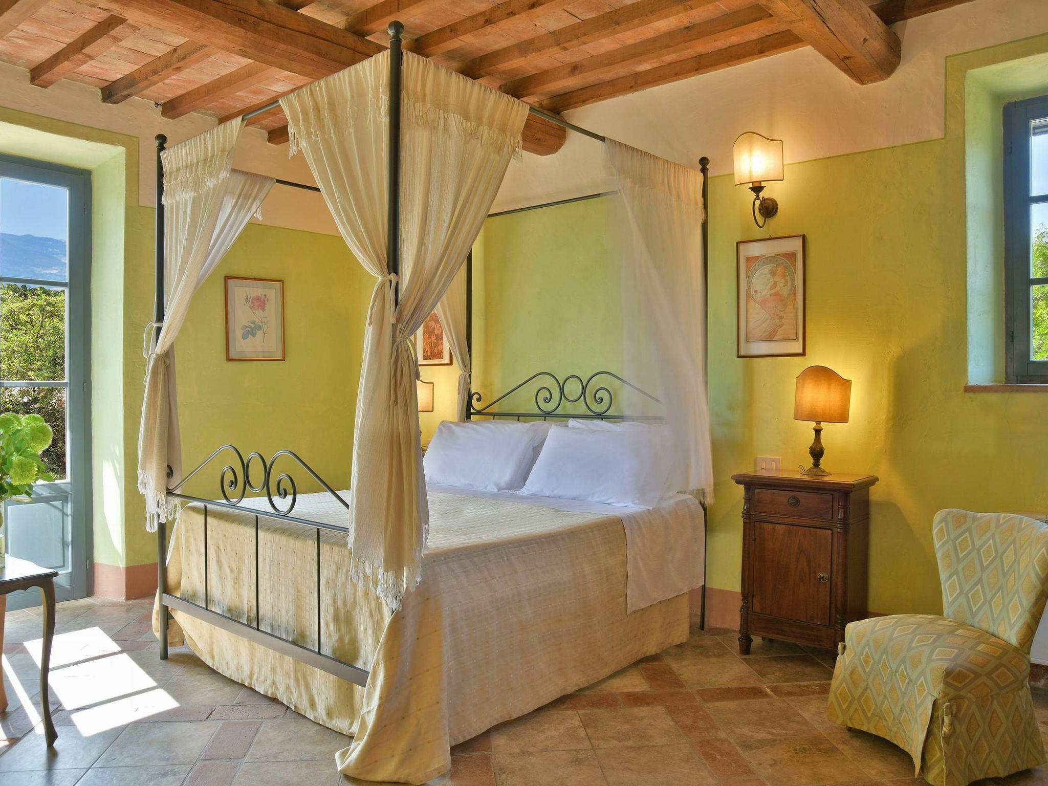 The villa, measuring approximately 500 square metres, is located in a very quiet area, spread over two floors and can accommodate up to 20 people in 9 air-conditioned bedrooms, all with private bathrooms. The interiors of the villa preserve the original architecture of Tuscan farmhouses, with vaulted ceilings and warm, cosy colours.