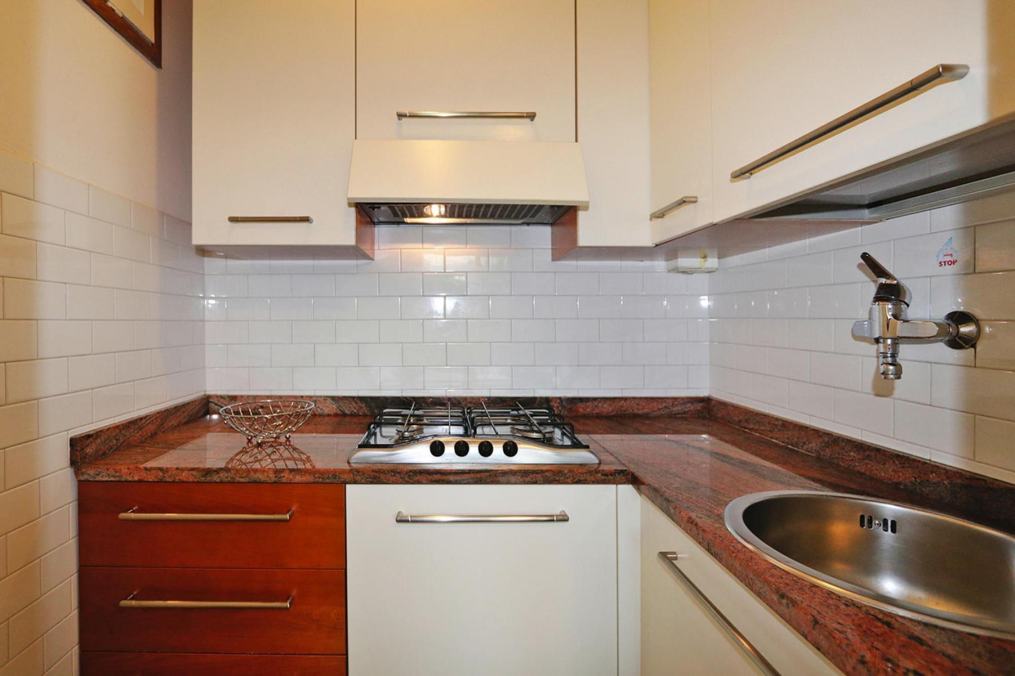 Tekøkken(kogeplade(Komfur med tre kogeplader, gas), kaffemaskine, mikrobølgeovn, køle-fryseskab), stue / spisestue(Fjernsyn), soveværelse(enkeltseng, enkeltseng, enkeltseng), soveniche(dobbeltseng), badeværelse(bruser, toilet, bidet), balkon, havemøbler, parkering, elevator, baby crib(paid)