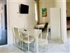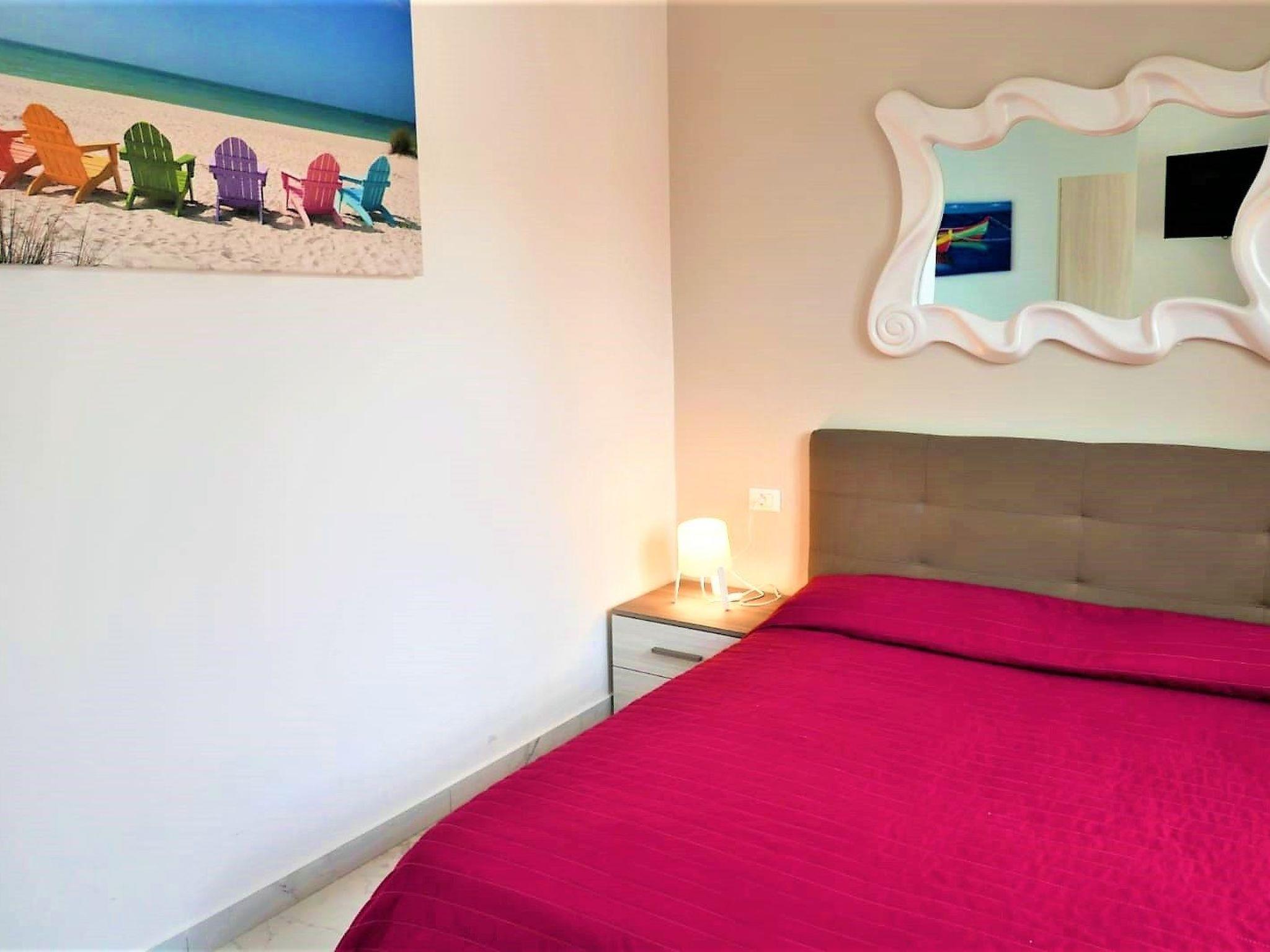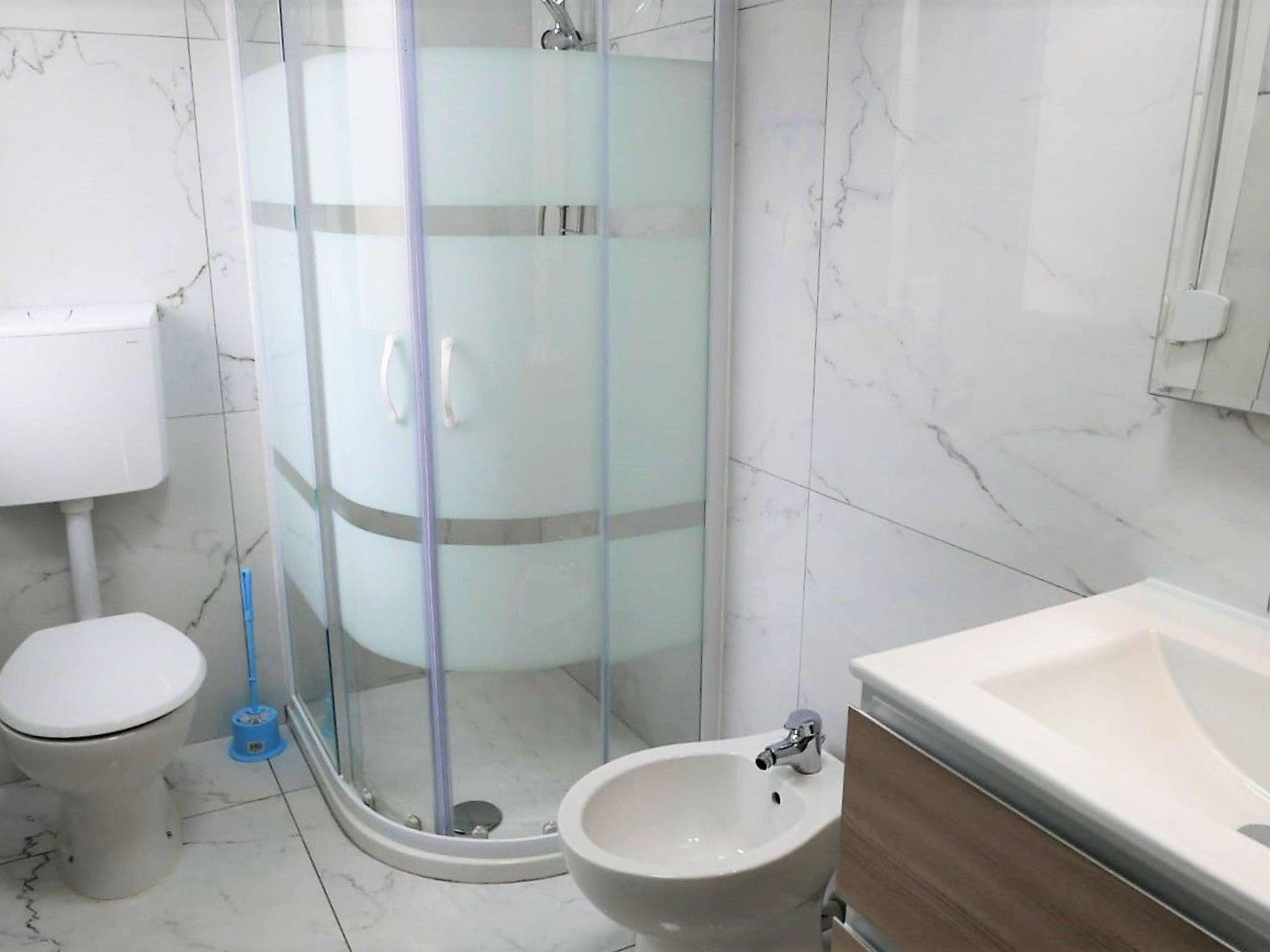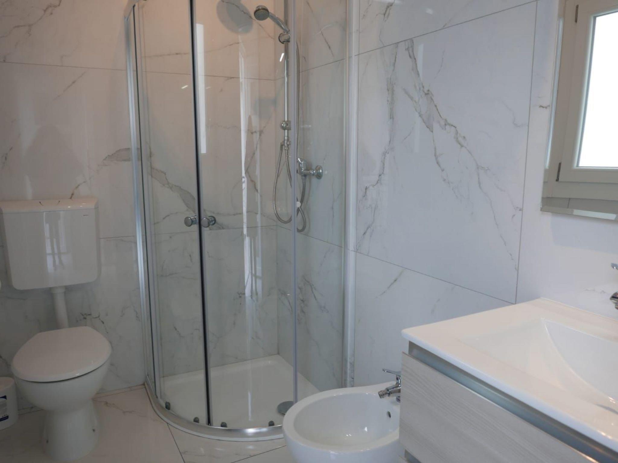 The flat, located on the second floor, opens onto a bright living area with French doors leading to a habitable balcony. The open space includes a living room with a double sofa bed, a dining area with a table for six and an open kitchen, equipped with a refrigerator with separate freezer compartment, a ventilated oven, microwave and all the necessary accessories for cooking comfortably.