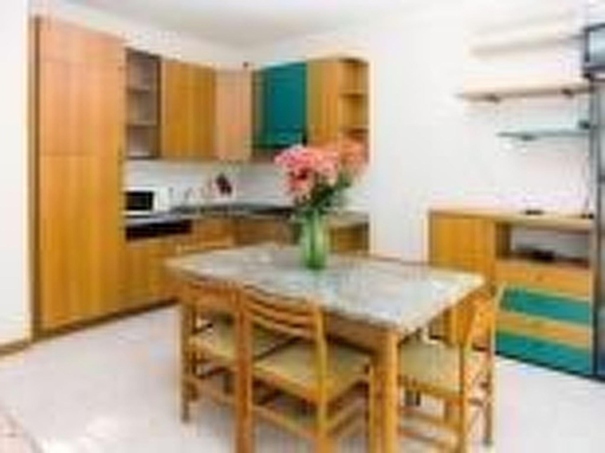 The three-room flat, located on the first floor, is bright and partially air-conditioned. It has a living room with an open gas kitchen, a dining area with seating for six and a double sofa bed. The accommodation also includes two bedrooms, one with a double bed, one with two single beds and a bathroom with shower cubicle, furnished and equipped with TV.