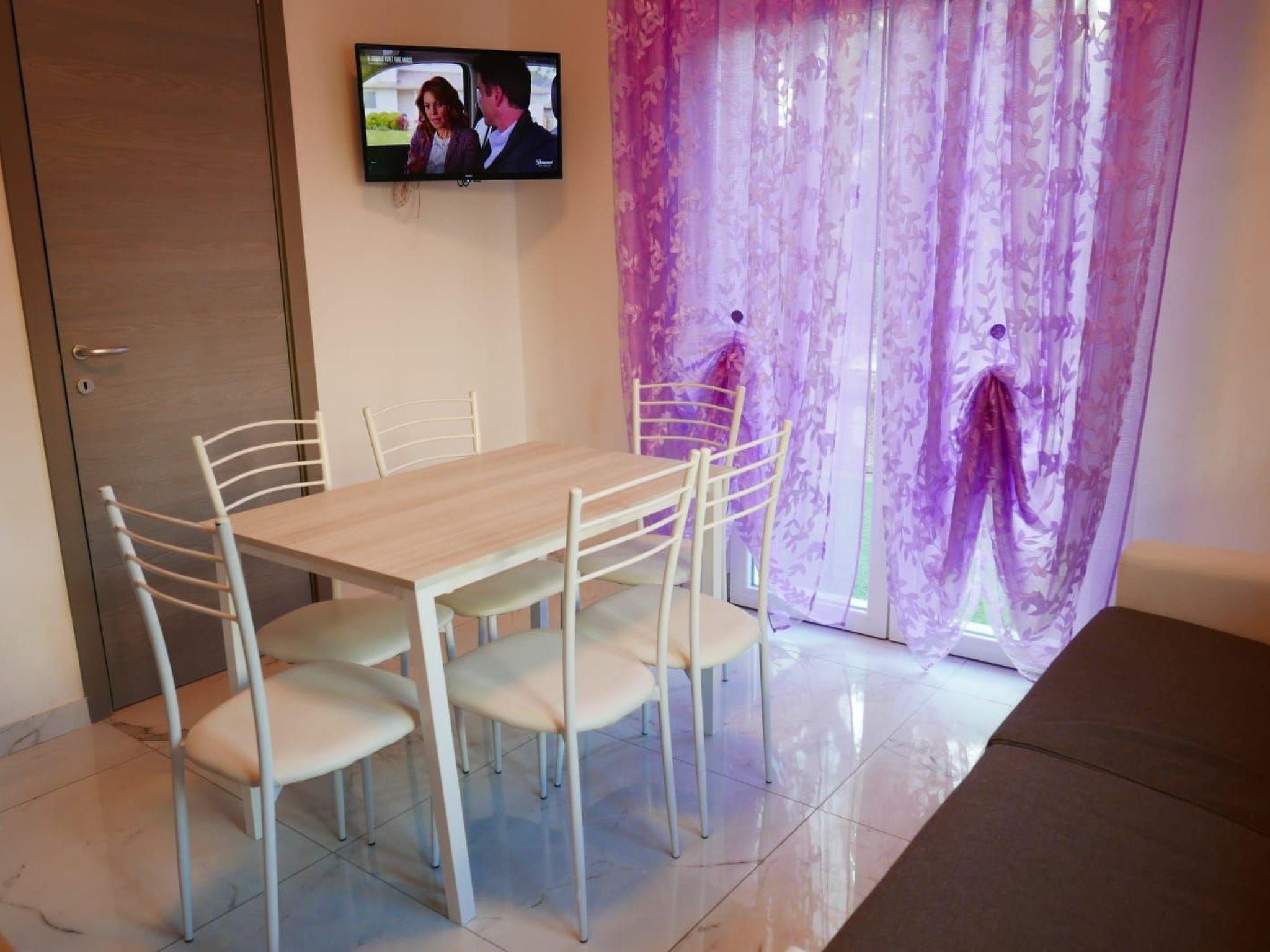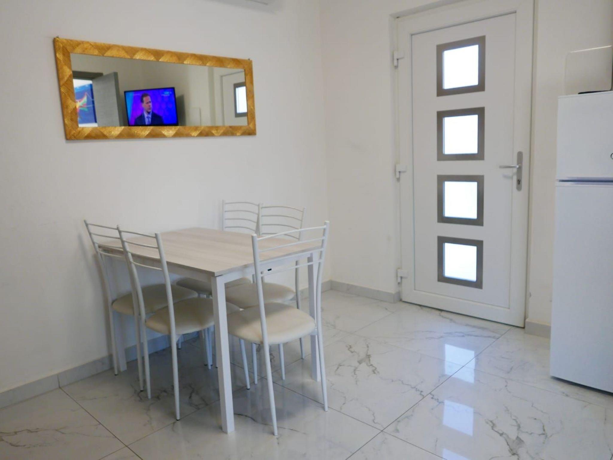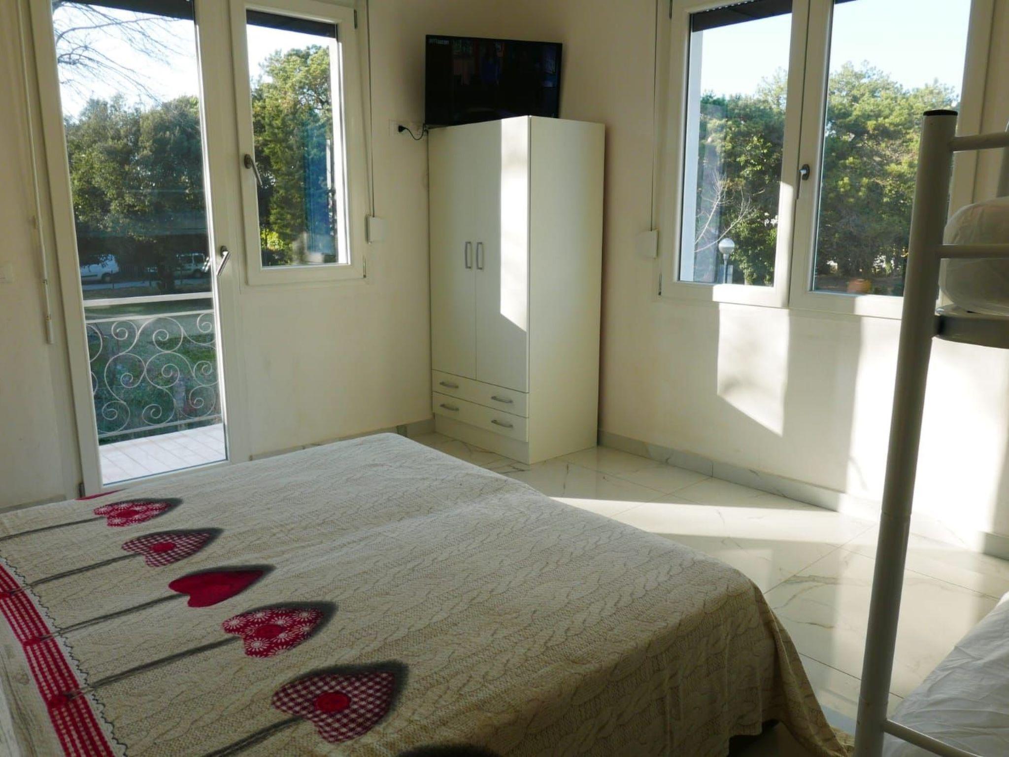 The entrance opens onto a bright living area with French window leading to a habitable balcony. The open-plan environment includes a living room with a double sofa bed, dining area with a table seating six and an open-plan kitchen equipped with electrical appliances: refrigerator with separate freezer compartment, ventilated oven, microwave oven and all the equipment necessary for cooking with comfort.