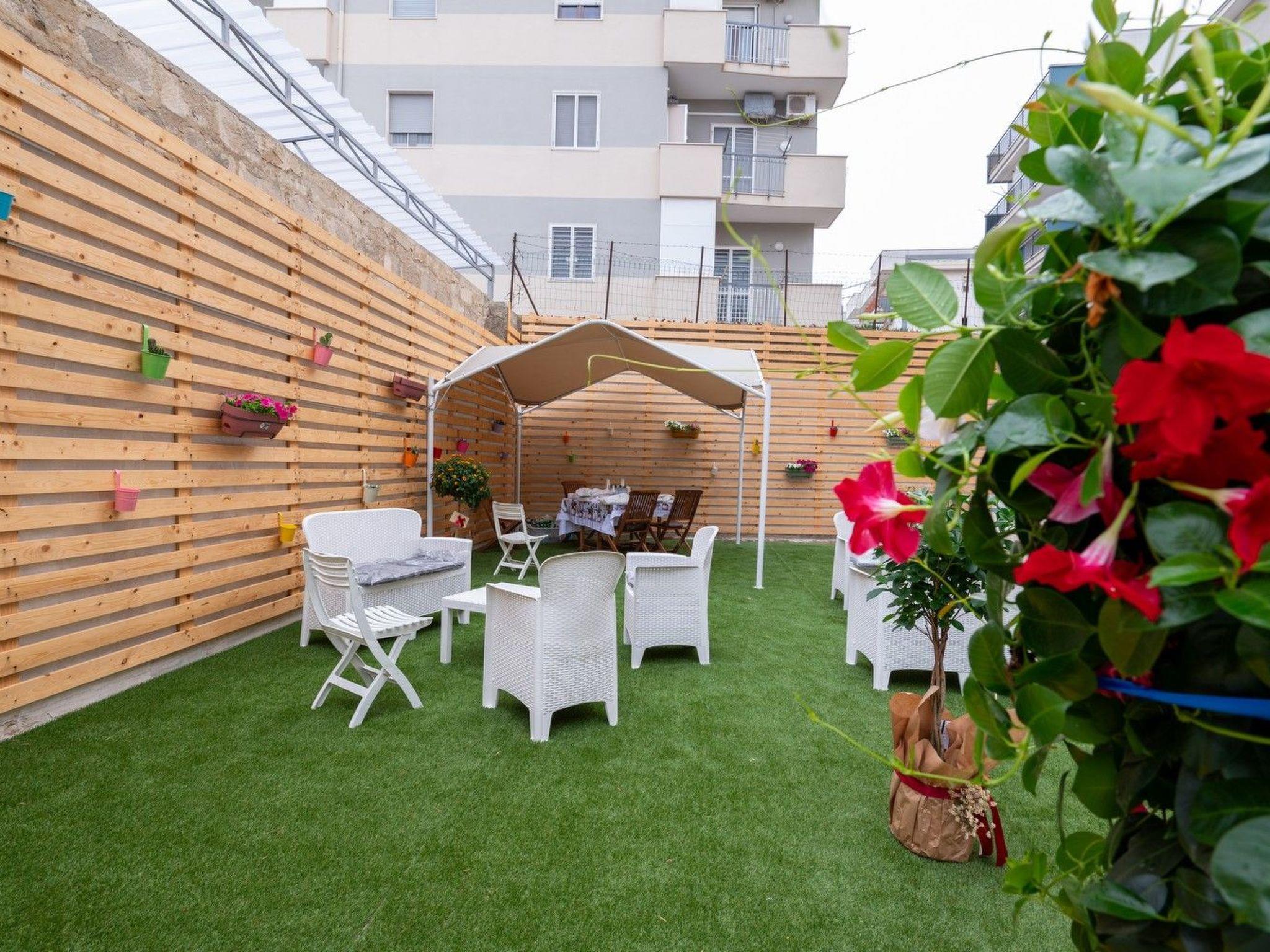 The exterior of the flat is enhanced by an attractive loggia, furnished with tables and loungers, perfect for relaxing outdoors. The large, well-kept garden is for communal use, offering a cosy green space where you can relax. Although barbecues are not permitted, the outdoor area remains an ideal place to enjoy peaceful evenings under the starry Bisceglie sky.