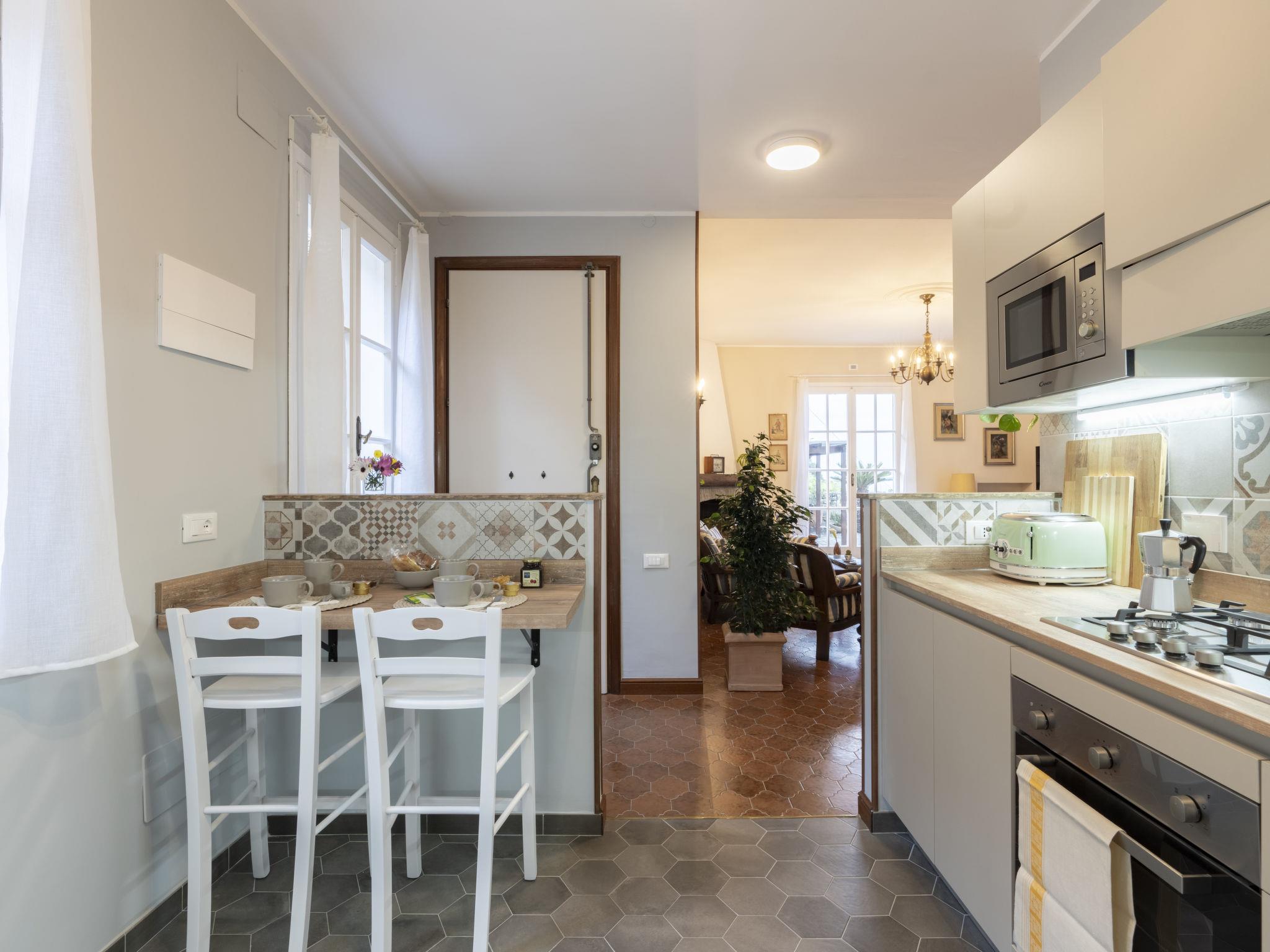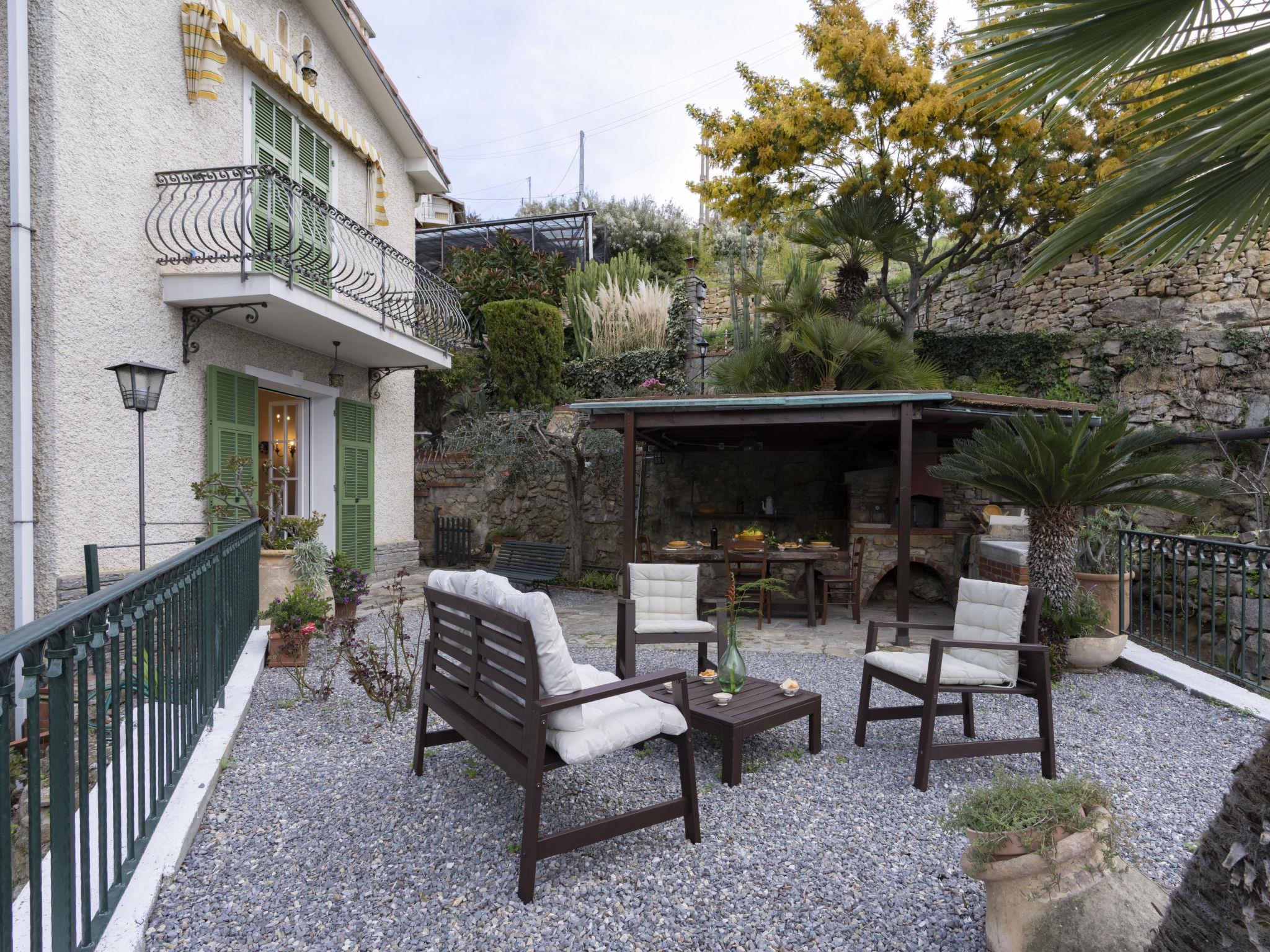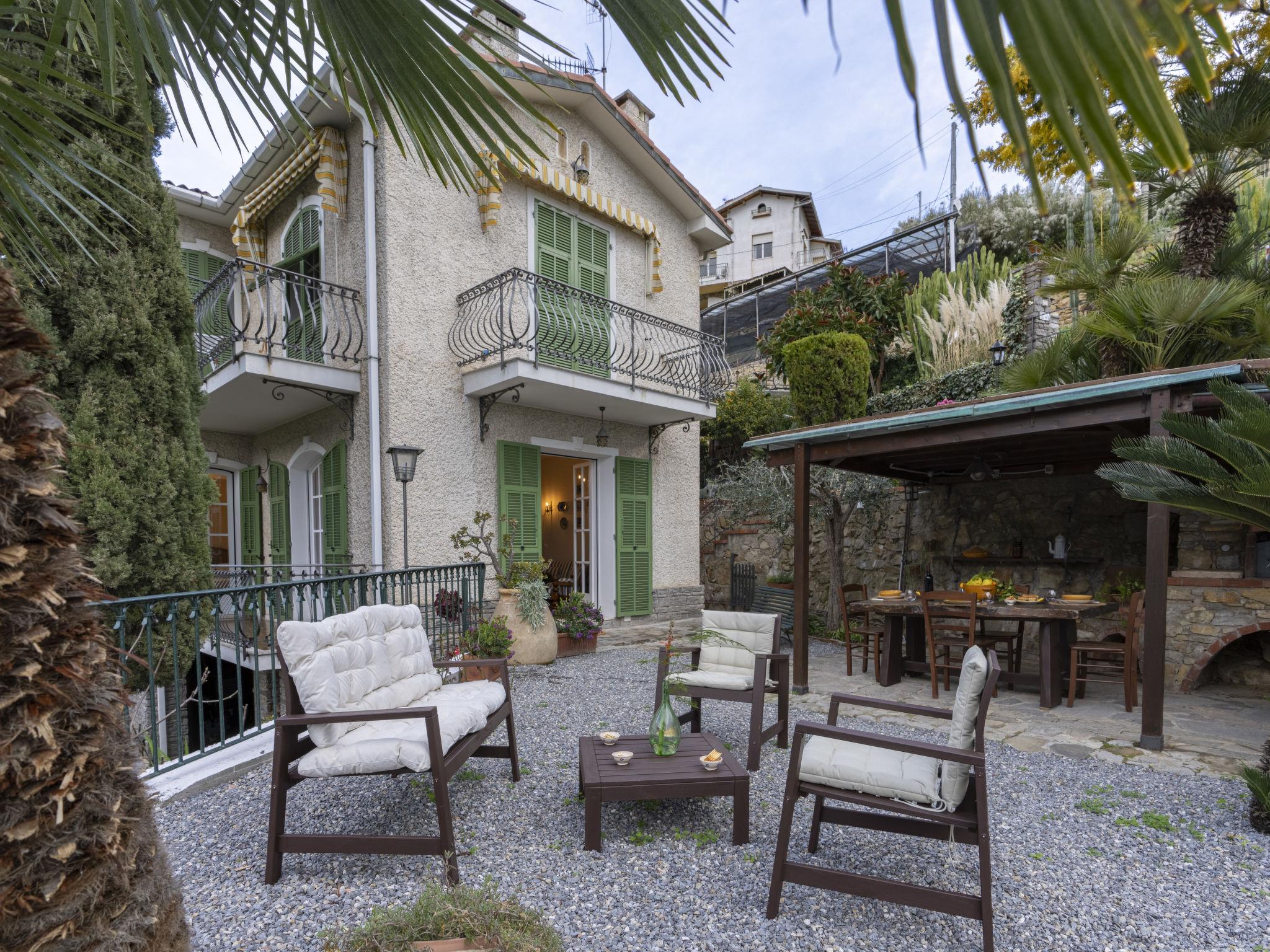 Very comfortable 2-family house terraced. 700 m from the centre of Bordighera, 4 km from the centre of Ospedaletti, 9 km from the centre of Sanremo, on a slope, 450 m from the sea. Private: terraced garden (fenced). Linen change (suppl. charge extra). Towel change (suppl. charge extra). Room cleaning on request (extra). 200 m long motor access to the house. Width of access road: 230 cm. Parking at the house. Supermarket 600 m, restaurant, bar 400 m, bicycle rental 700 m, bus stop 300 m, railway station "Bordighera" 2 km, pebble beach 450 m. Cycle lane 350 m.
