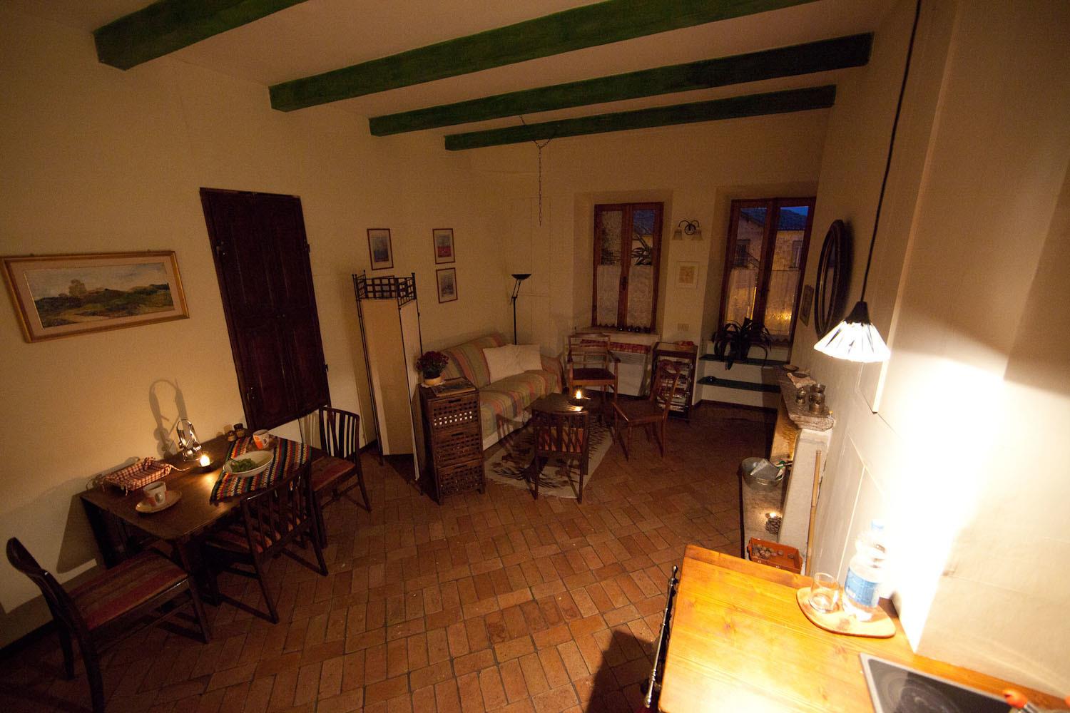 Al primo piano due finestre si affacciano sulla piazzetta ed illuminano lo spazio salotto con camino, zona pranzo, angolo cottura e un divano (letto).