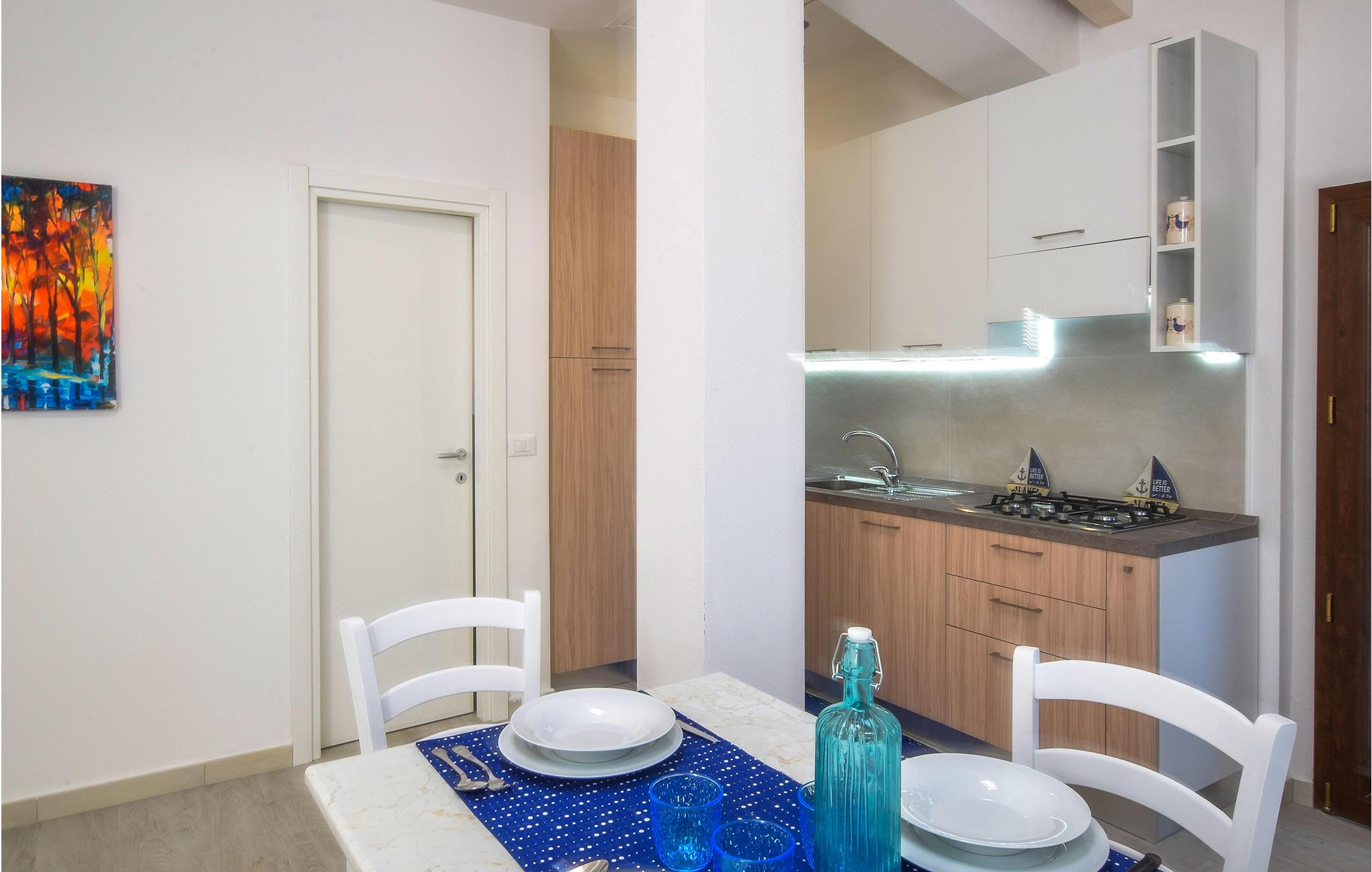 Dette lille, typisk italienske feriehus ligger kun få meter fra stranden. Kun en smal fyrreskov adskiller den halvoverdækkede terrasse fra det krystalklare vand, hvor I kan køle ned og plaske rundt med jeres børn. Klipperne er varme, så her kan I tørre i solen.