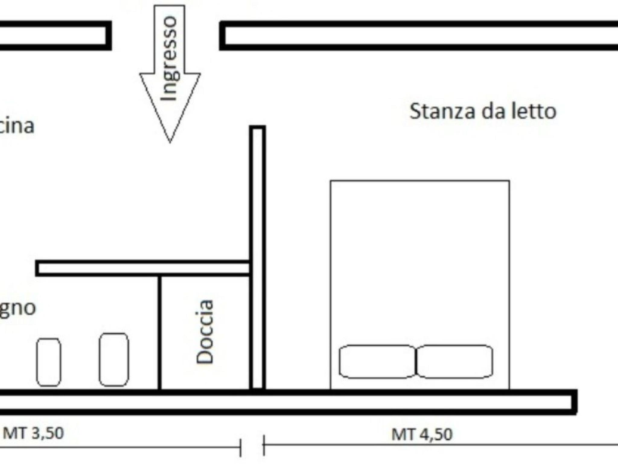 The accommodation measures approx. 50 square metres and consists of two double bedrooms, a living room with a simple kitchen and dining table, and a bathroom with bidet, shower and WC.