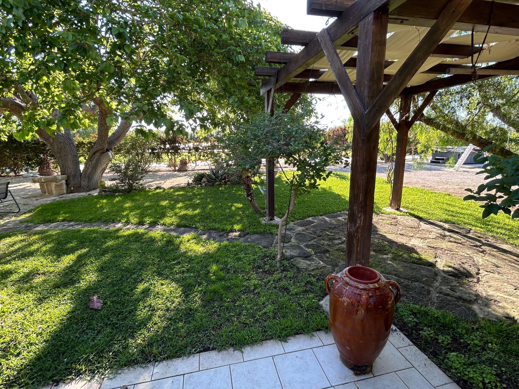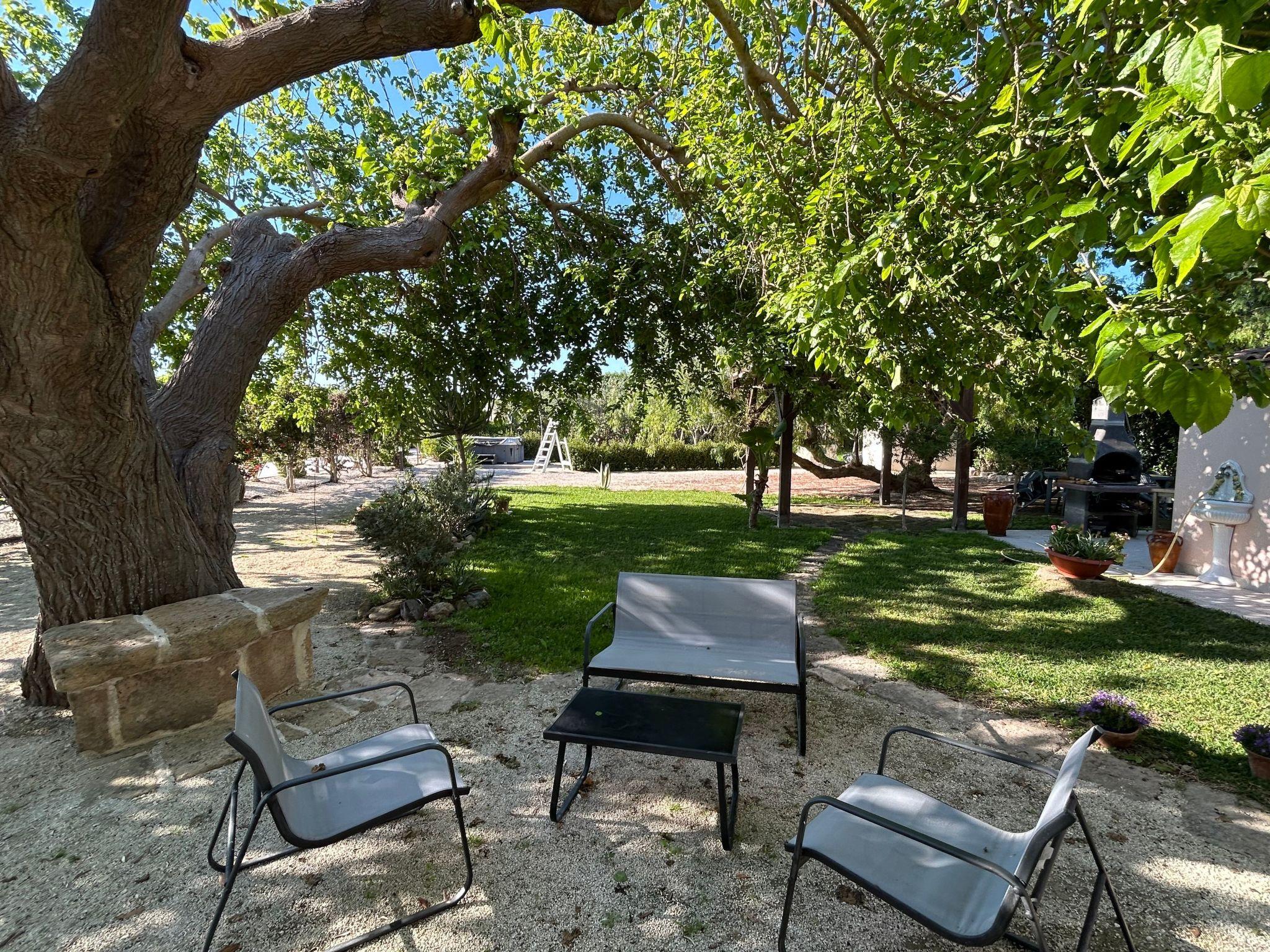 Guests on the first floor have access to a large, shaded veranda overlooking the countryside and a furnished gazebo that invites you to spend time outside. Guests upstairs share a barbecue and hot tub with seating for five in the garden, which is shaded by a century-old mulberry tree. Outside in a shed there is also a kitchen with washing machine and dishwasher, ideal if you want to eat outside.About 20 meters along the path leading to the Baglio is a large swimming pool (6 x 12 m) with an equipped sun terrace.In the garden of the Baglio guests can enjoy fruits and vegetables according to the season, and near the covered parking there is a charging station for electric vehicles. Fenced outdoor parking in front of the house