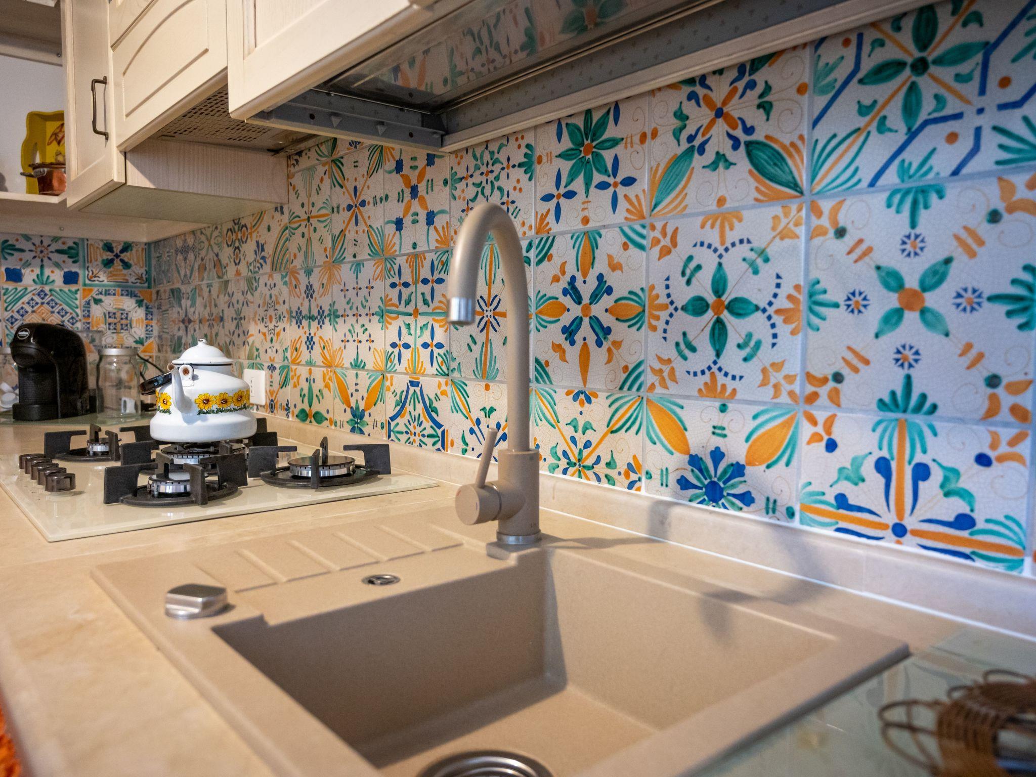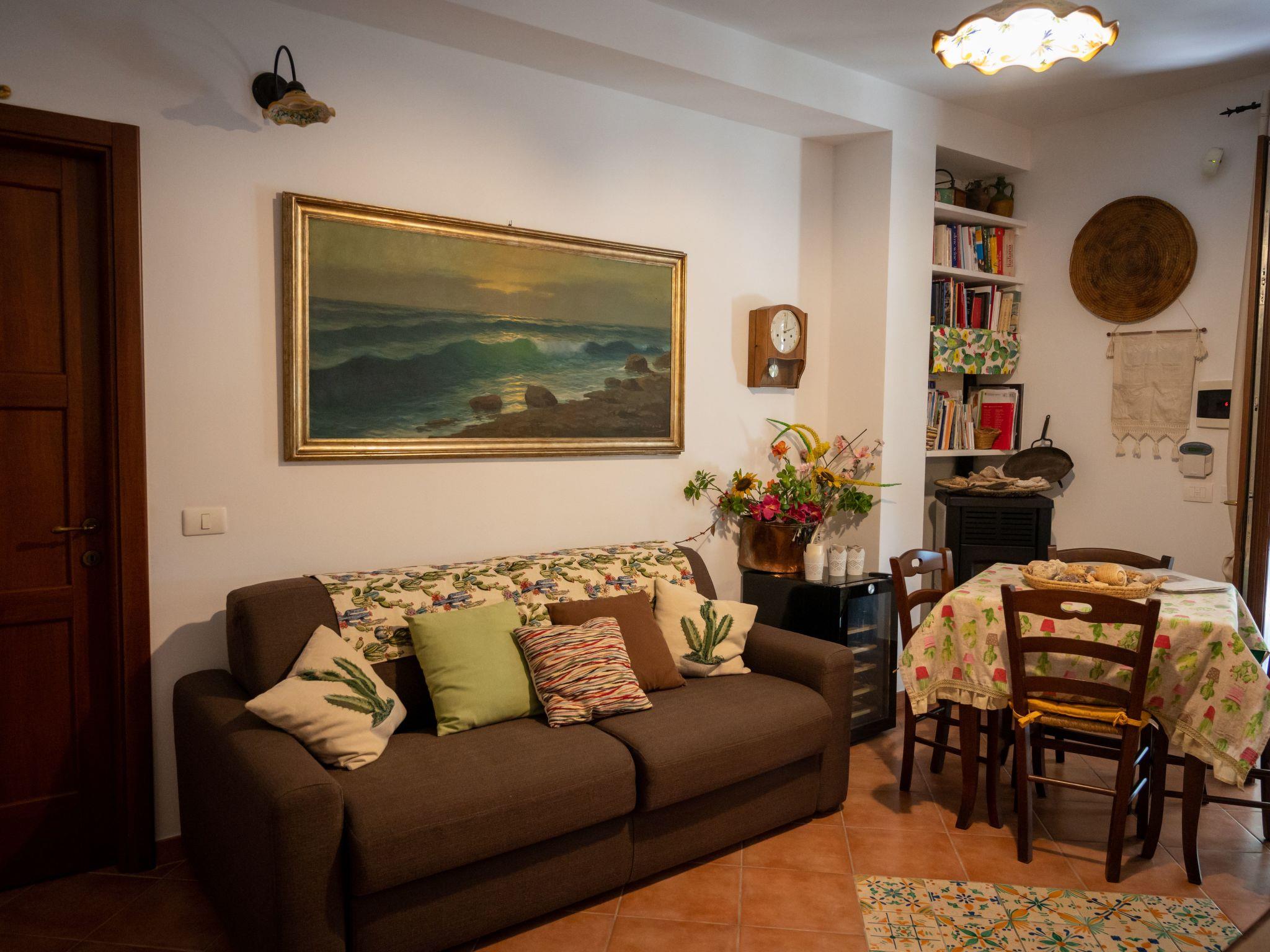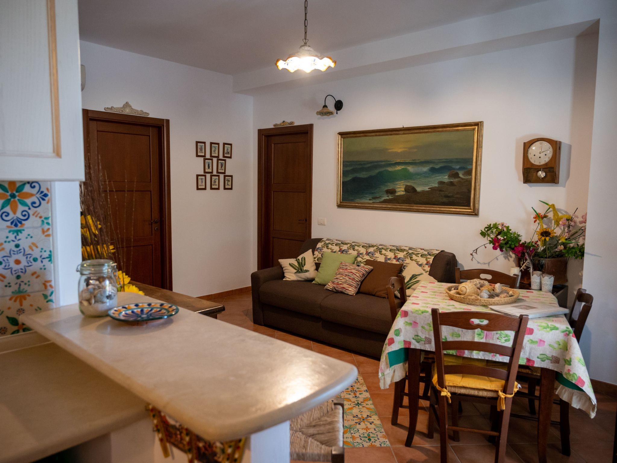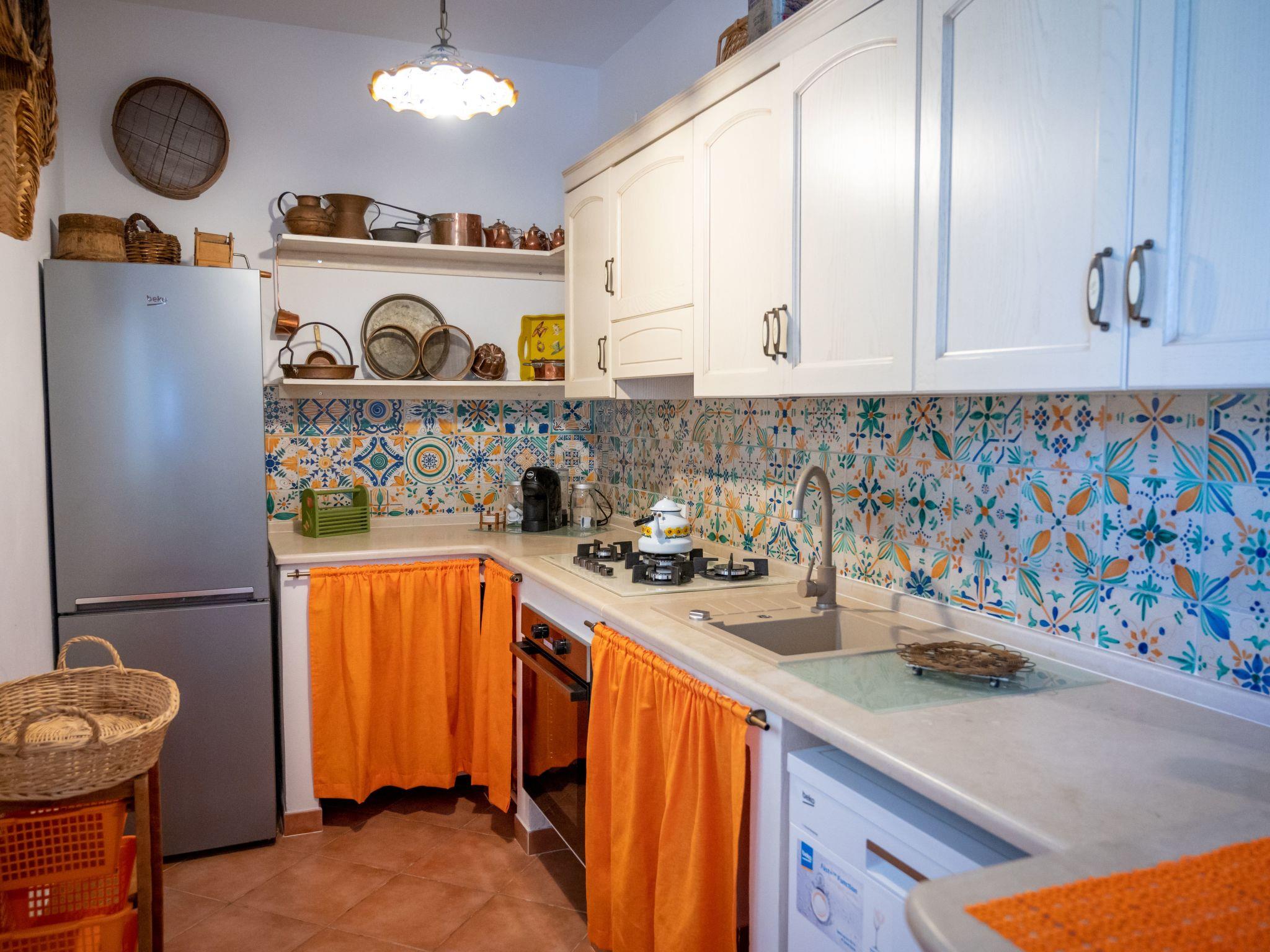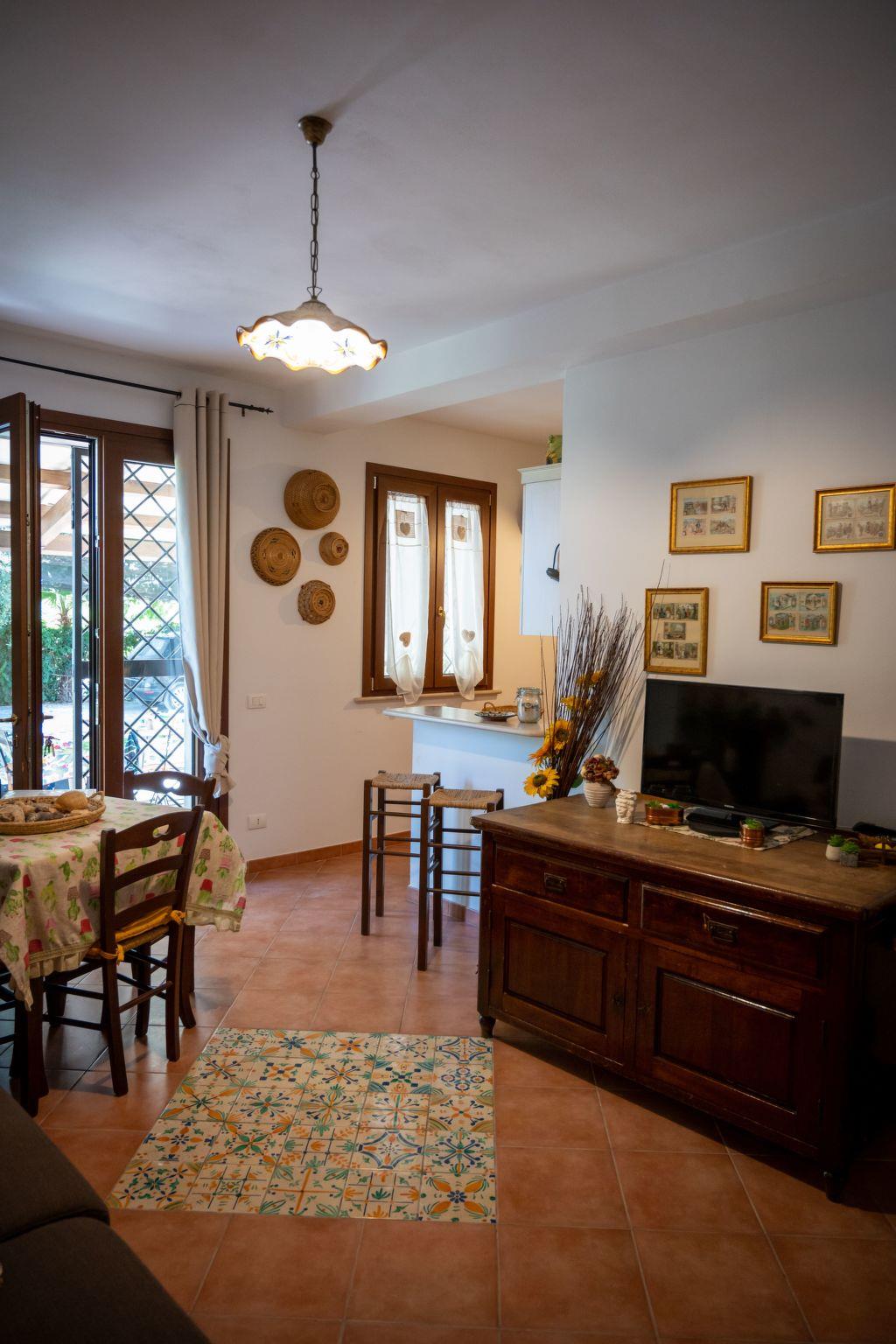 Apartment GelsoA large house of 100 sqm that can accommodate up to 8 people (2 on the sofa bed). It consists of a living area (dining and relaxation area), a well-equipped country kitchen with dishwasher, two double bedrooms and a twin bedroom. All bedrooms have private bathrooms and are equipped with air conditioning/heating. A comfortable double sofa bed in the living area can accommodate two additional guests. The wooden furniture, many of which are antiques, and the Santo Stefano di Camastra ceramics used for the furnishings, the warm orange tones, the wrought iron beds and the natural fabrics create a refined and cozy atmosphere, even in the simplicity of country life that this beautiful house exudes.