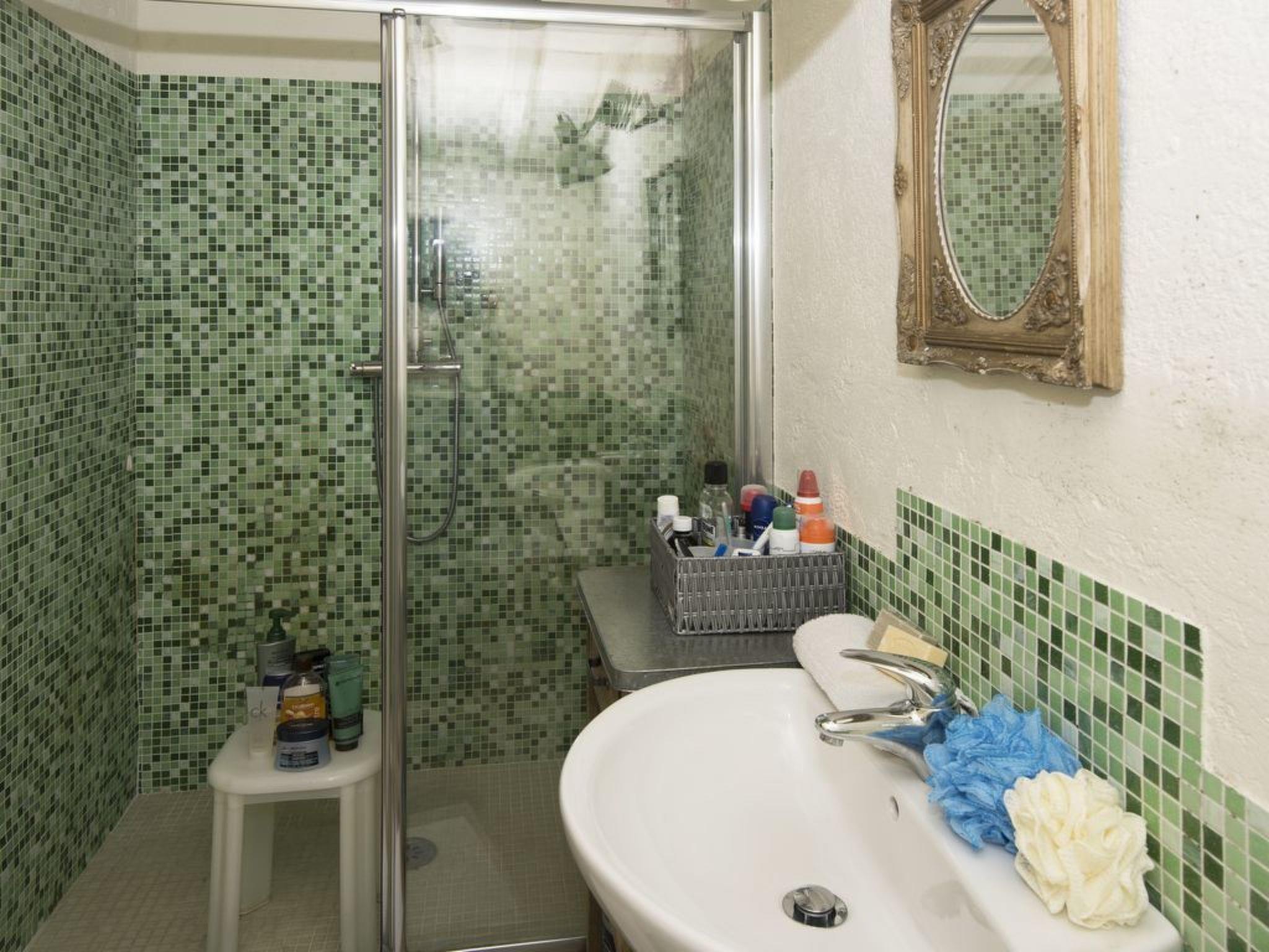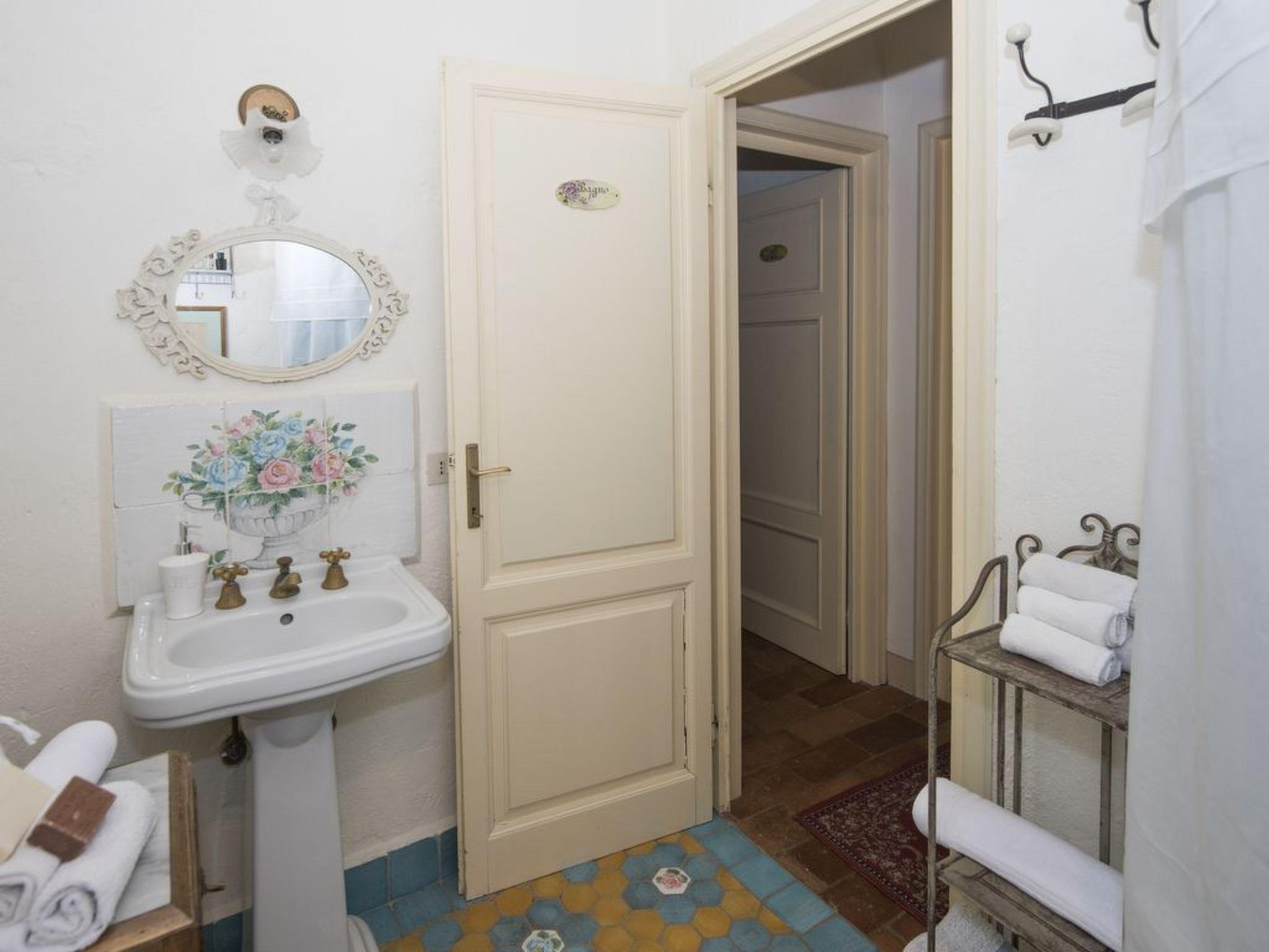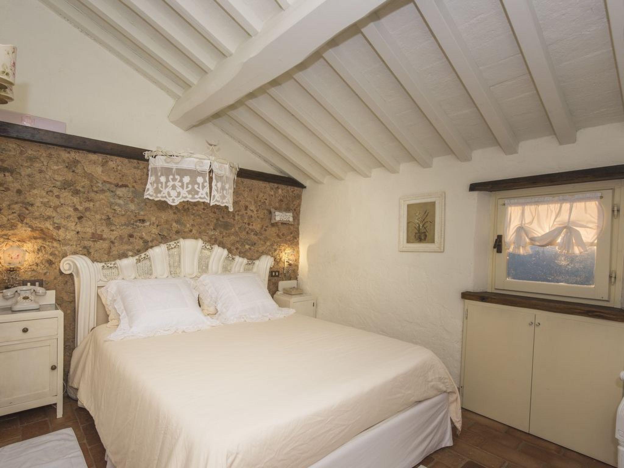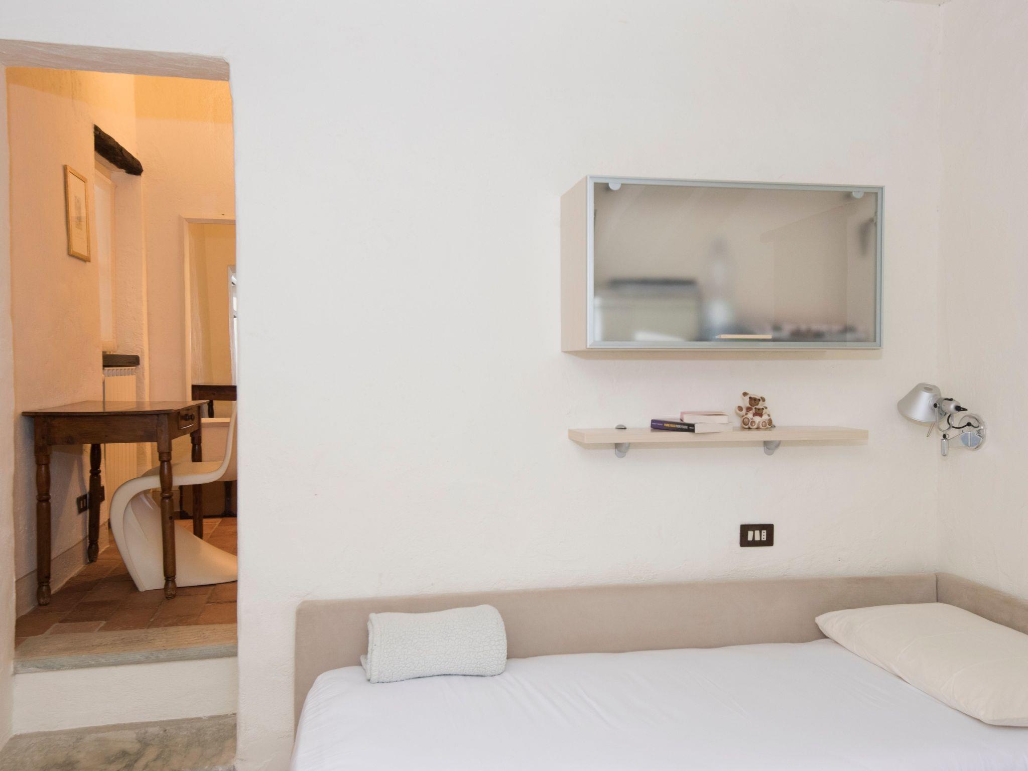 The day floor brick staircase leads to the sleeping area where there is a hallway opening to the master bedroom with antique stained bed headboard and behind it a beautiful reclaimed stone wall, small window, white wardrobe, en-suite bathroom with shower and hand tiled majolica floor tiles, walk in wardrobes, with stairs down to the twin bedroom and en-suite shower room.