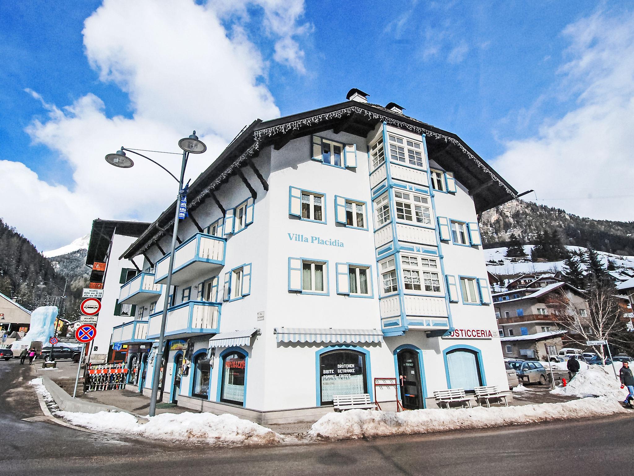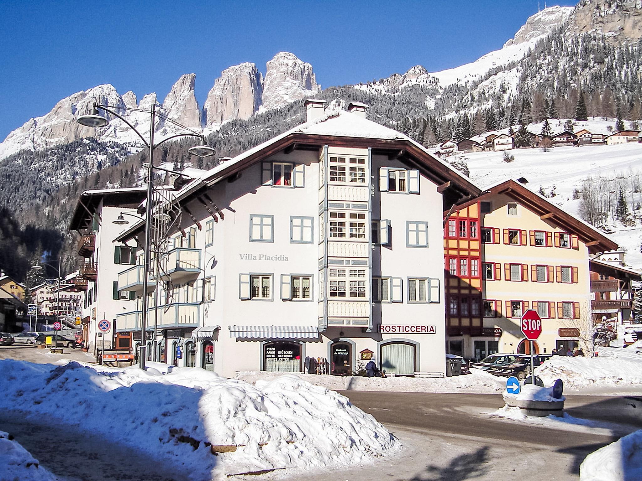 Beautiful, comfortable apartment house "Villa Placidia", 3 storeys, renovated. 11 apartments in the property. In the centre of Campitello 2 km from the centre of Canazei, in a busy, sunny position, 200 m from the skiing area, on a main road, south facing position. In the house: central heating system, heating available only from 01.Dec. - 01.May.. In Winter: please take snow chains. Public parking 500 m extra. Grocery 200 m, supermarket 500 m, restaurant, bar 200 m, bus stop 20 m. Chair lift 200 m, ski bus stop 20 m. Nearby attractions: Sella Ronda 400 m, Lago di Carezza 21 km.