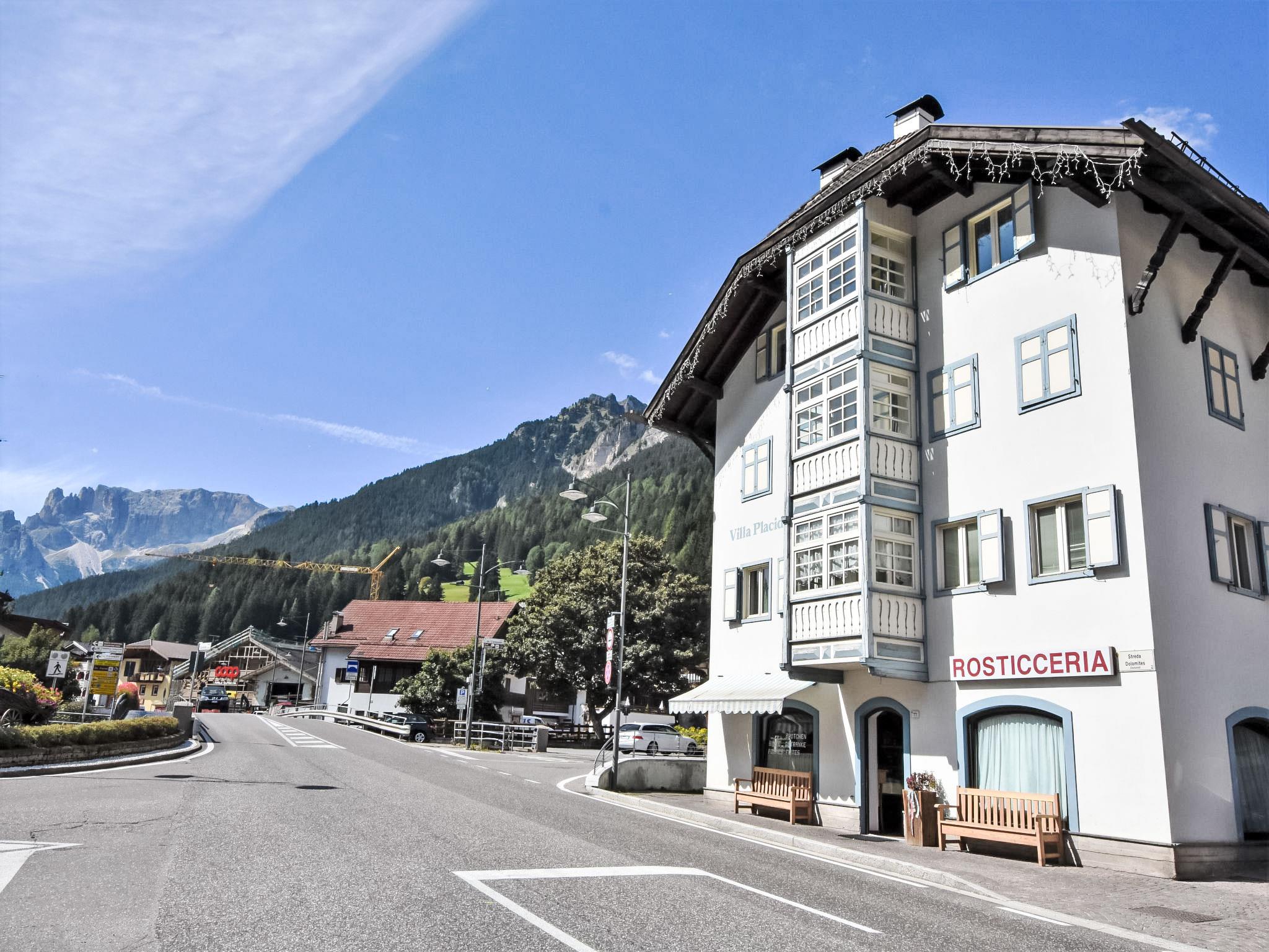 Beautiful, comfortable apartment house "Villa Placidia", 3 storeys, renovated. 11 apartments in the property. In the centre of Campitello 2 km from the centre of Canazei, in a busy, sunny position, 200 m from the skiing area, on a main road, south facing position. In the house: central heating system, heating available only from 01.Dec. - 01.May.. In Winter: please take snow chains. Public parking 500 m extra. Grocery 200 m, supermarket 500 m, restaurant, bar 200 m, bus stop 20 m. Chair lift 200 m, ski bus stop 20 m. Nearby attractions: Sella Ronda 400 m, Lago di Carezza 21 km.