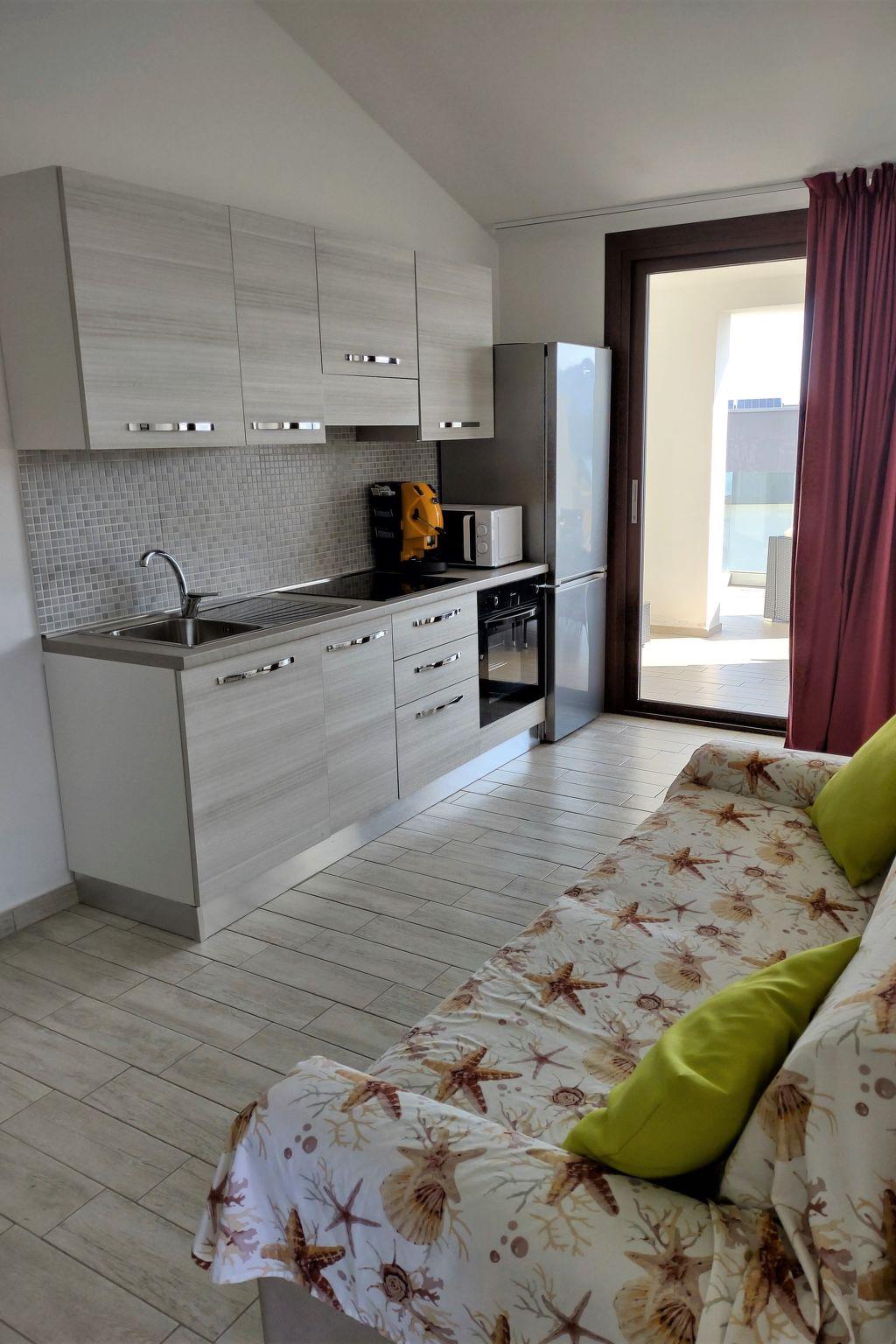 The flat has a sea-view terrace fully furnished with a sofa and armchairs of garden furniture, a sun umbrella and two sun loungers. On the terrace there is a table where you can have breakfast, lunch and dinner. The property is fenced off.