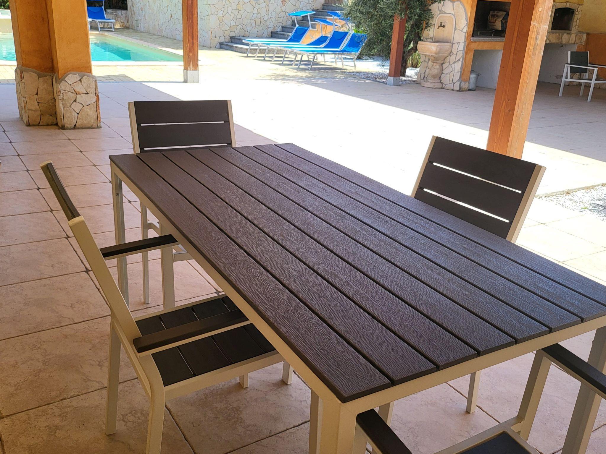 The garden is accessed directly from the house by exiting the living area through a very large sliding window. The pool has a rectangular shape with an internal bench at the head. It has a size of 10 m x 4.2 m and access is via 2 internal side stairs. It is lined with PVC and its depth varies from 1 m to 1.60 m. The sunbathing area and lawn are furnished with sun loungers.