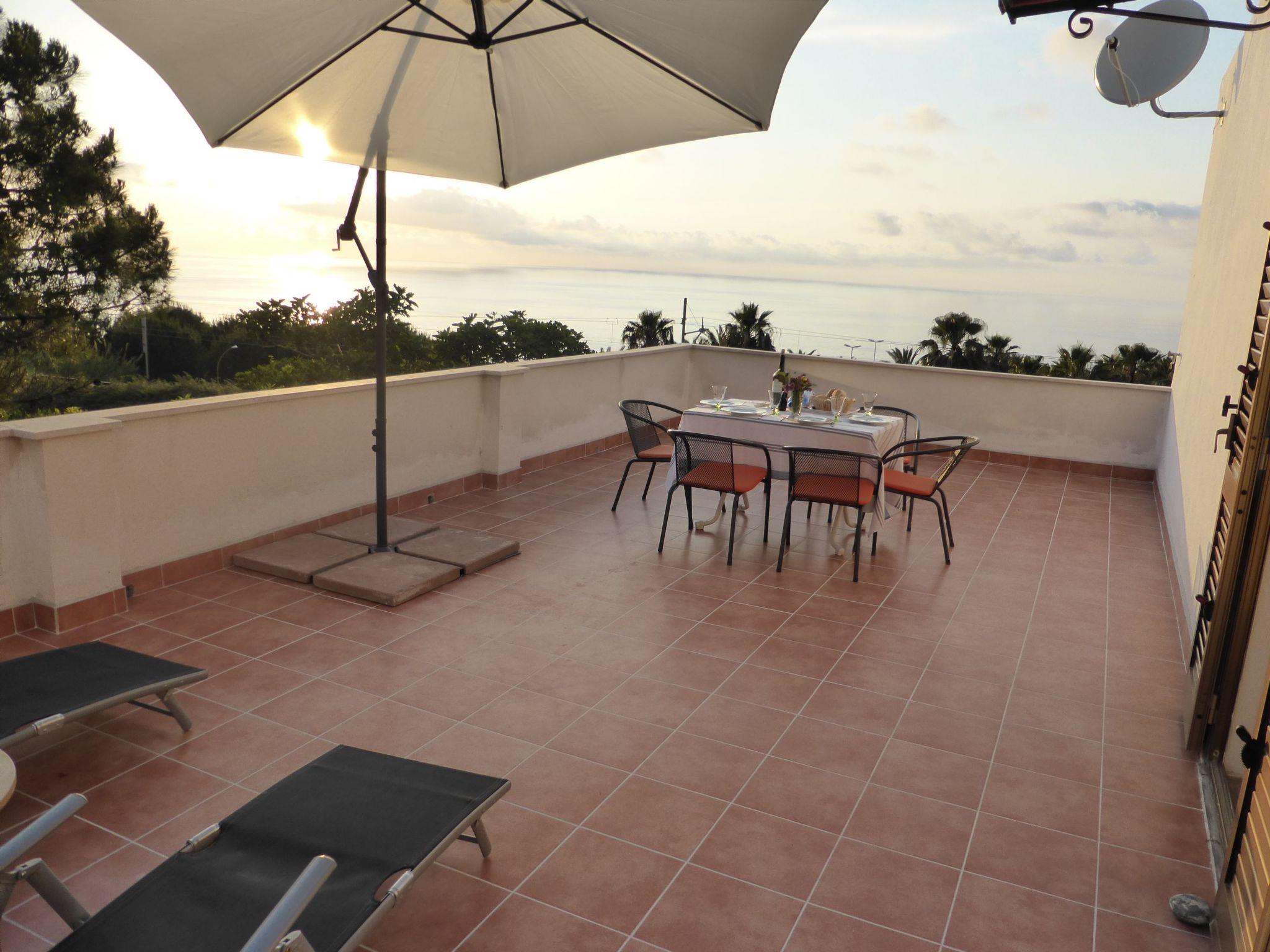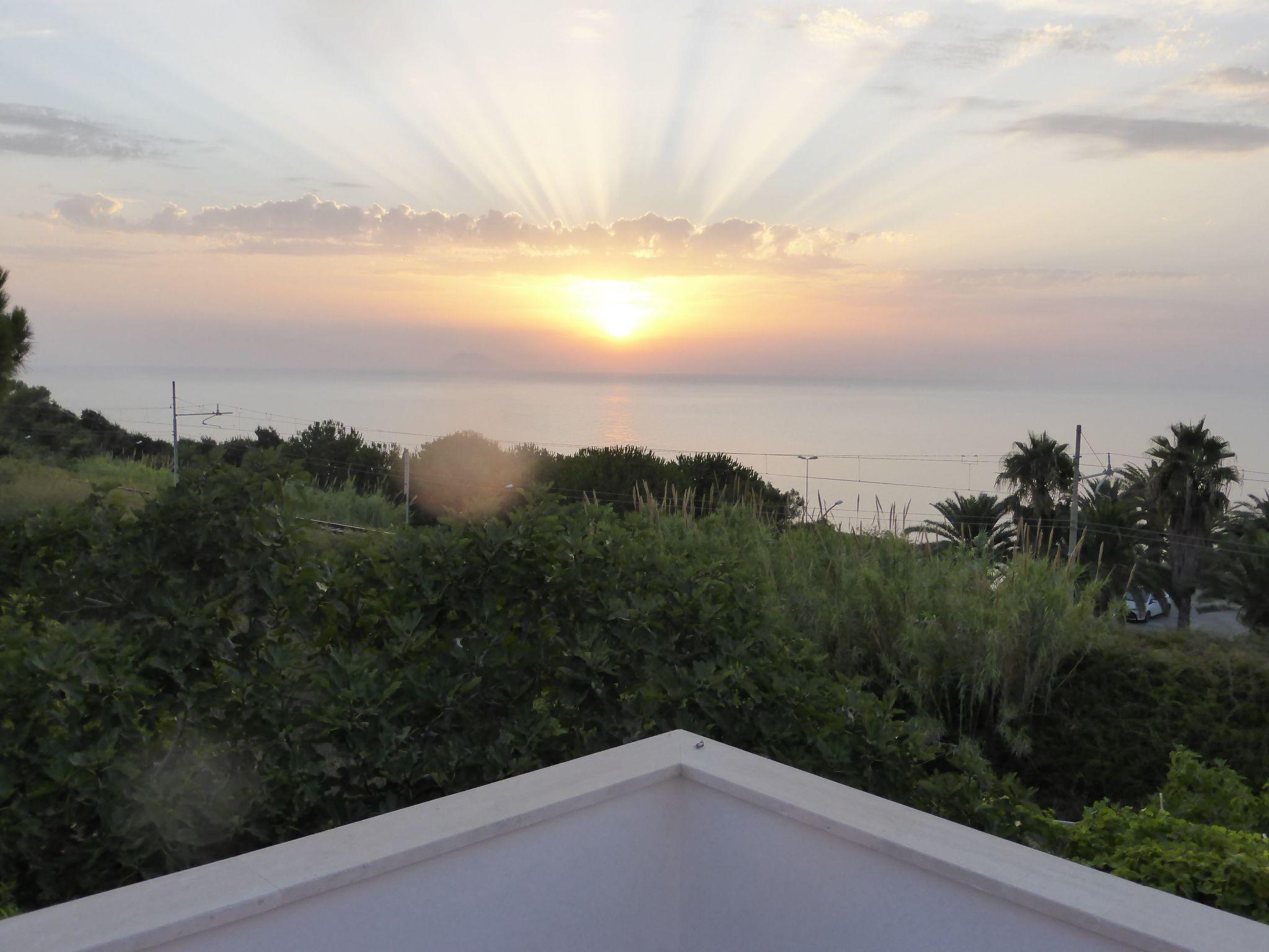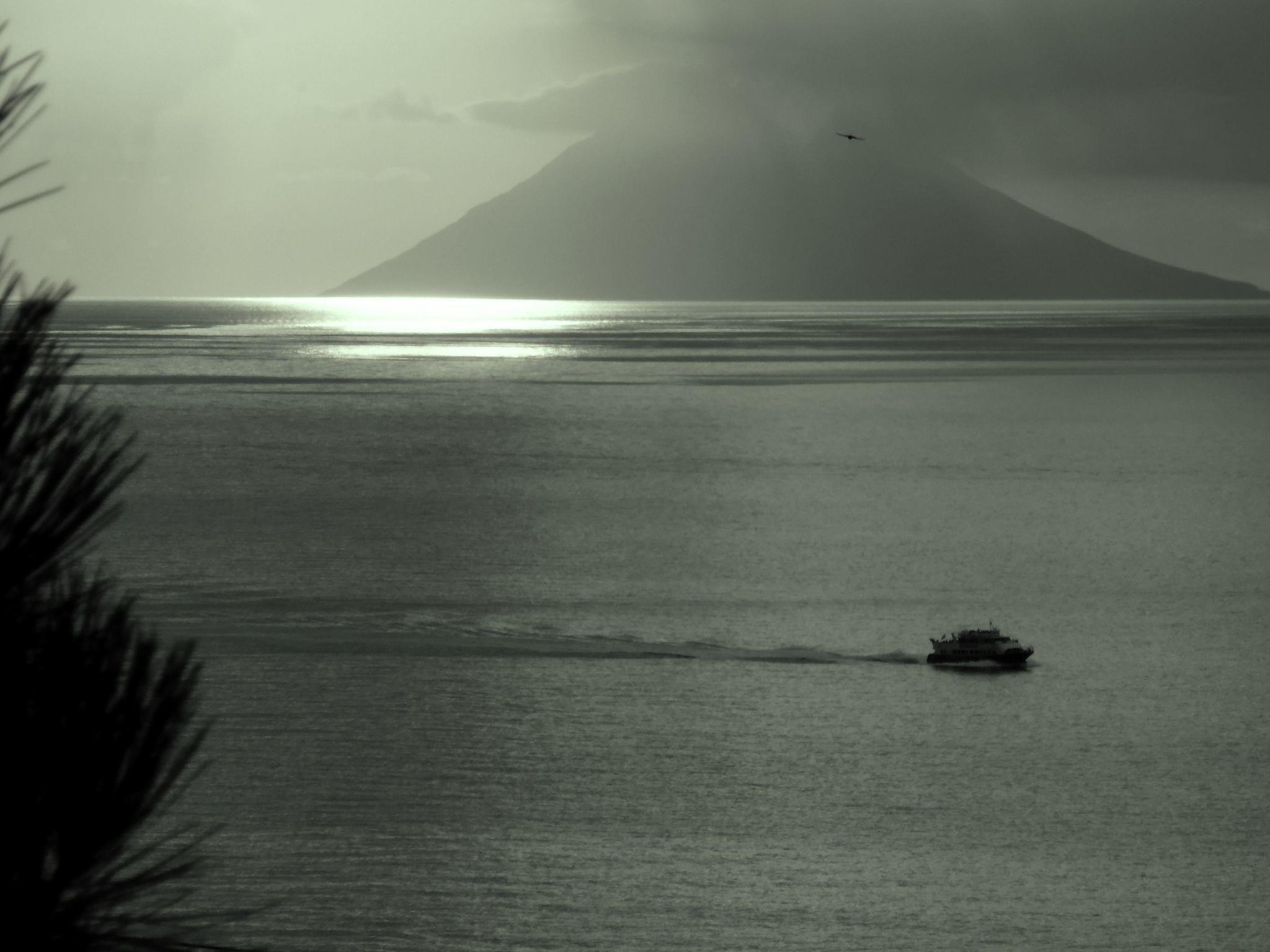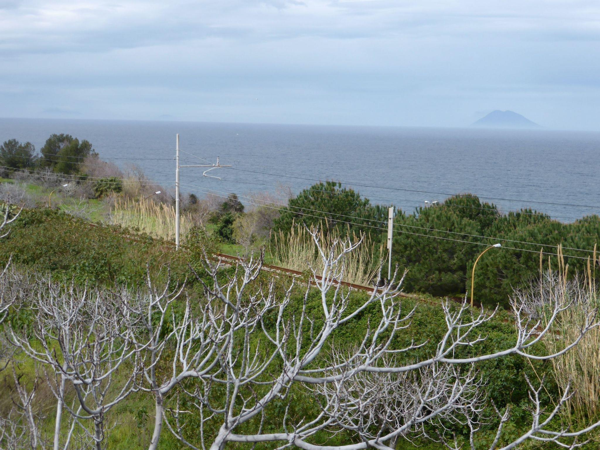 The ground floor has a living room with a kitchen, a kind of conservatory (with a TV), two bedrooms, a storage corner and stairs. The first floor comprises two bedrooms, a bathroom and the enormous terrace, of course with a view of the sea and Stromboli.