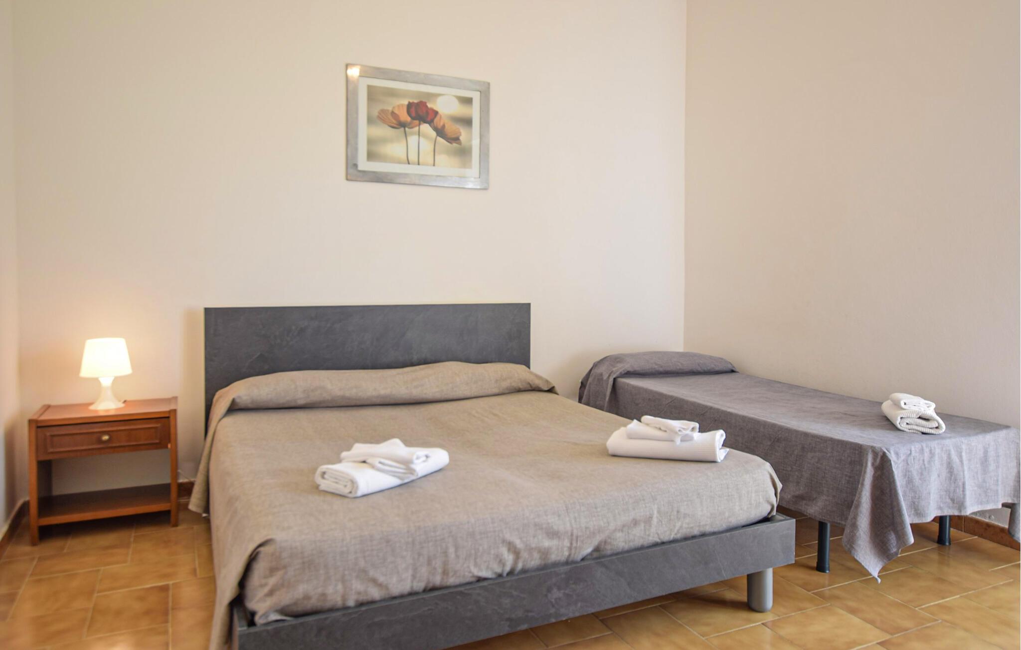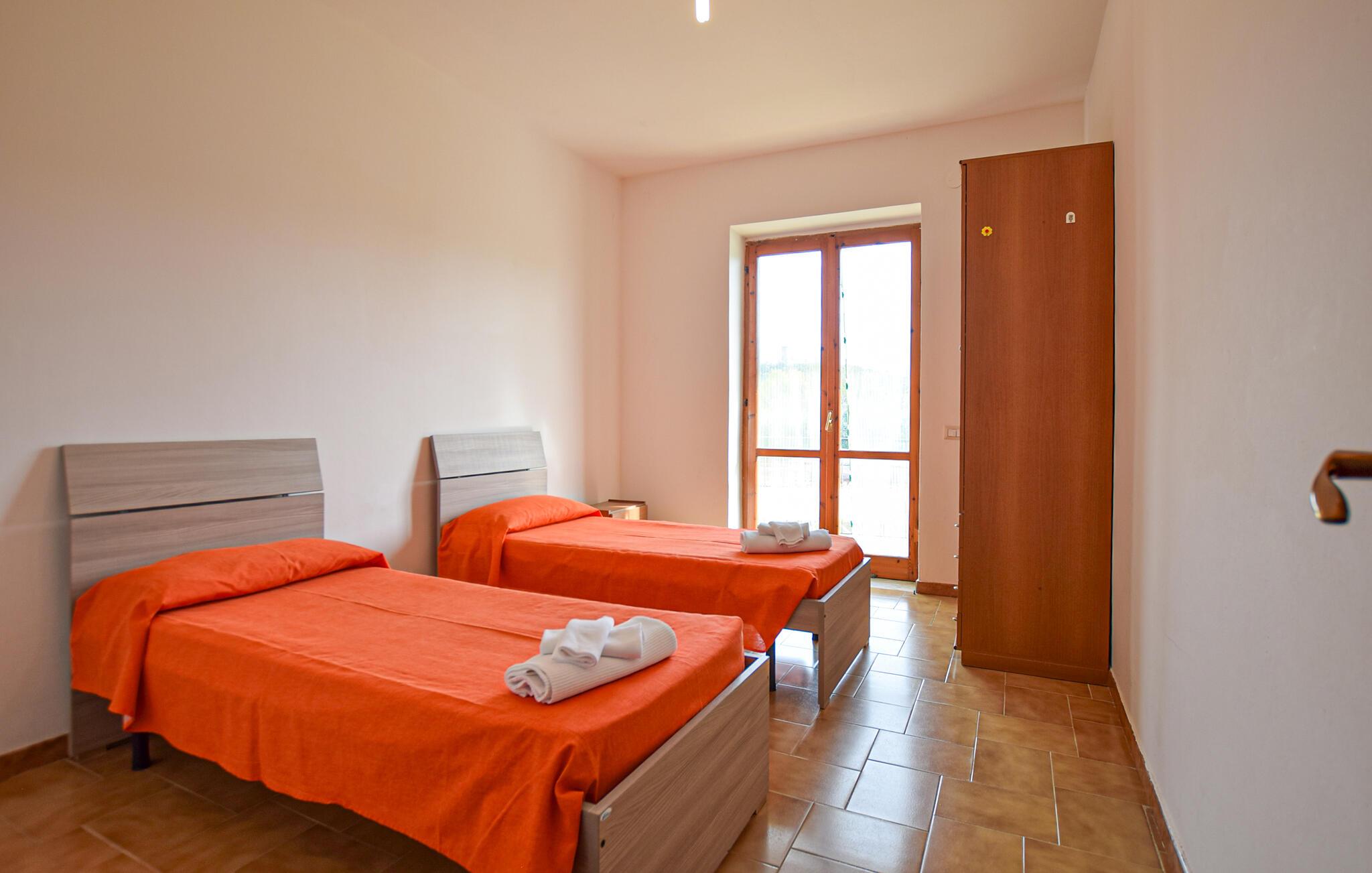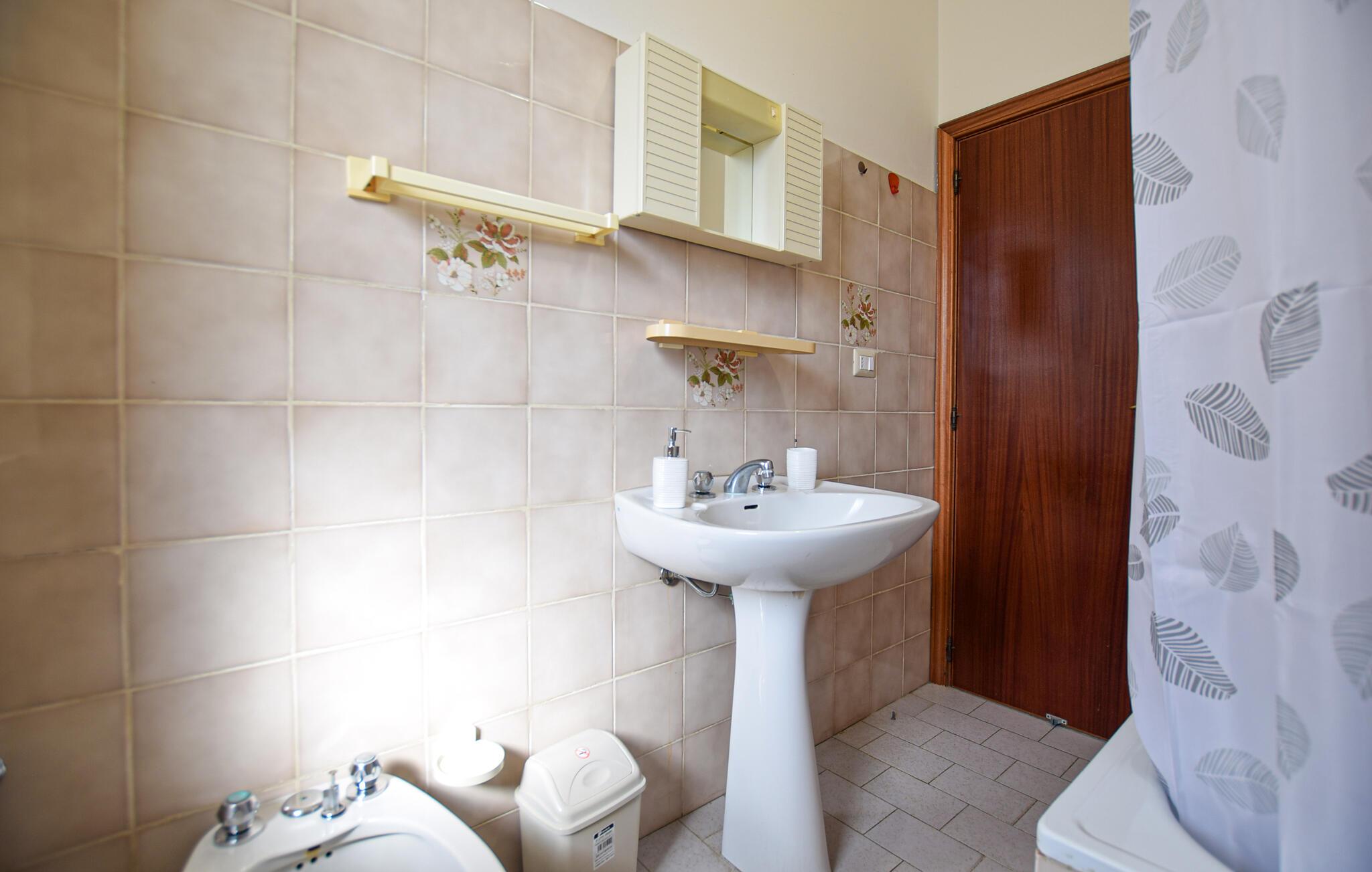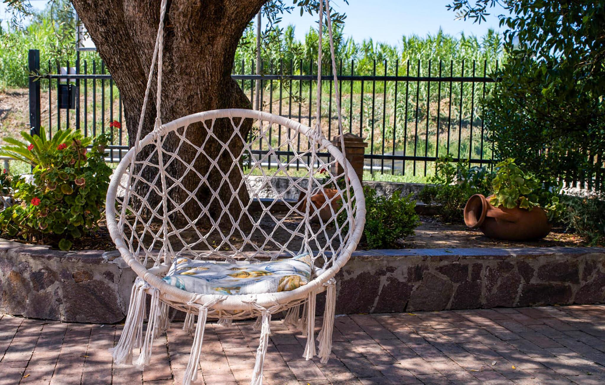 Oplev en afslappende ferie i denne ferielejlighed beliggende i frodige, grønne landskaber lige ved havet. Træd ind i opholdsstuen og mærk straks den indbydende, åbne atmosfære. Lav mad i det praktiske køkken med dets farverige flisemønster. Sæt jer ved spisebordet og nyd jeres måltider badet i naturligt lys. Bagefter kan I slappe af på sofaen eller gå ud på altanen for at beundre udsigten over olivenlunde og bølgende bakker. Gå ud i haven og læg hverdagen bag jer. Slap af på siddepladserne under træerne, mens børnene morer sig på legepladsen med rutsjebane og gynger. Brug den lille fodboldbane til en spontan kamp eller tilbered lækre måltider udenfor på grillen. Stranden ligger kun få meter væk, er let tilgængelig til fods og er også hundevenlig. Oplev Casal Velino og dens omgivelser. Tag på ture gennem olivenlundene, besøg det arkæologiske område Velia eller den charmerende kystby Acciaroli. Nyd lokale specialiteter såsom frisk fisk og olivenolie fra regionen. Oplev den uspolerede skønhed i Cilento Nationalpark og tilbring dage fyldt med solskin, natur og italiensk livsglæde.