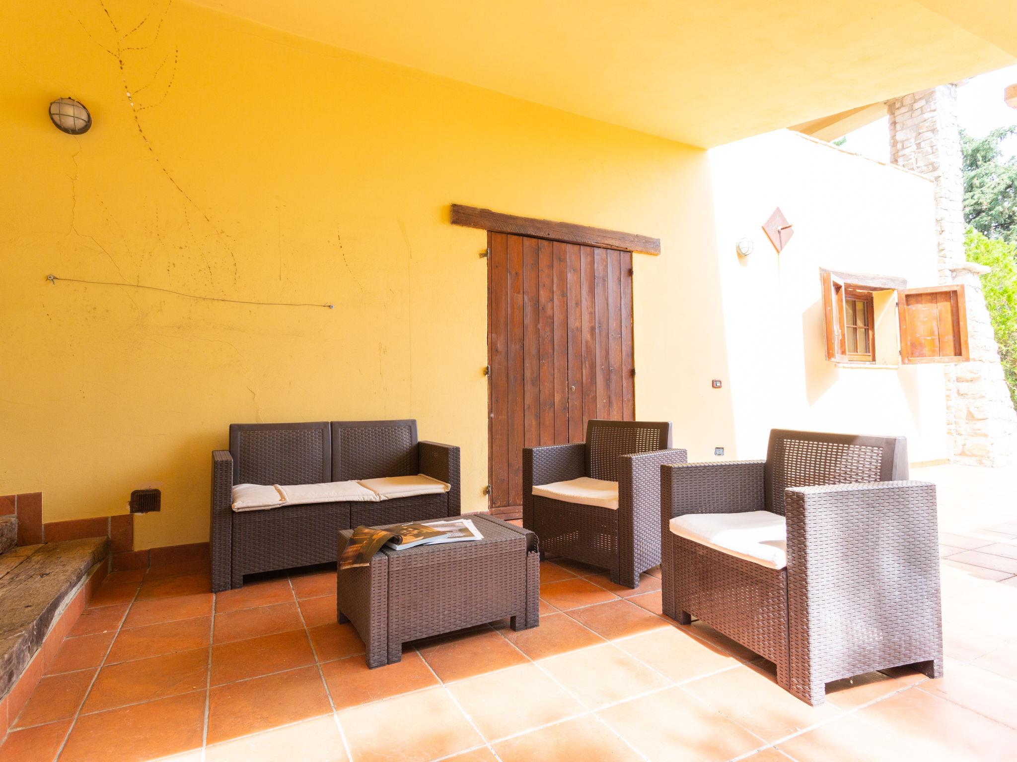"La Loggia (CAD100)", 3-room semi-detached house 80 m2 on 2 levels. Rustic and tasteful furnishings: open large living/dining room with open-hearth fireplace, dining table and TV. Exit to the terrace. 1 room with 1 french bed (160 cm). Kitchenette (4 gas rings, toaster, microwave). Upper floor: (open staircase), 1 room with 1 x 2 bunk beds, 1 french bed (160 cm). Exit to the terrace. Shower/WC. Gas heating. Terrace roofed. Terrace furniture. Facilities: Internet (WiFi, free). Please note: private entrance. IT069015B5K2Q836EH