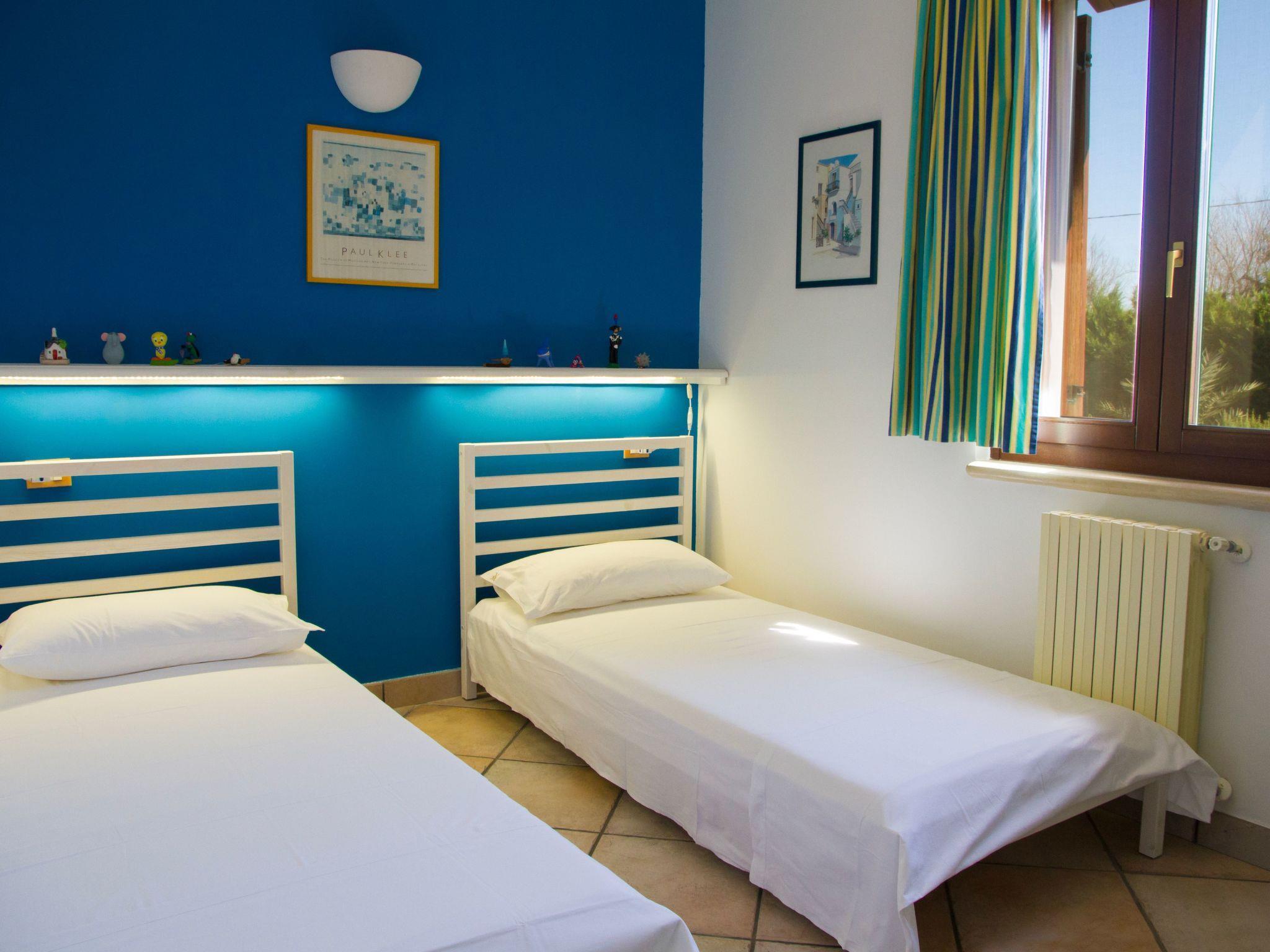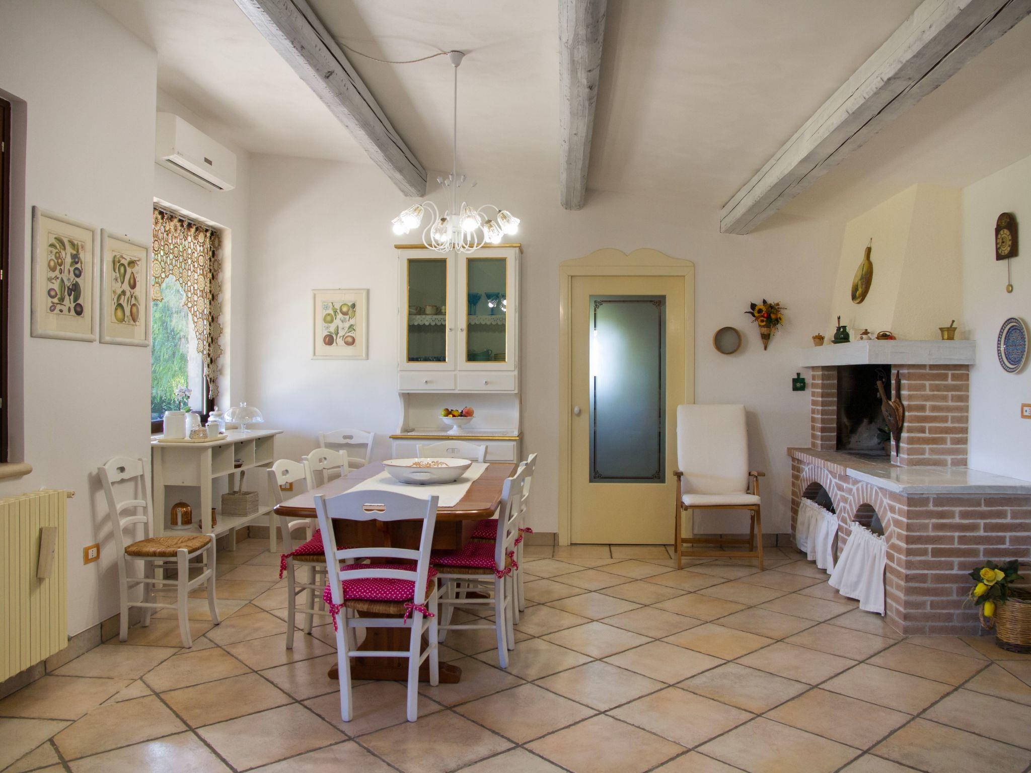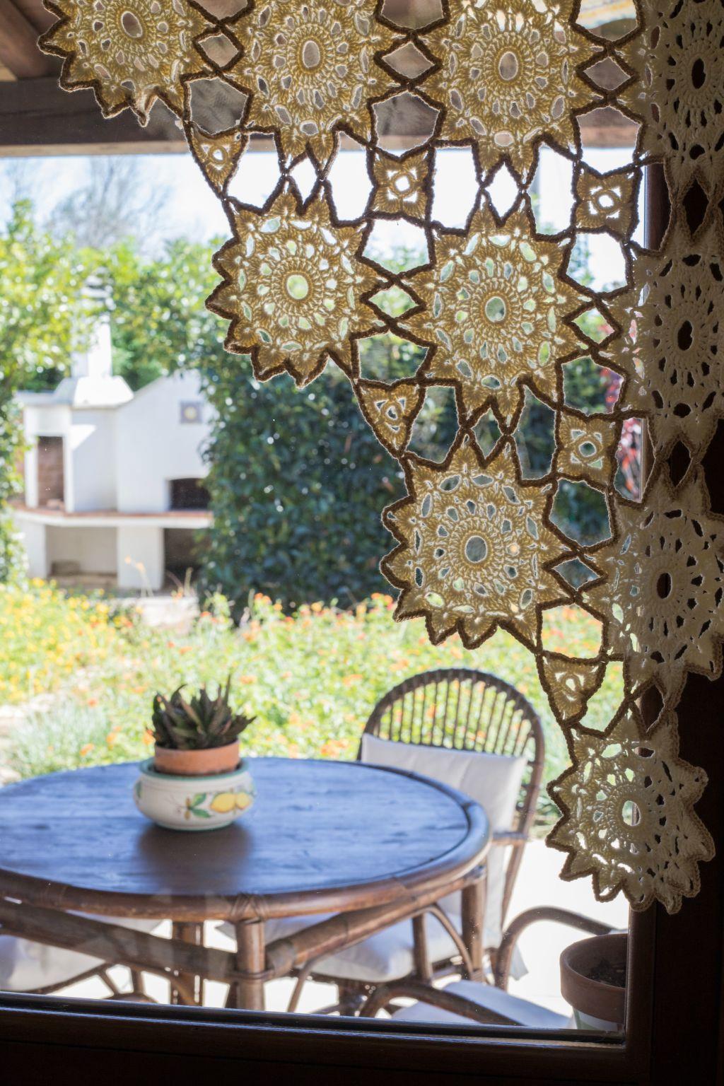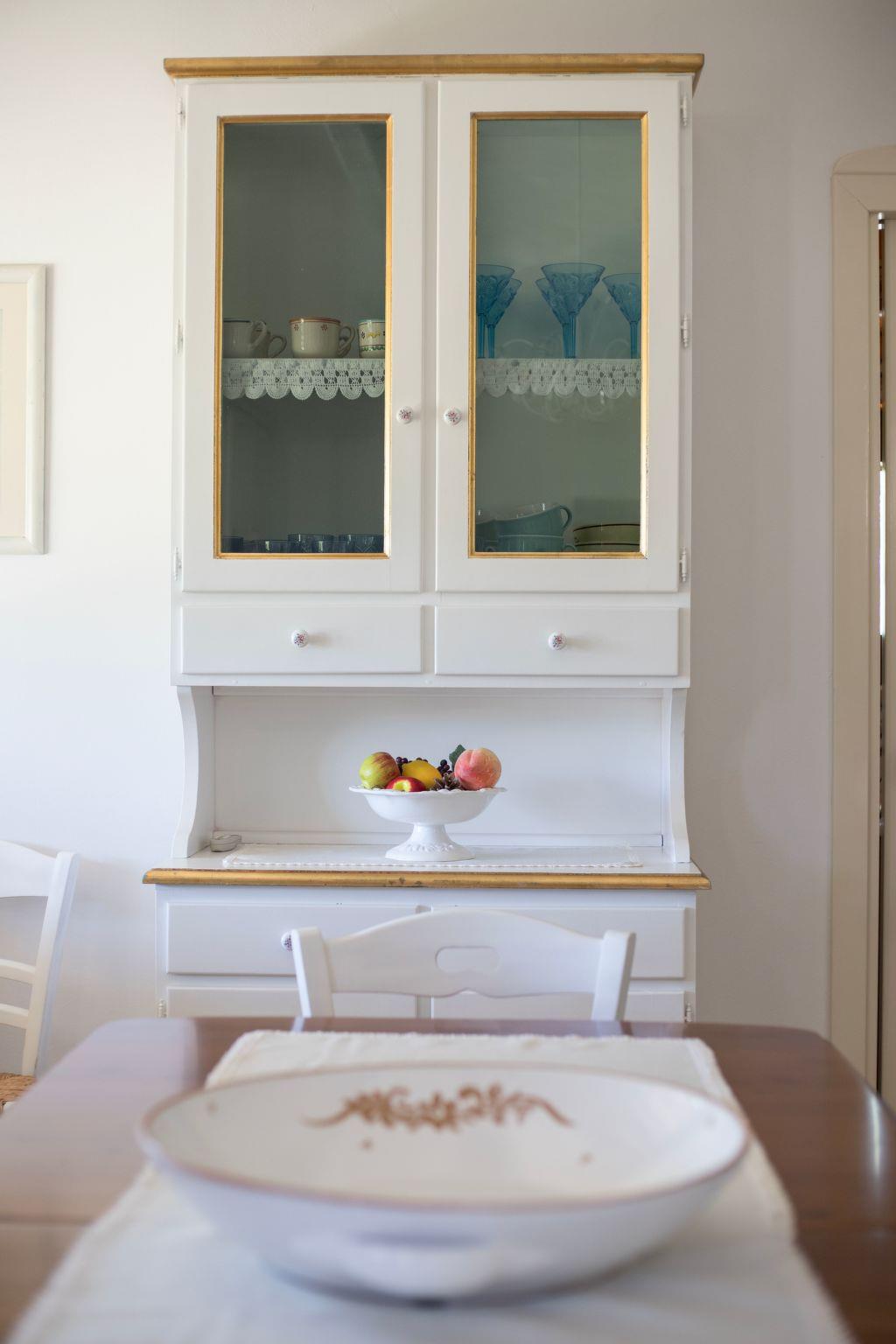 The house is on the ground floor and covers an area of about 140 square metres and is characterised by Mediterranean furnishings, where white dominates and offers its guests a feeling of complete relaxation and above all privacy. Large living room entrance with fireplace, dining table that can seat up to 16 people, relaxation area with stereo system for listening to music, digital terrestrial TV, bookcase with reading texts and a collection of comics for the little ones. The kitchenette is equipped with a gas hob, electric oven, dishwasher, refrigerator, microwave oven and other kitchen utensils, cutlery and pans. The master bedroom with a double bed has its own bathroom. There is also a bedroom with two beds (can be made into a double bed on request) and a bedroom with two bunk beds. The second bathroom is shared between the latter two rooms. All windows are fitted with mosquito nets. Only on request (separate cost to be requested on site) is it possible to book the cook for the preparation of tasty and delicate dishes of Salento/Mediterranean cuisine.